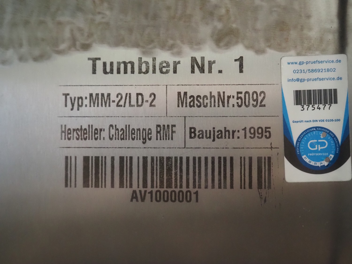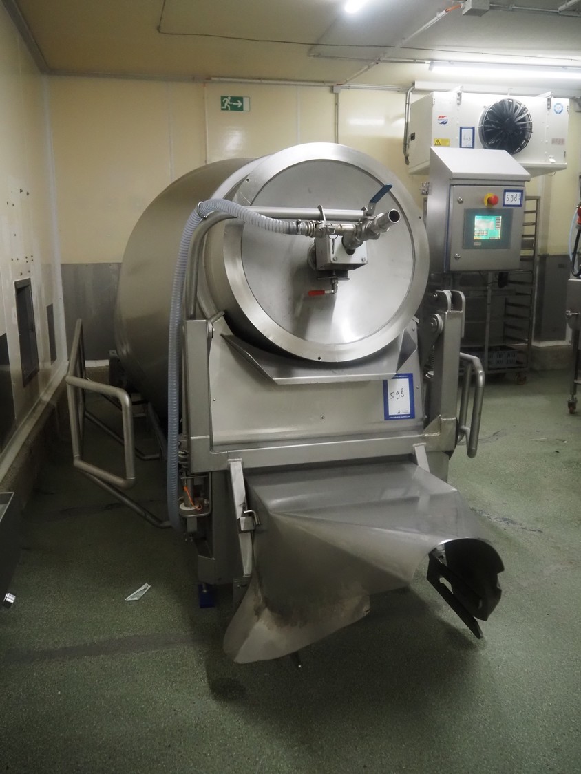 Challenge RMF vacuum tumbler with lifter for 200 liter meat bins, type: MM-2/LD-2, machine number: 5092, year of construction: 1995, dimensions drum: Ø 1300 mm x 2700 mm, Busch vacuum pump, model: KB 0040 D, year of construction: 2022, capacity: 40 m³ per hour, total dimensions: 4000 mm x 2050 mm x 1950 mm.