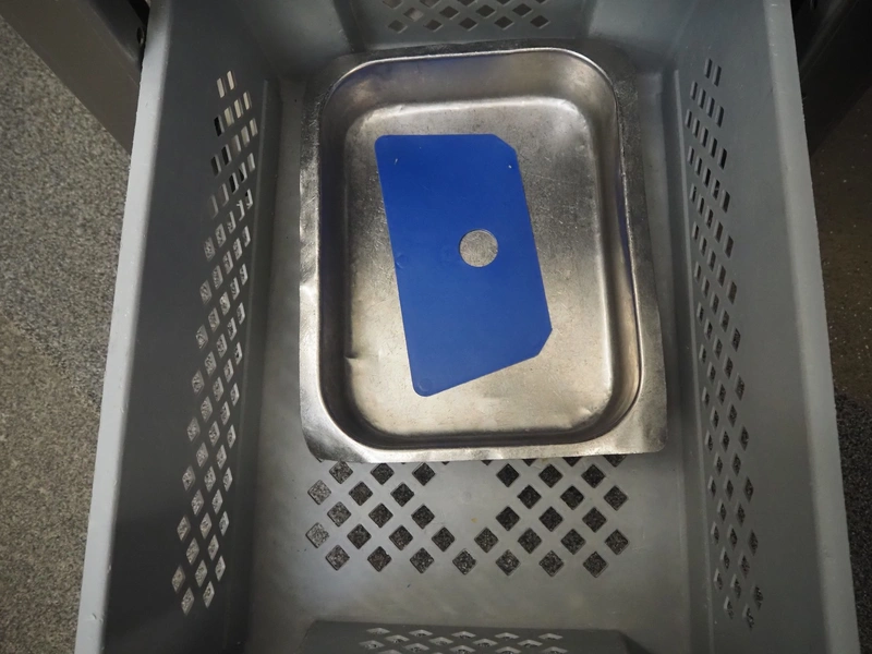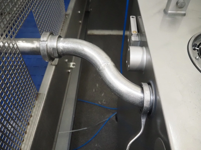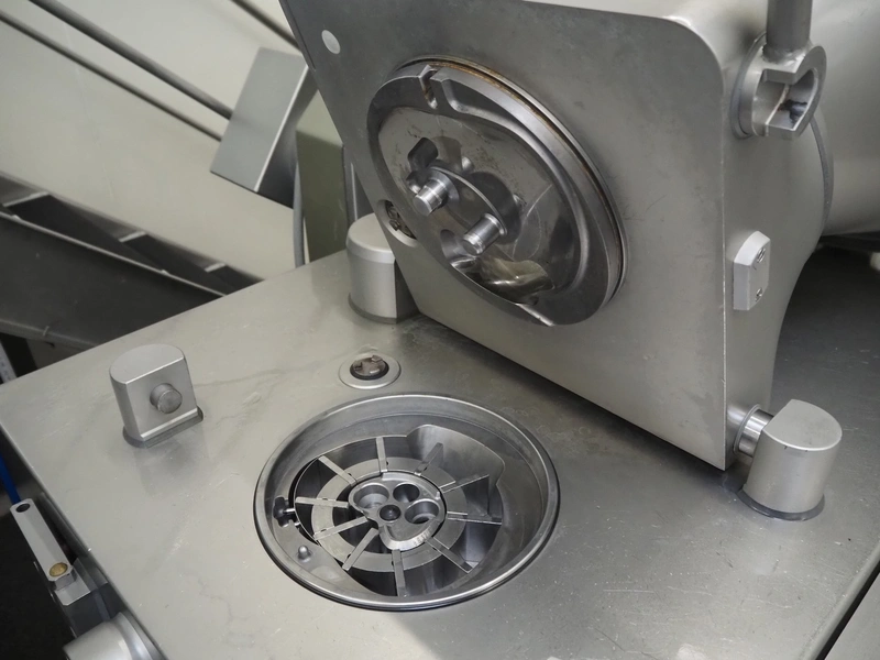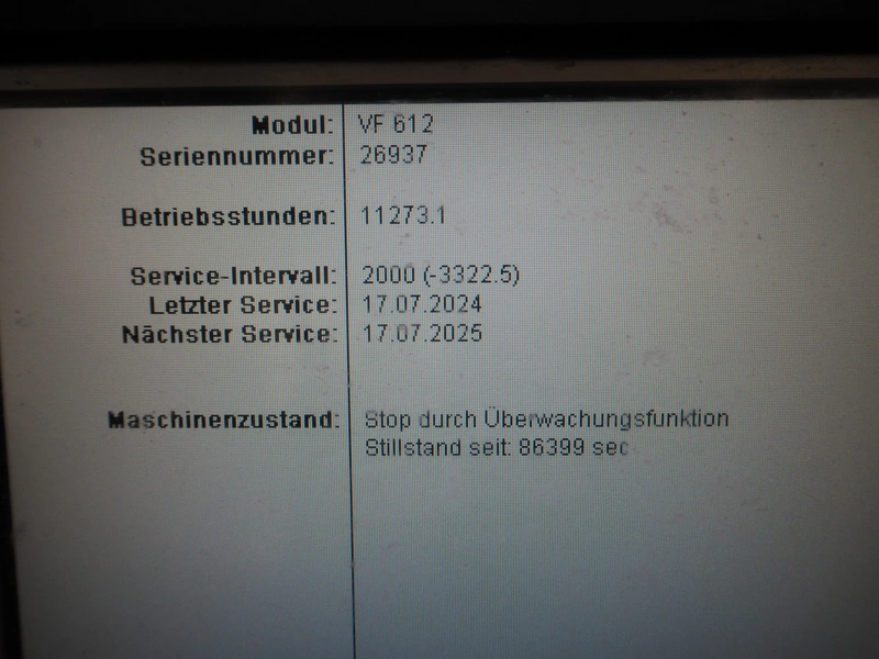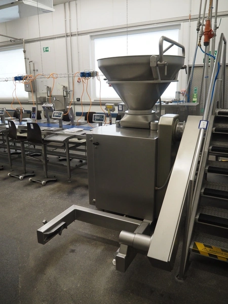 Handtmann vacuum filling machine with lifter for 200 liter meat bins and portioning device, type: VF612K, number: 26937, year of construction: 2009, 400 V, 3 Ph, 50 Hz, 6.5 A, 4.5 kW, operating hours: 11273.1 hours, Busch vacuum pump, type: KC 0016 E, capacity: 19 m³ per hour, s/s filling pipe and portioning device, dimensions: 1800 mm x 1300 mm x 1920 mm, s/s tool trolley, dimensions: 850 mm x 650 mm x 1000 mm.