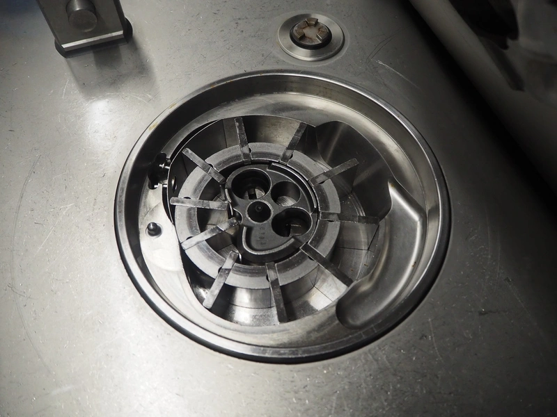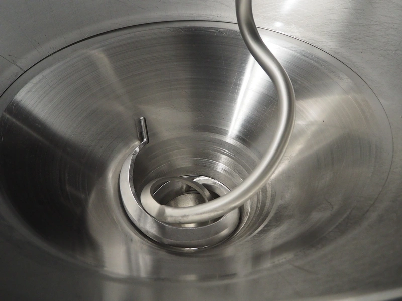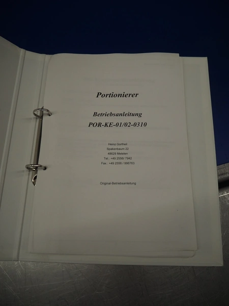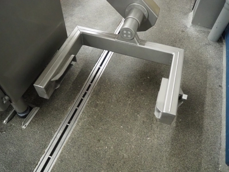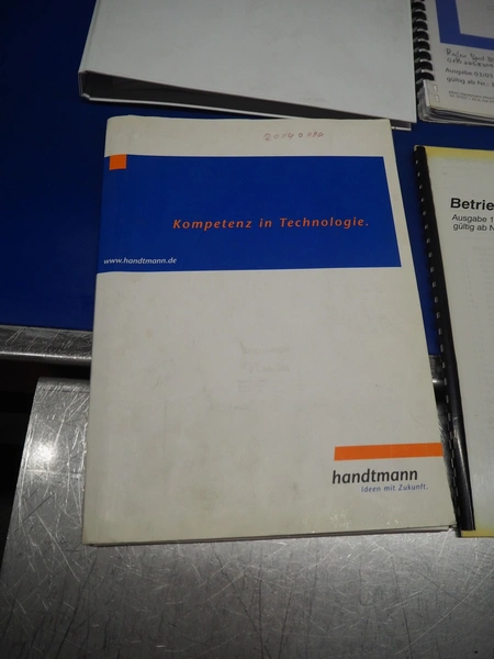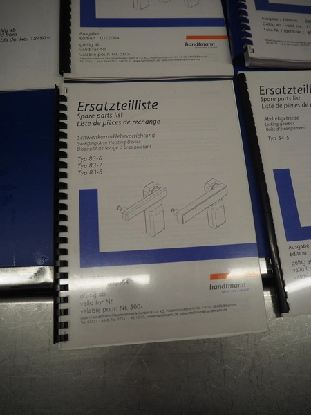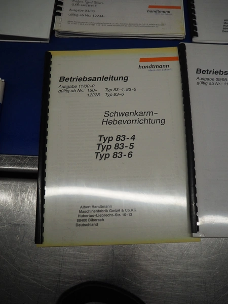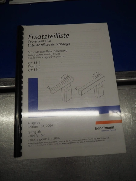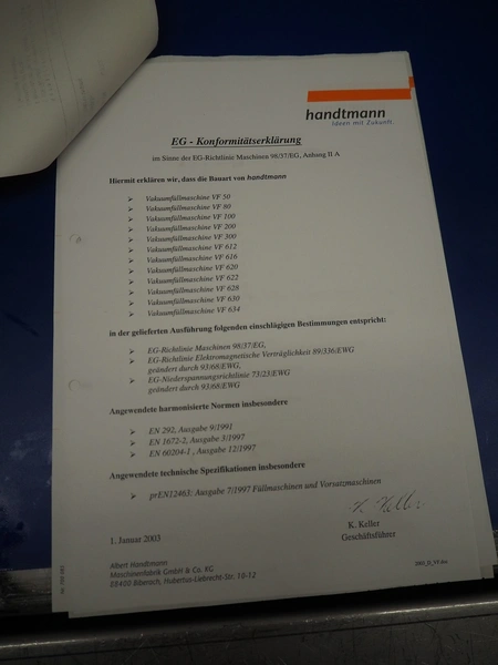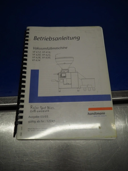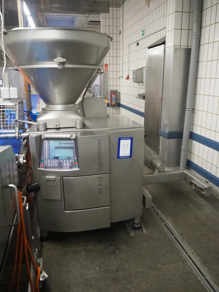 Handtmann vacuum filling machine with lifter for 200 liter meat bins and portioning device, type: VF616, number: 16798, year of construction: 2003, 400 V, 3 Ph, 50 Hz, 8.7 A, 6 kW, Busch vacuum pump, type: KC 0016 E 3Z0, number: 120028941, capacity: 16 m³ per hour, s/s filling pipe and portioning device, dimensions: 2100 mm x 1400 mm x 1910 mm, s/s tool trolley, dimensions: 1000 mm x 700 mm x 1200 mm.