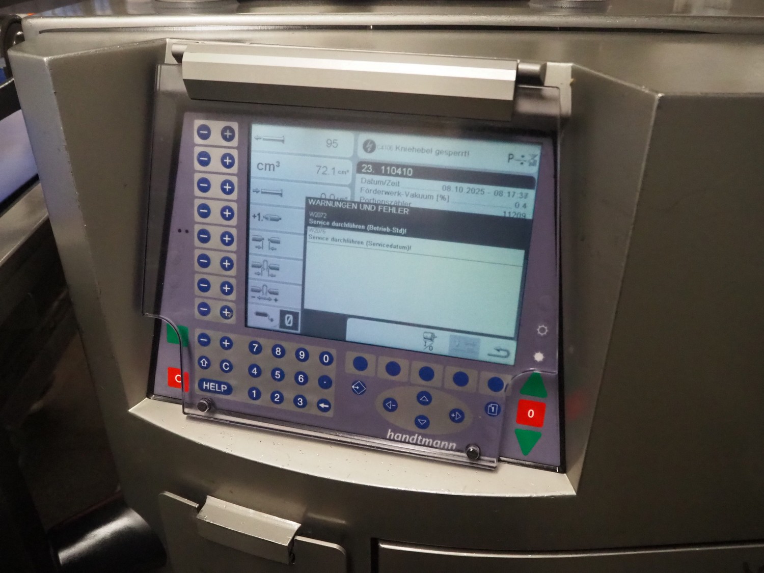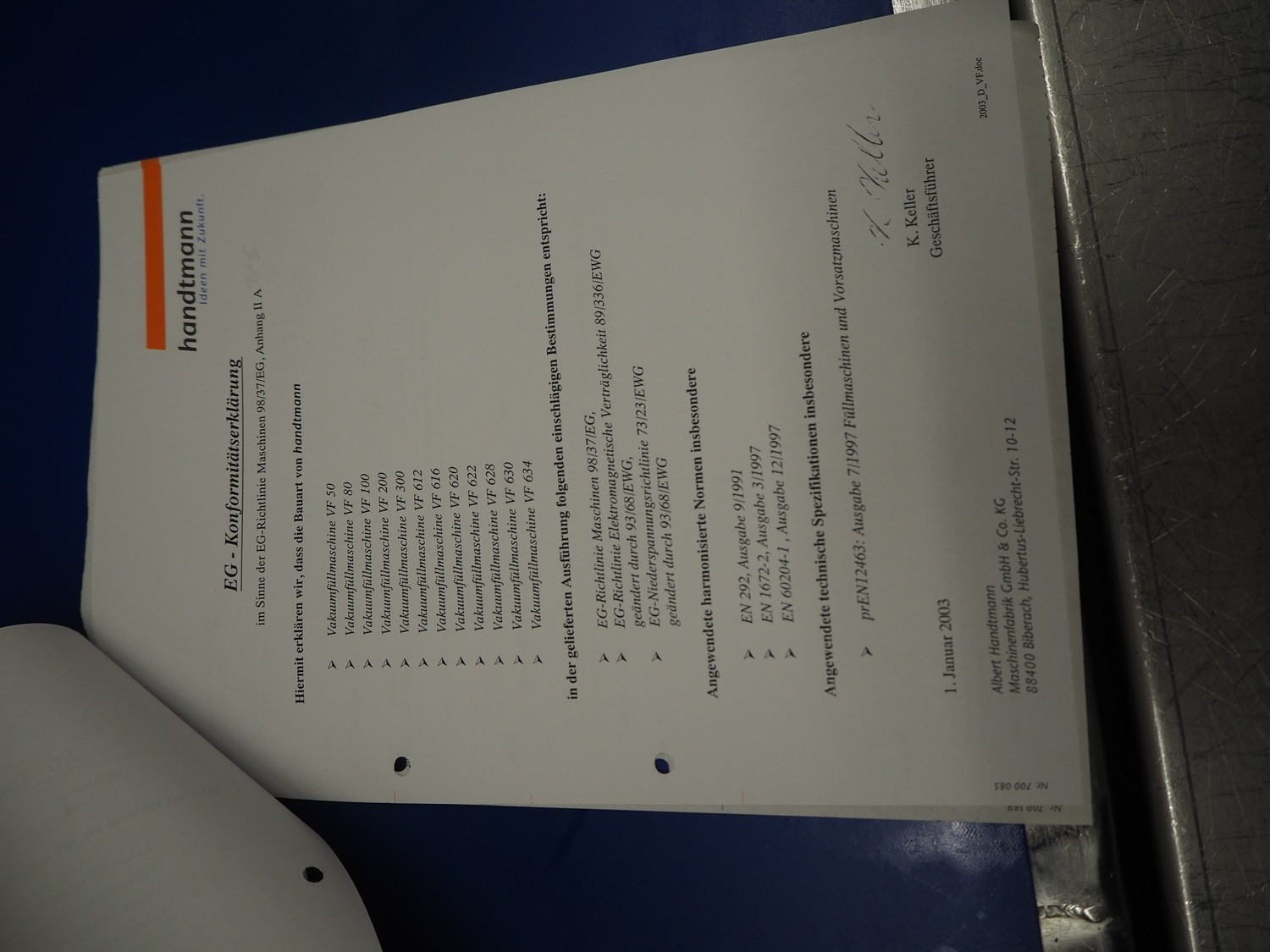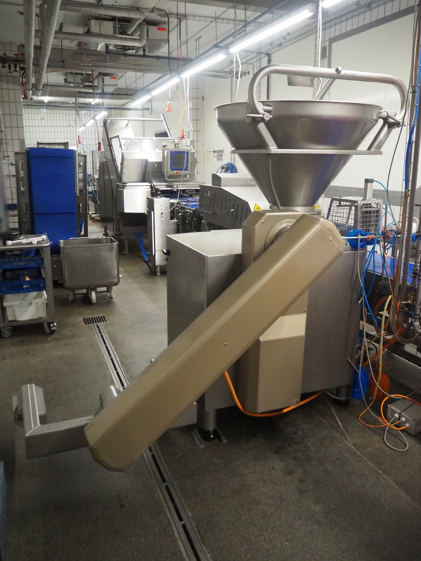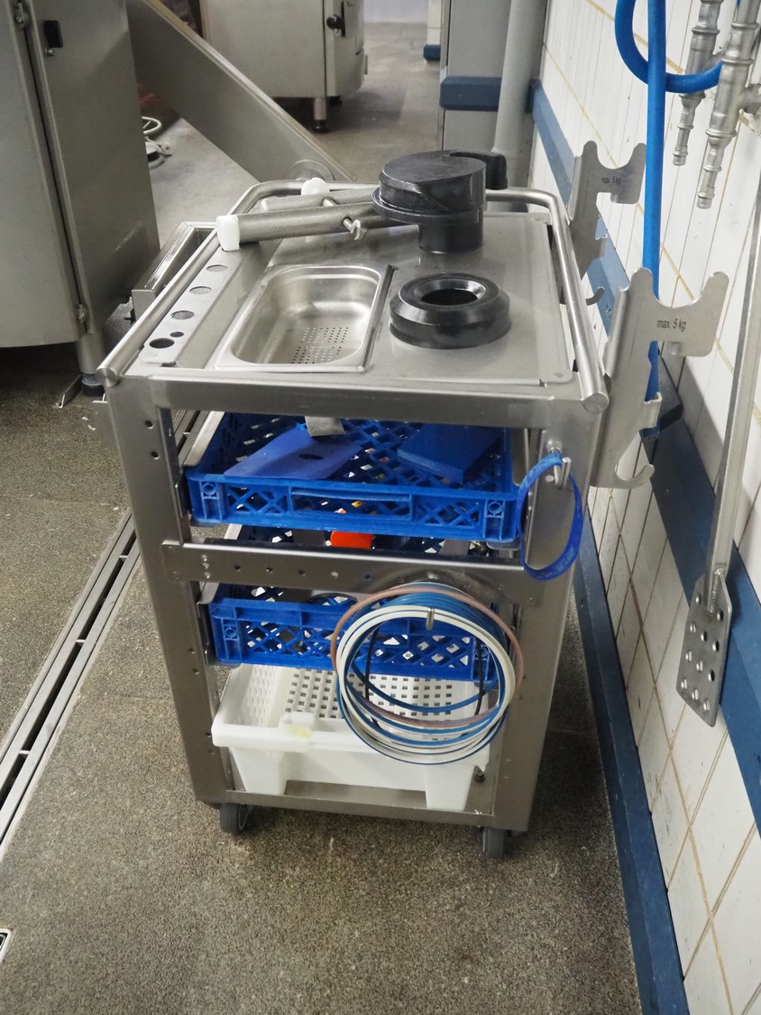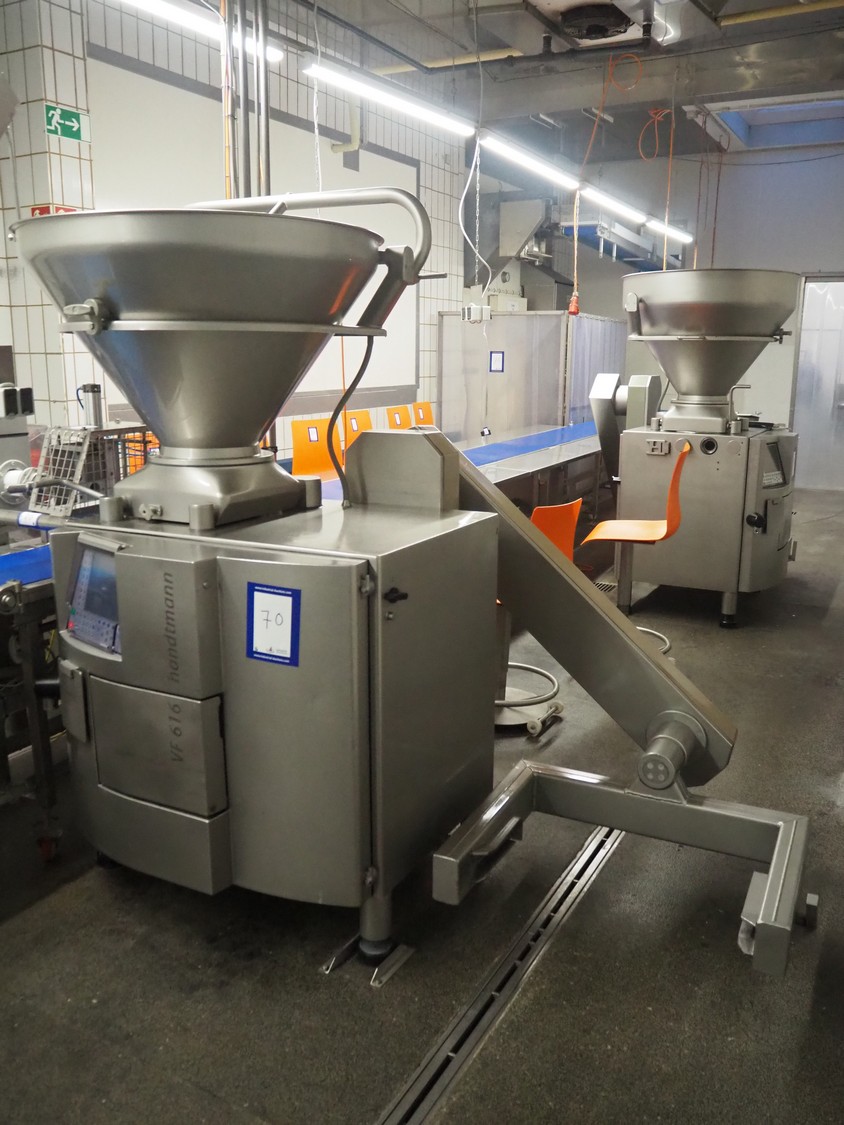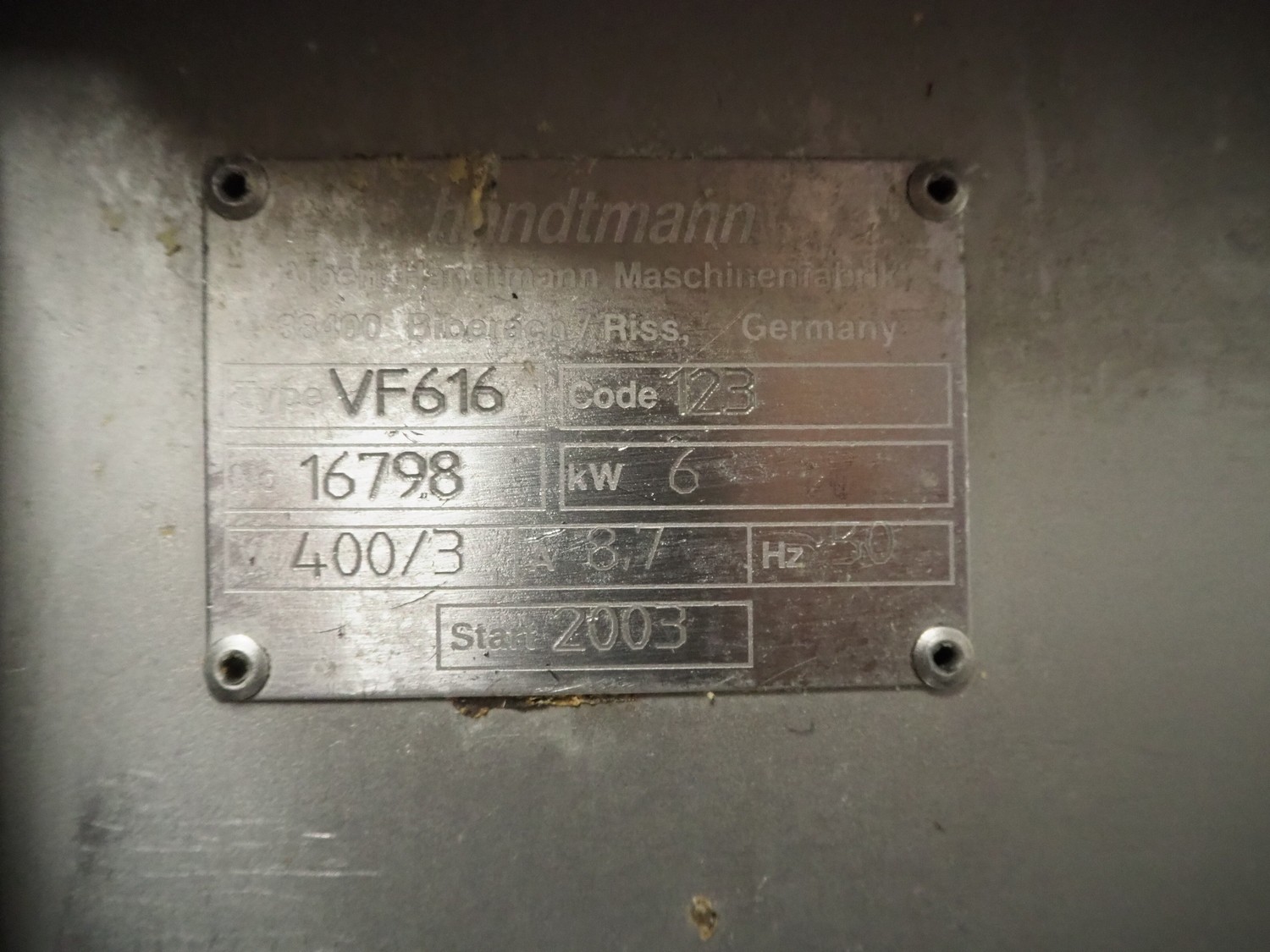 Handtmann vacuum filling machine with lifter for 200 liter meat bins and portioning device, type: VF616, number: 16798, year of construction: 2003, 400 V, 3 Ph, 50 Hz, 8.7 A, 6 kW, Busch vacuum pump, type: KC 0016 E 3Z0, number: 120028941, capacity: 16 m³ per hour, s/s filling pipe and portioning device, dimensions: 2100 mm x 1400 mm x 1910 mm, s/s tool trolley, dimensions: 1000 mm x 700 mm x 1200 mm.
