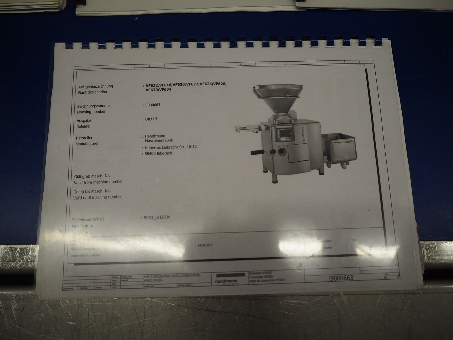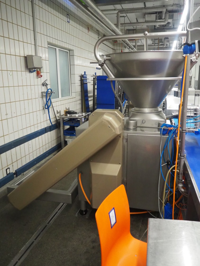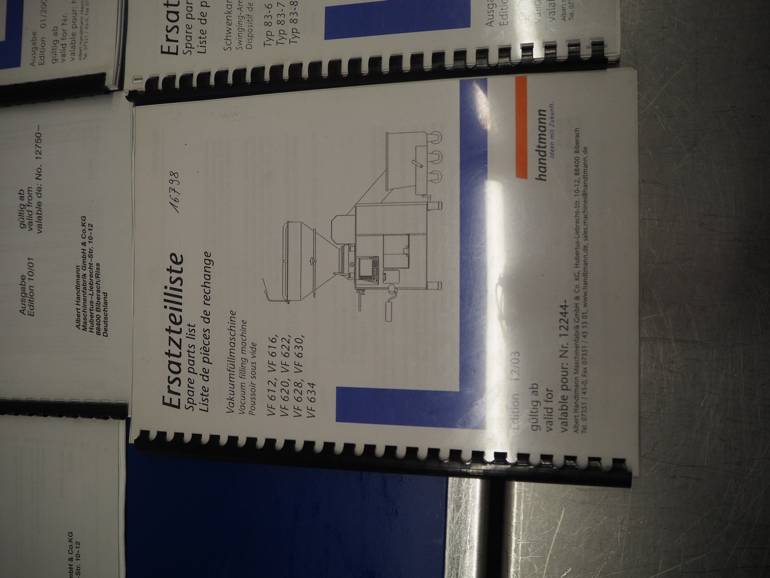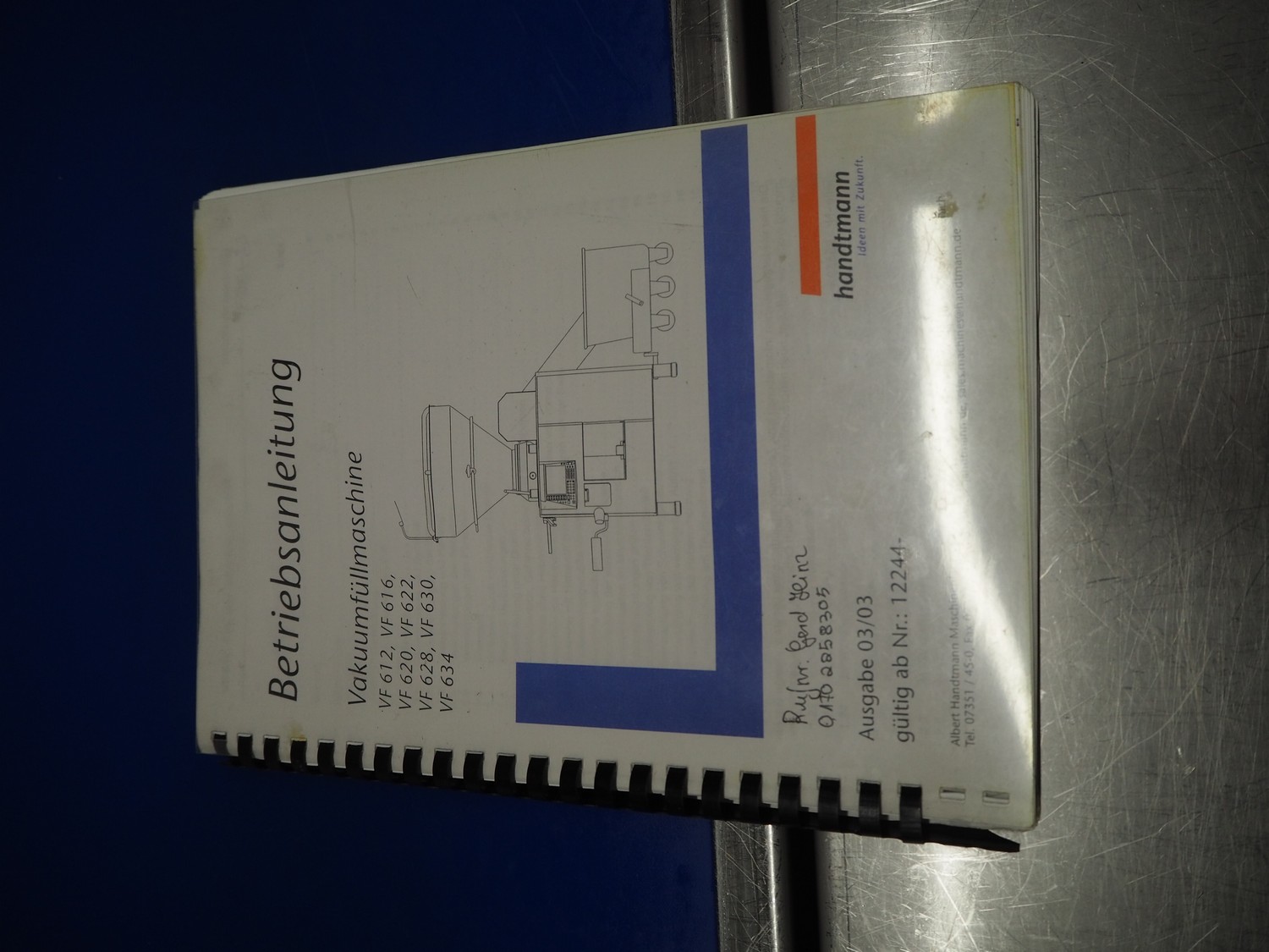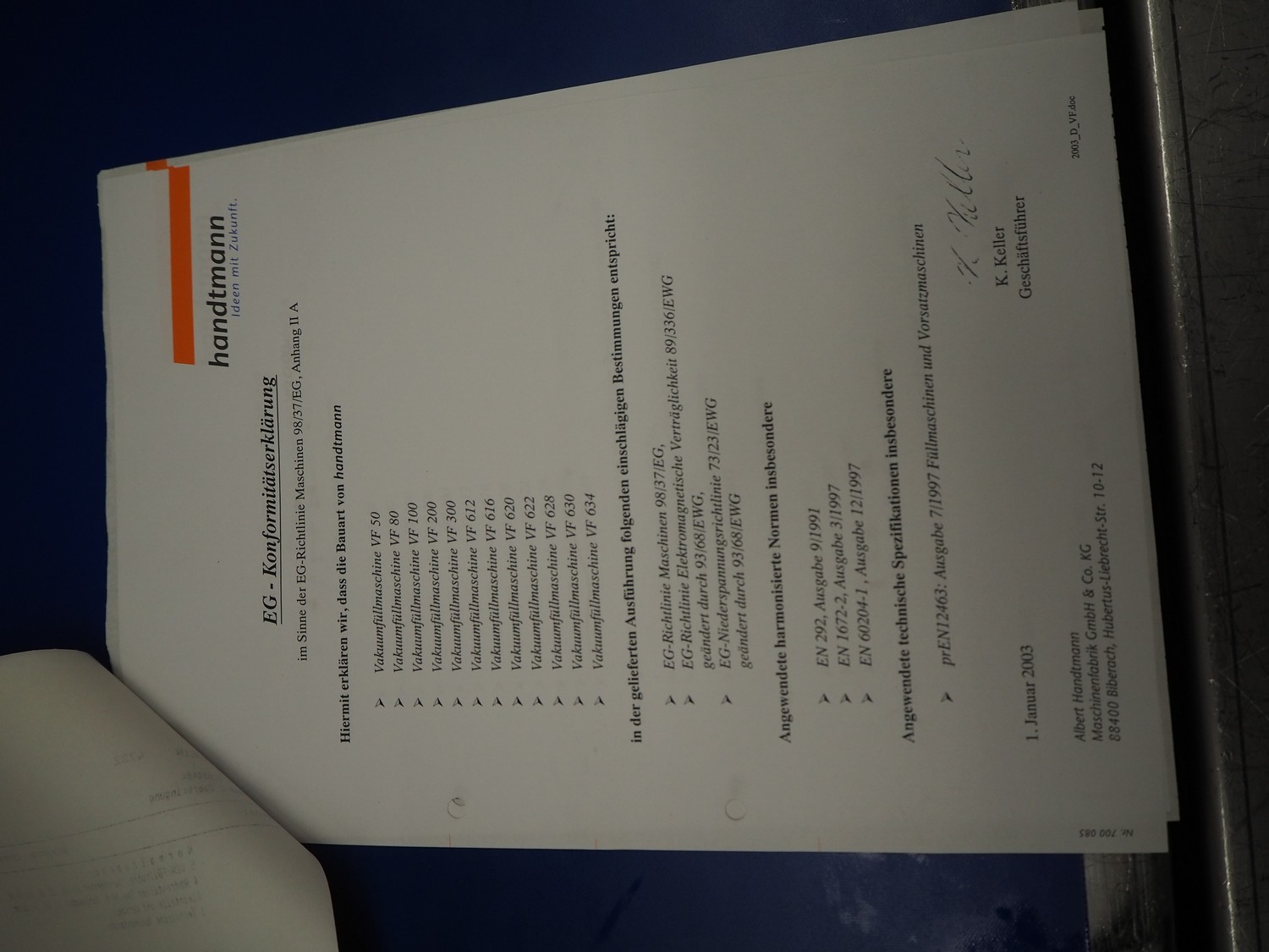 Handtmann vacuum filling machine with lifter for 200 liter meat bins and portioning device, type: VF616, number: 16798, year of construction: 2003, 400 V, 3 Ph, 50 Hz, 8.7 A, 6 kW, Busch vacuum pump, type: KC 0016 E 3Z0, number: 120028941, capacity: 16 m³ per hour, s/s filling pipe and portioning device, dimensions: 2100 mm x 1400 mm x 1910 mm, s/s tool trolley, dimensions: 1000 mm x 700 mm x 1200 mm.