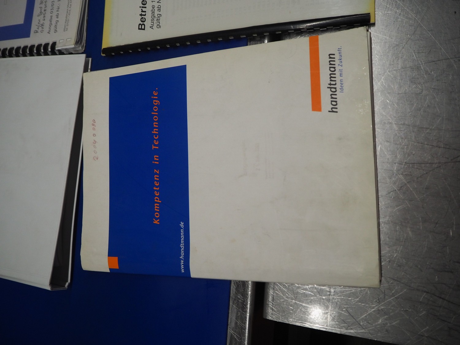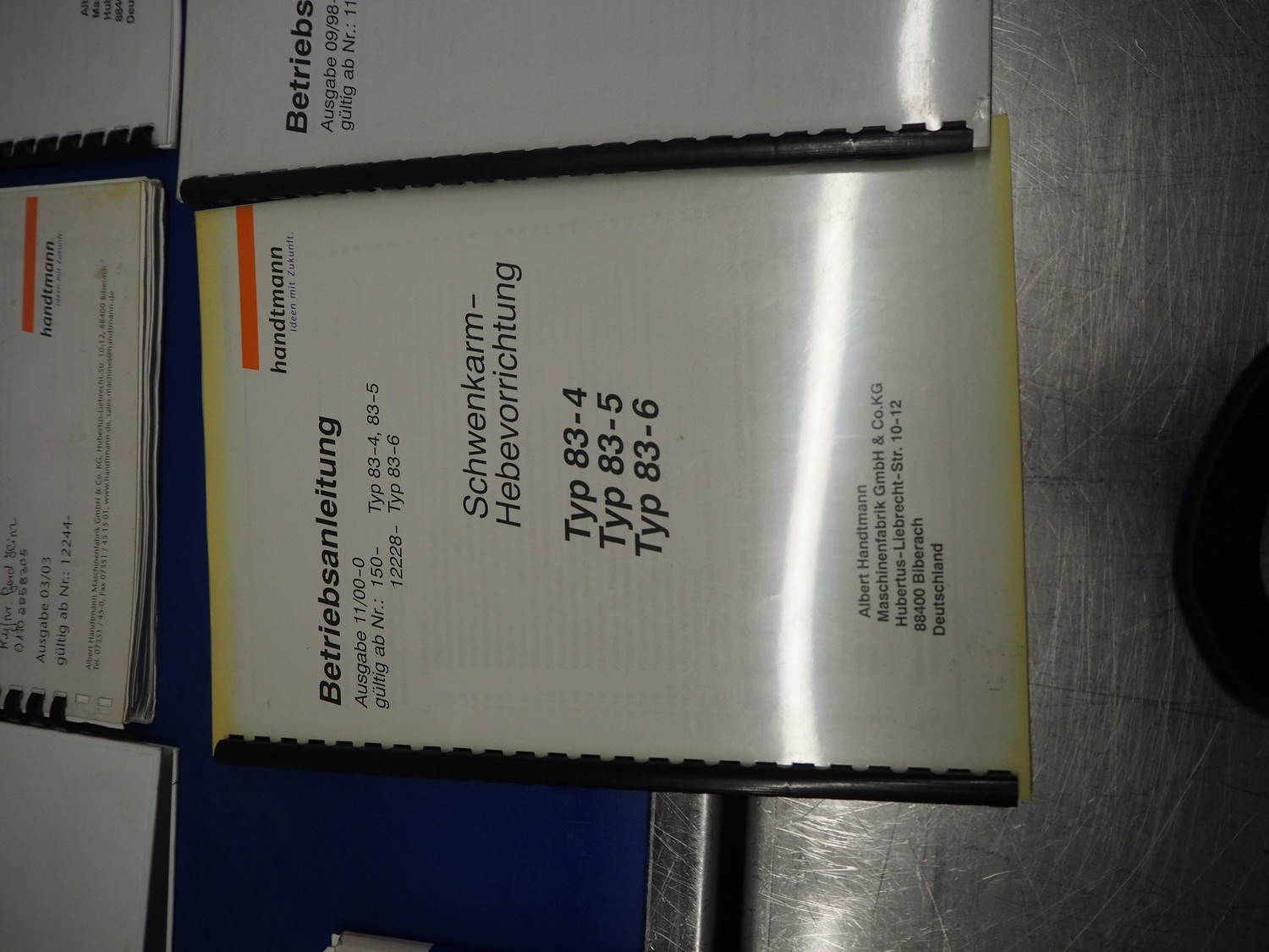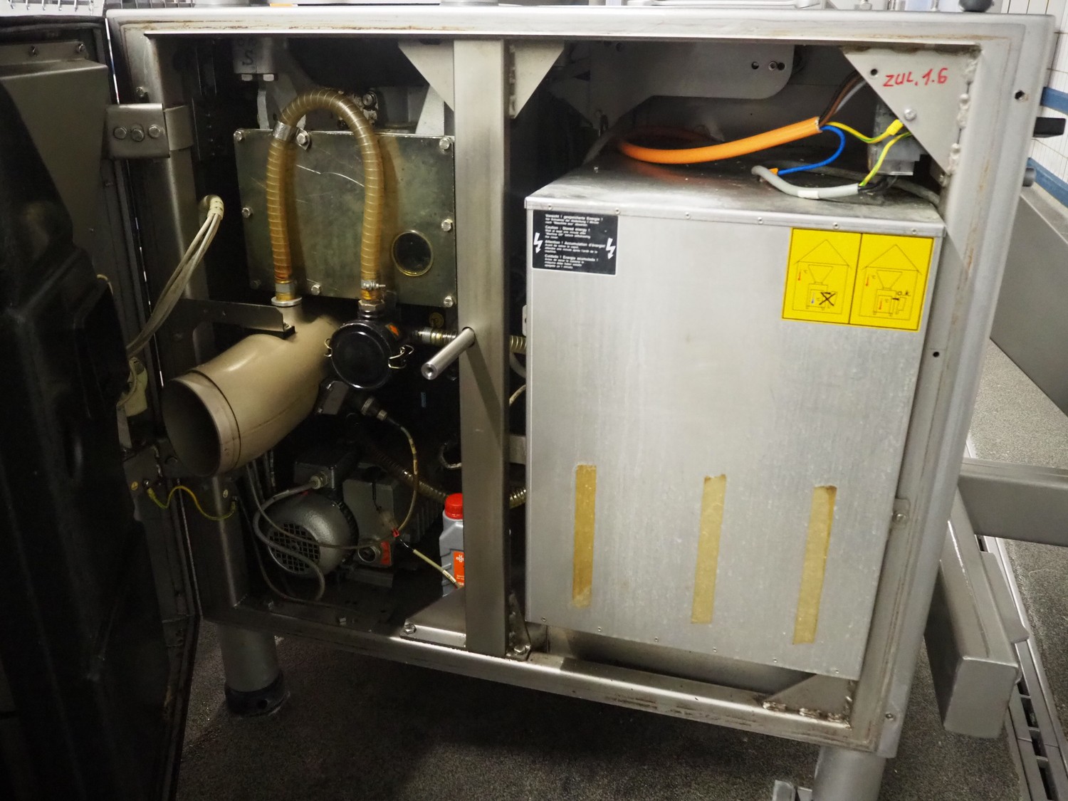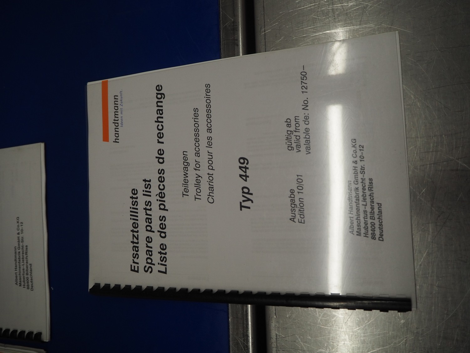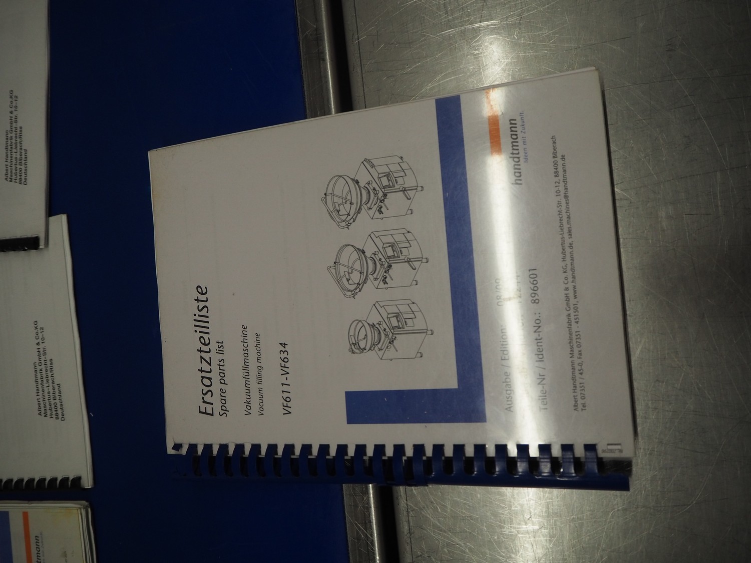Handtmann vacuum filling machine with lifter for 200 liter meat bins and portioning device, type: VF616, number: 16798, year of construction: 2003, 400 V, 3 Ph, 50 Hz, 8.7 A, 6 kW, Busch vacuum pump, type: KC 0016 E 3Z0, number: 120028941, capacity: 16 m³ per hour, s/s filling pipe and portioning device, dimensions: 2100 mm x 1400 mm x 1910 mm, s/s tool trolley, dimensions: 1000 mm x 700 mm x 1200 mm.