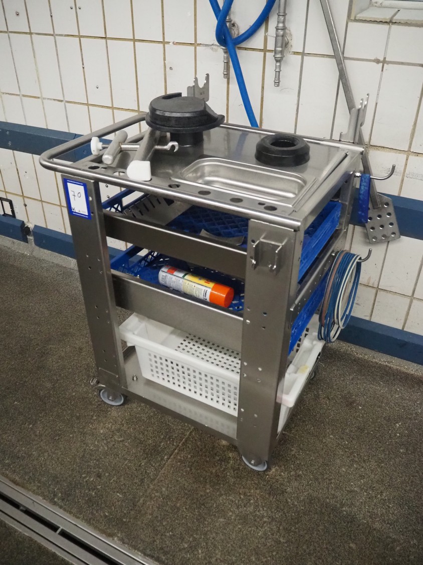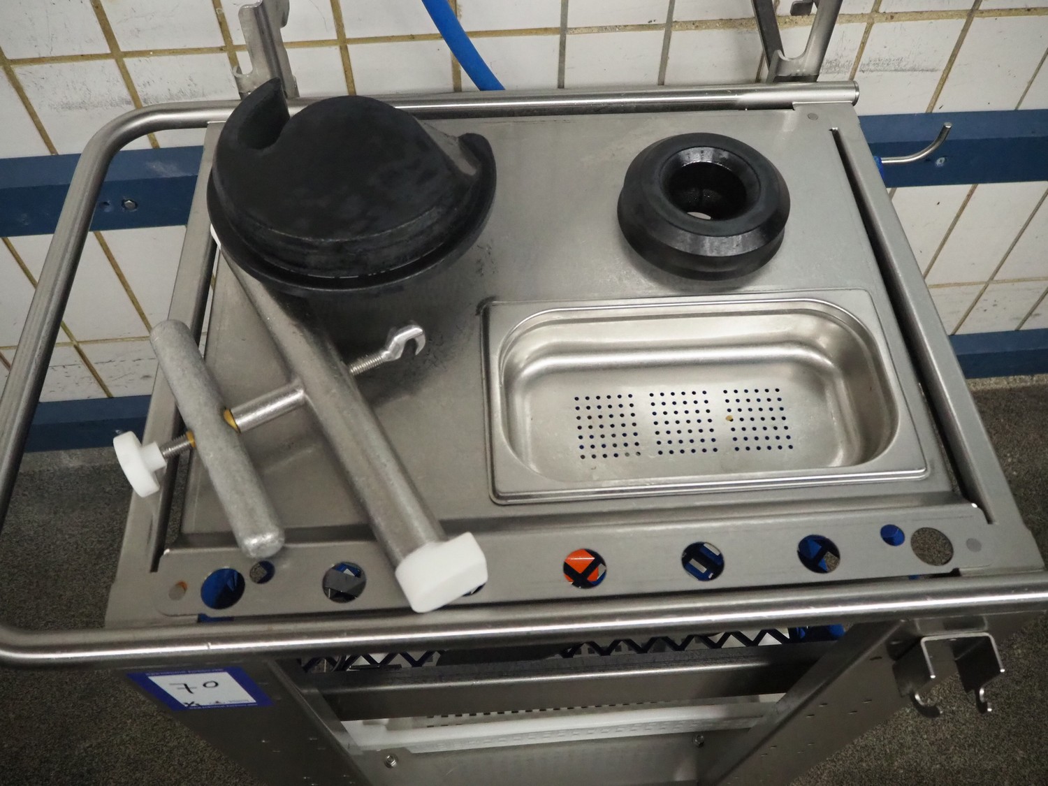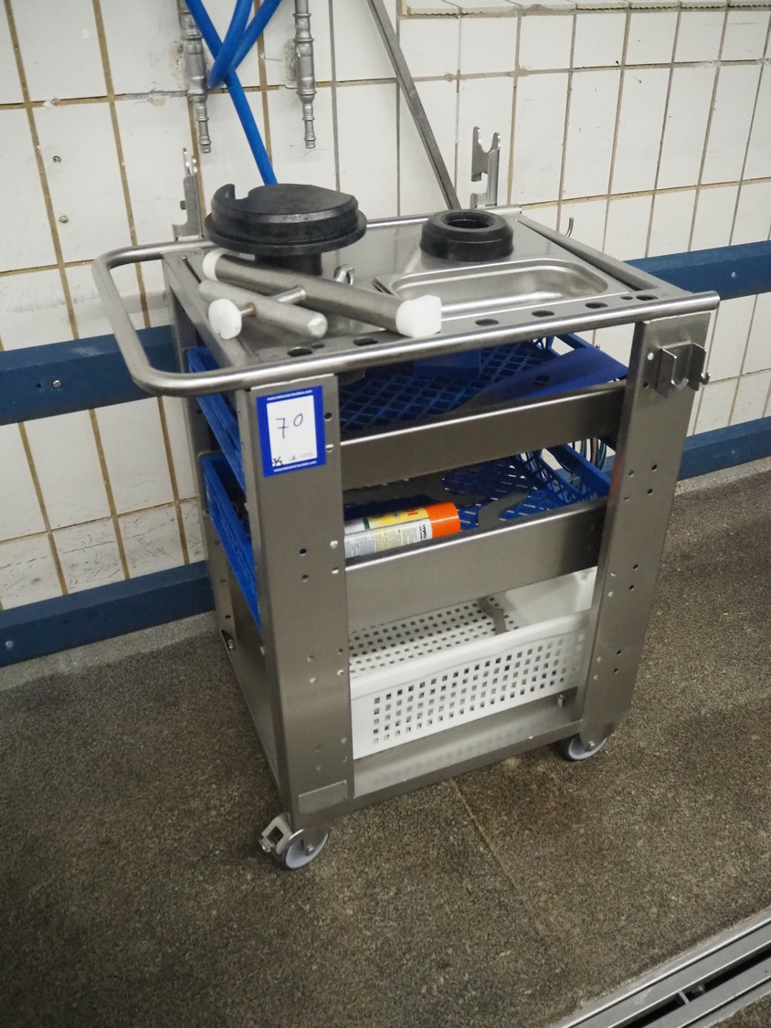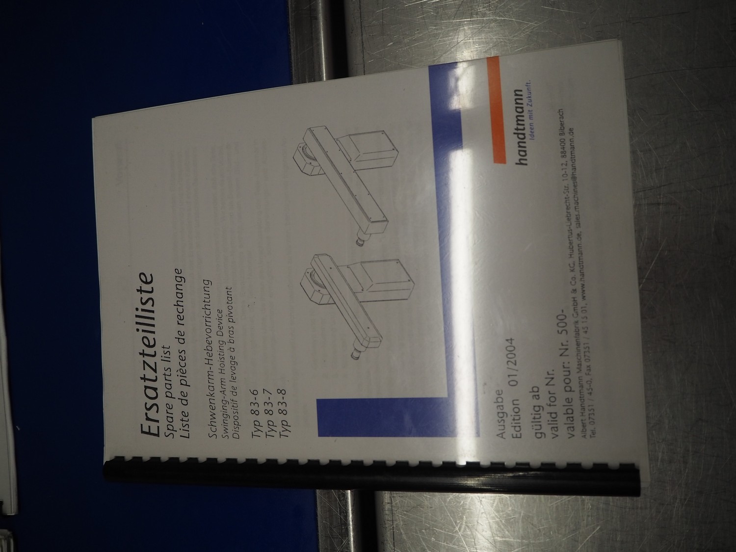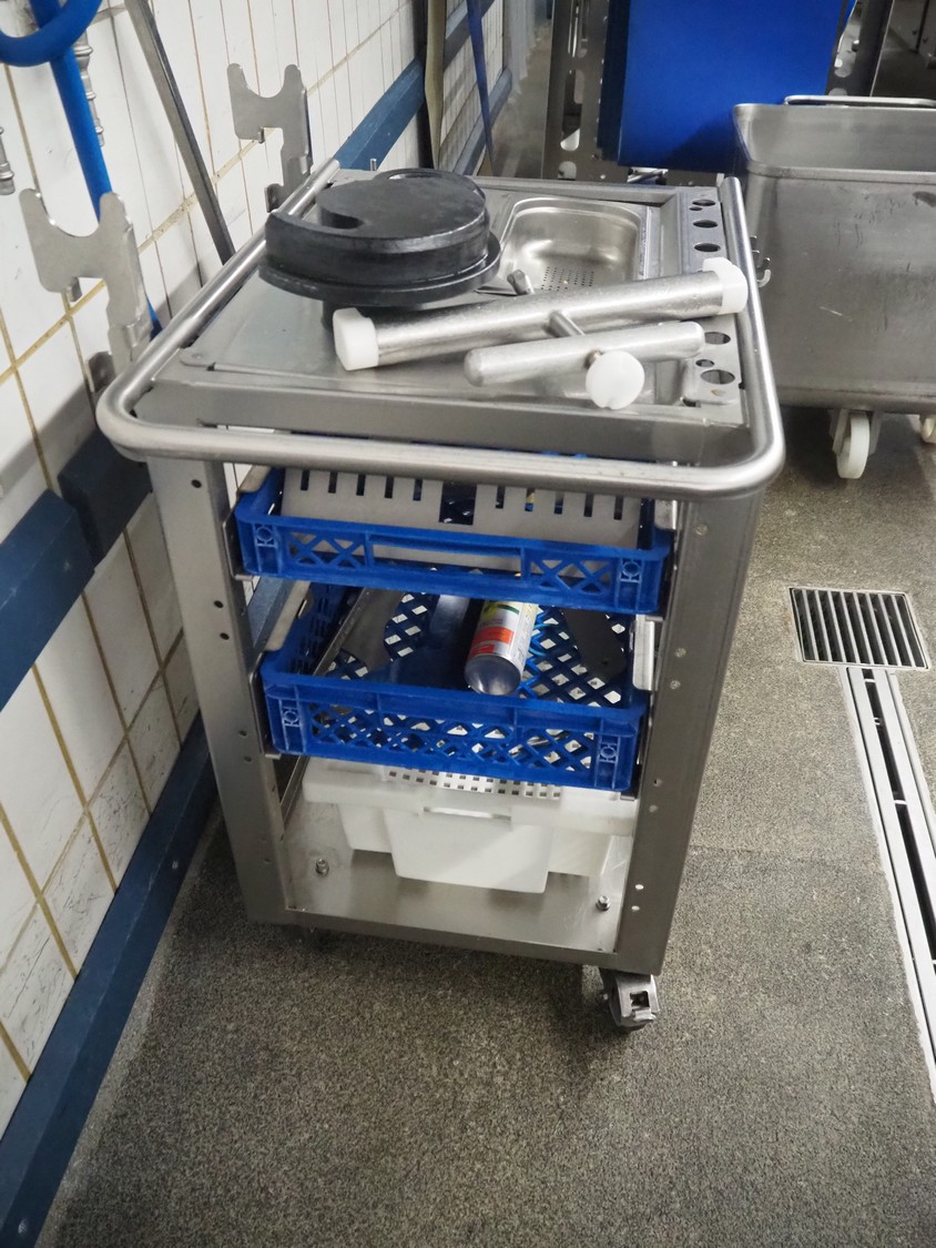 Handtmann vacuum filling machine with lifter for 200 liter meat bins and portioning device, type: VF616, number: 16798, year of construction: 2003, 400 V, 3 Ph, 50 Hz, 8.7 A, 6 kW, Busch vacuum pump, type: KC 0016 E 3Z0, number: 120028941, capacity: 16 m³ per hour, s/s filling pipe and portioning device, dimensions: 2100 mm x 1400 mm x 1910 mm, s/s tool trolley, dimensions: 1000 mm x 700 mm x 1200 mm.