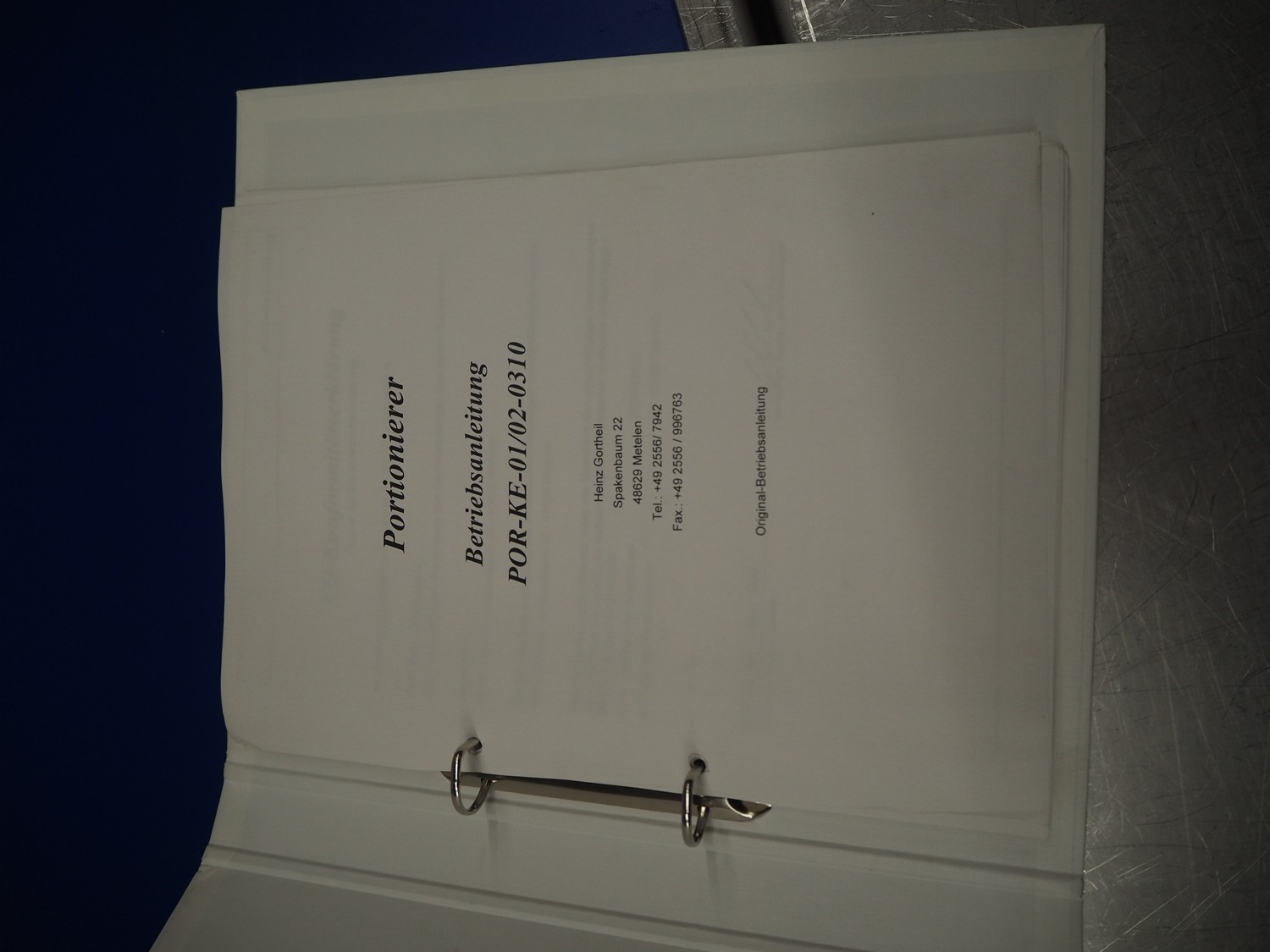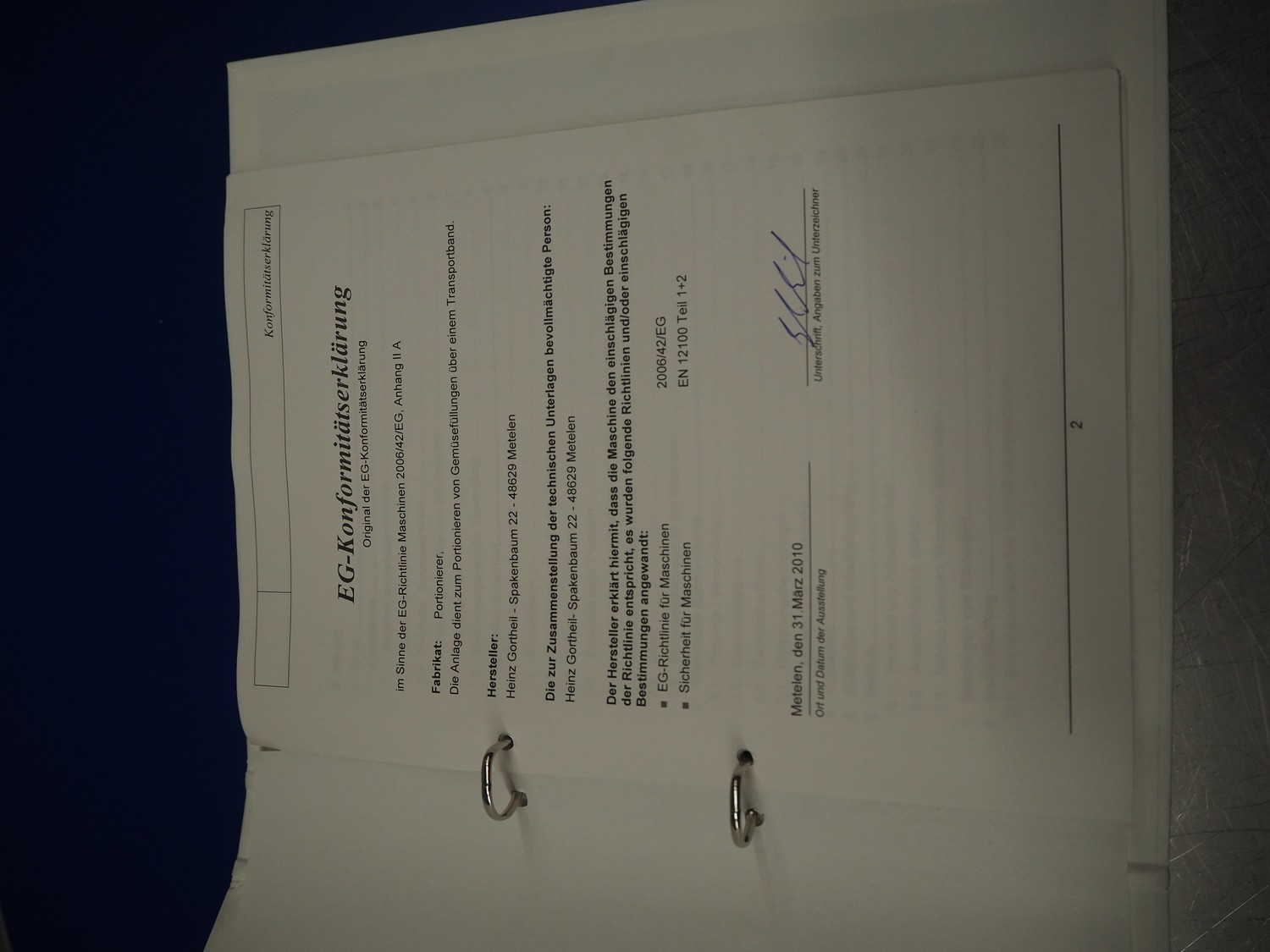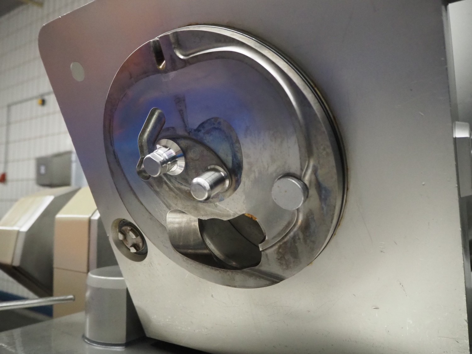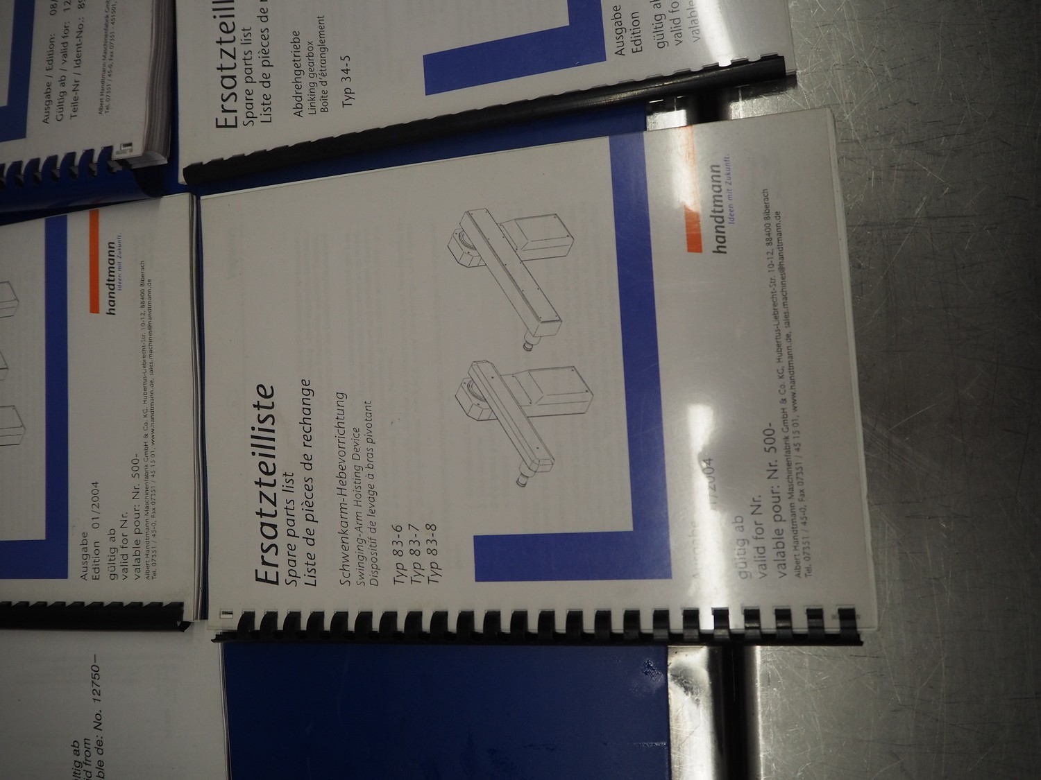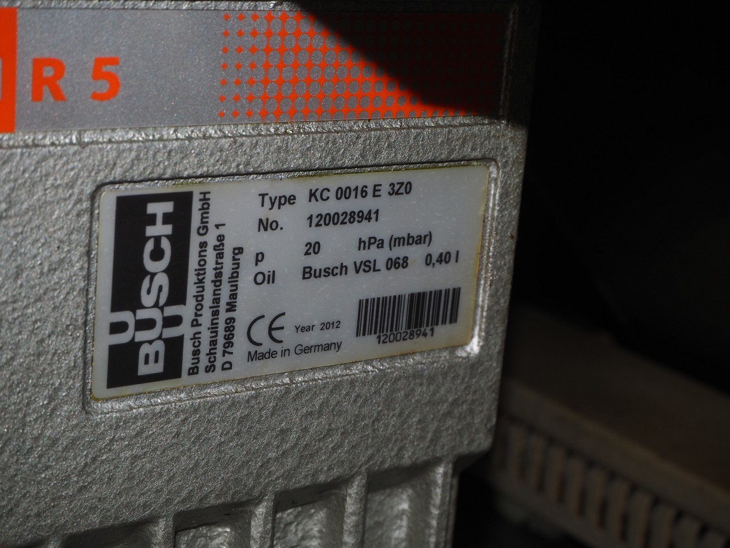 Handtmann vacuum filling machine with lifter for 200 liter meat bins and portioning device, type: VF616, number: 16798, year of construction: 2003, 400 V, 3 Ph, 50 Hz, 8.7 A, 6 kW, Busch vacuum pump, type: KC 0016 E 3Z0, number: 120028941, capacity: 16 m³ per hour, s/s filling pipe and portioning device, dimensions: 2100 mm x 1400 mm x 1910 mm, s/s tool trolley, dimensions: 1000 mm x 700 mm x 1200 mm.