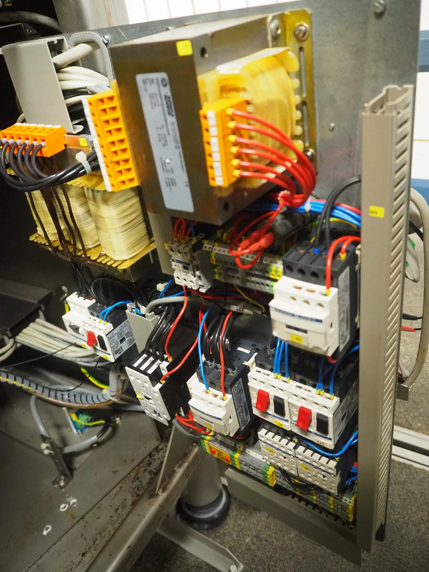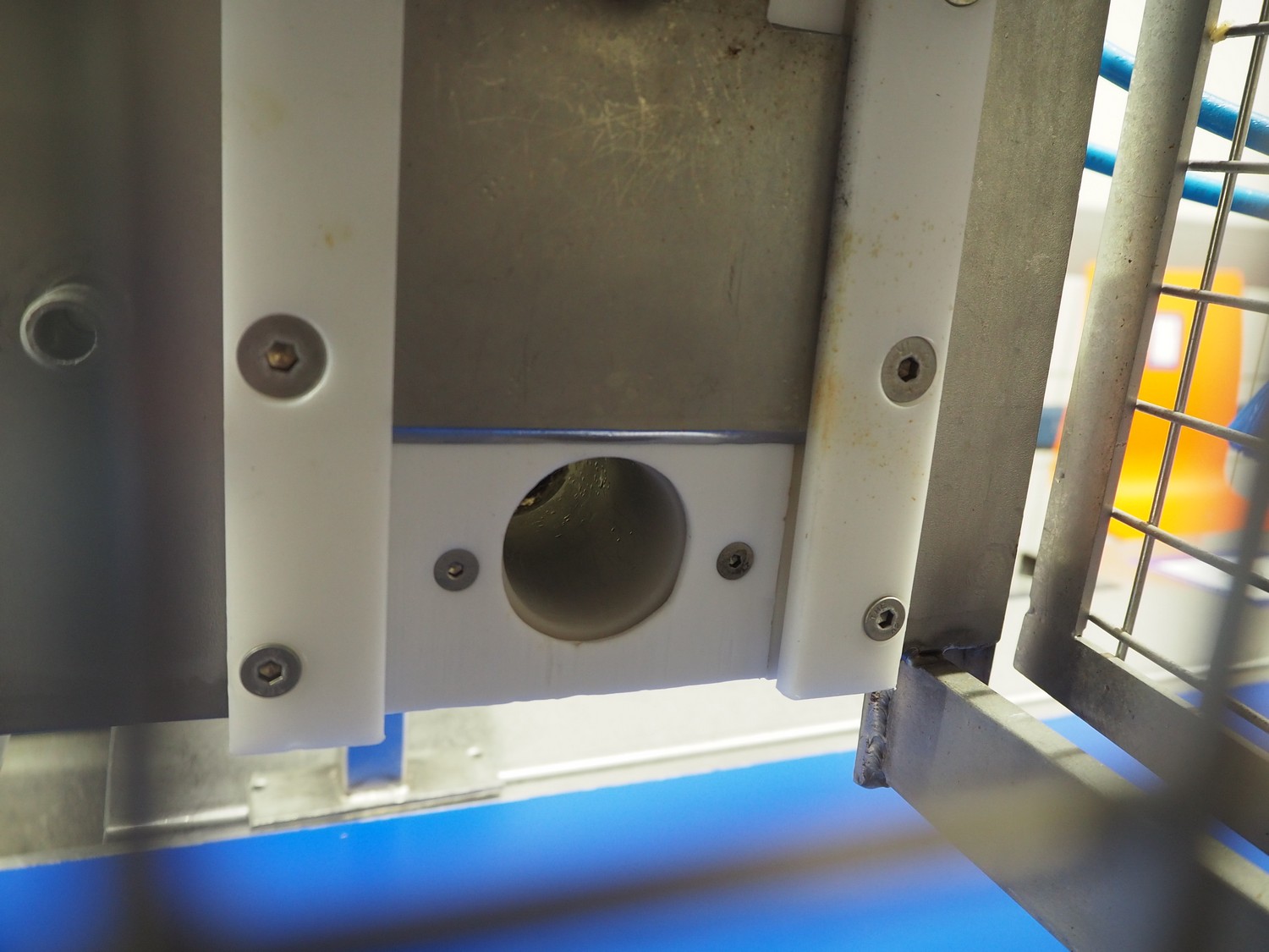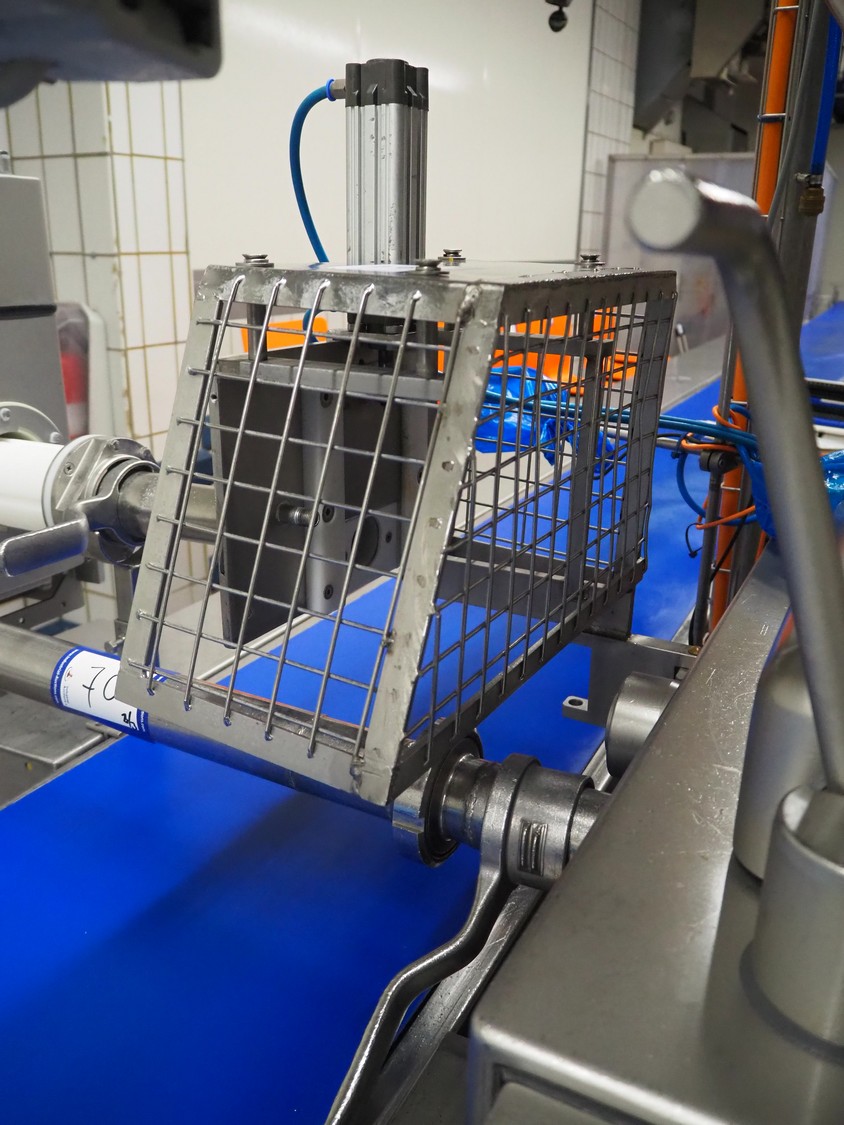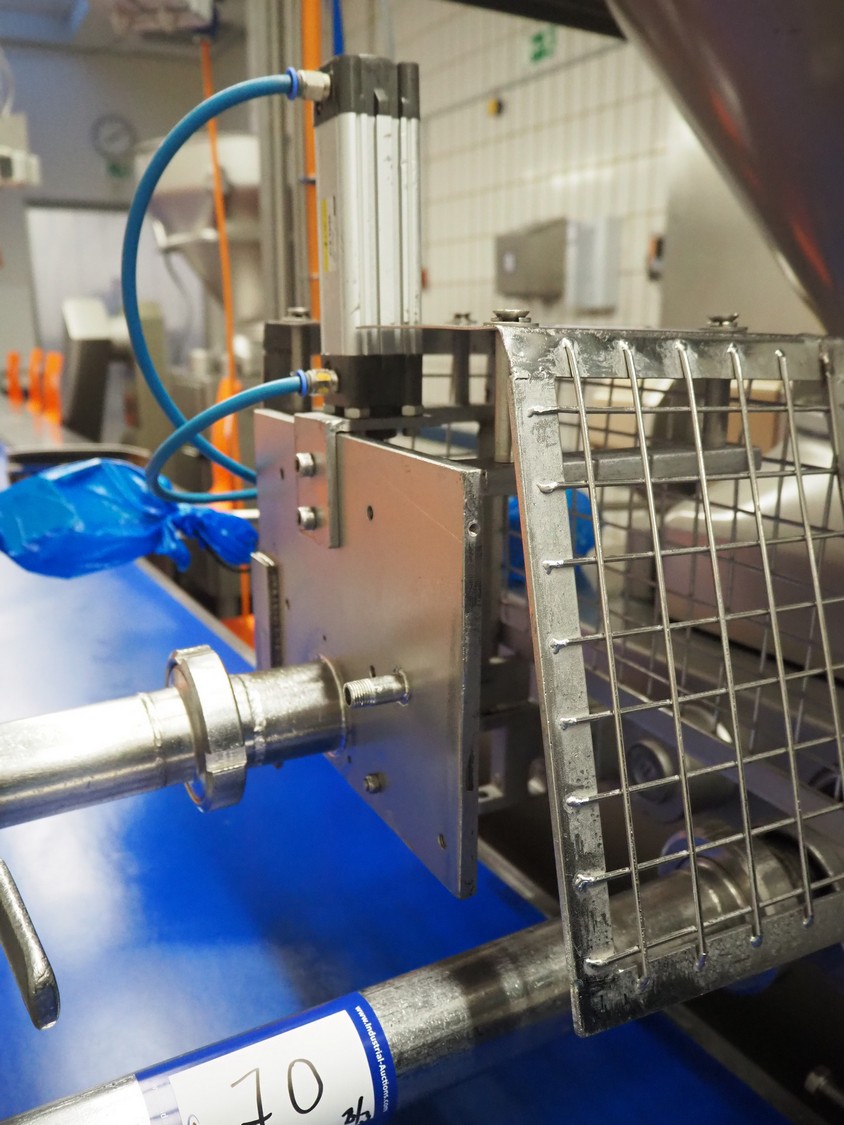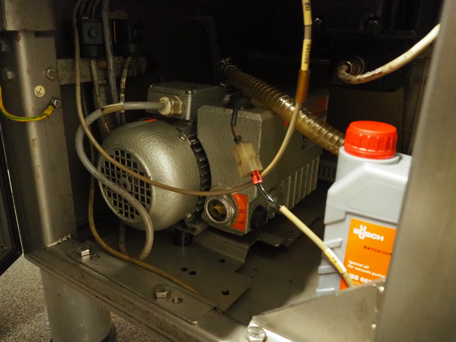 Handtmann vacuum filling machine with lifter for 200 liter meat bins and portioning device, type: VF616, number: 16798, year of construction: 2003, 400 V, 3 Ph, 50 Hz, 8.7 A, 6 kW, Busch vacuum pump, type: KC 0016 E 3Z0, number: 120028941, capacity: 16 m³ per hour, s/s filling pipe and portioning device, dimensions: 2100 mm x 1400 mm x 1910 mm, s/s tool trolley, dimensions: 1000 mm x 700 mm x 1200 mm.