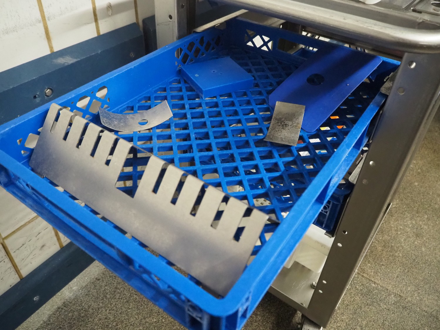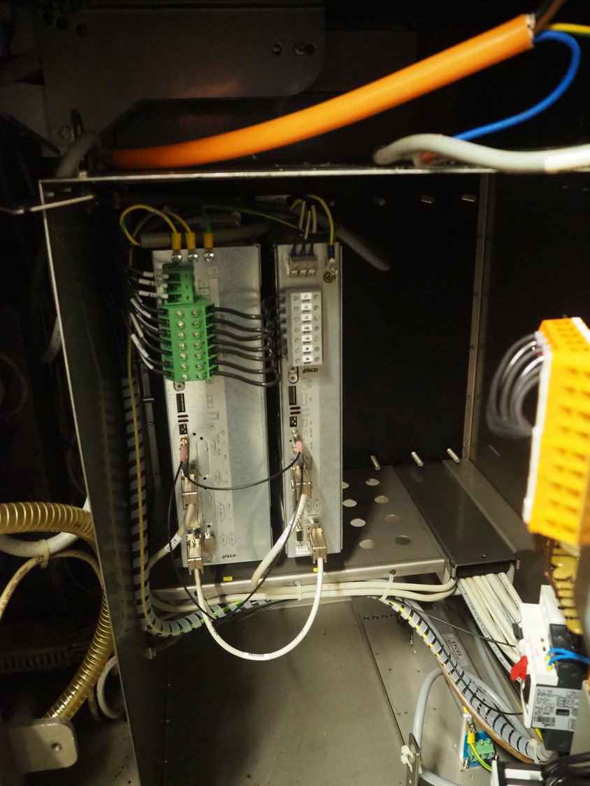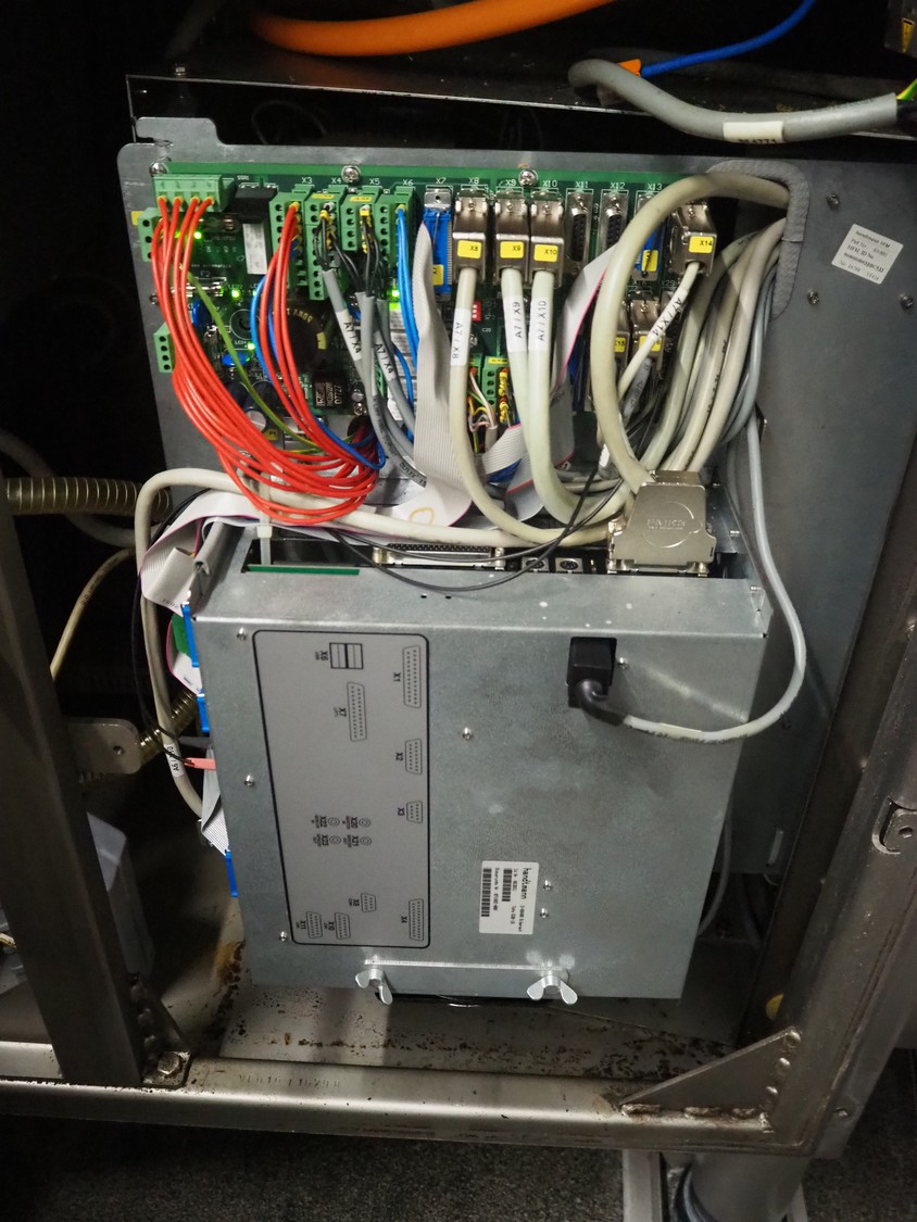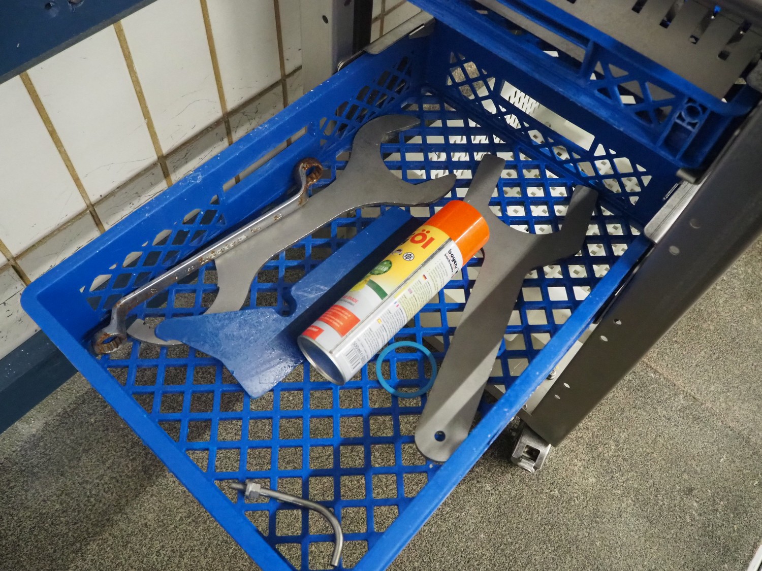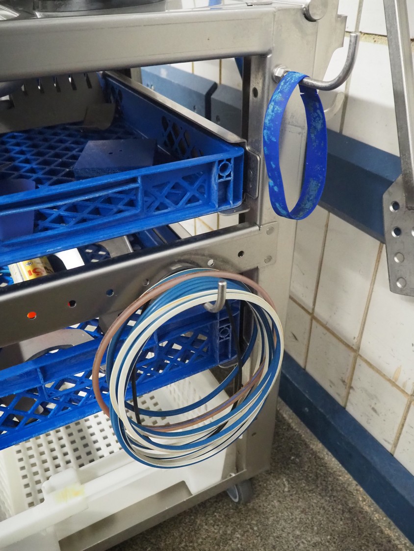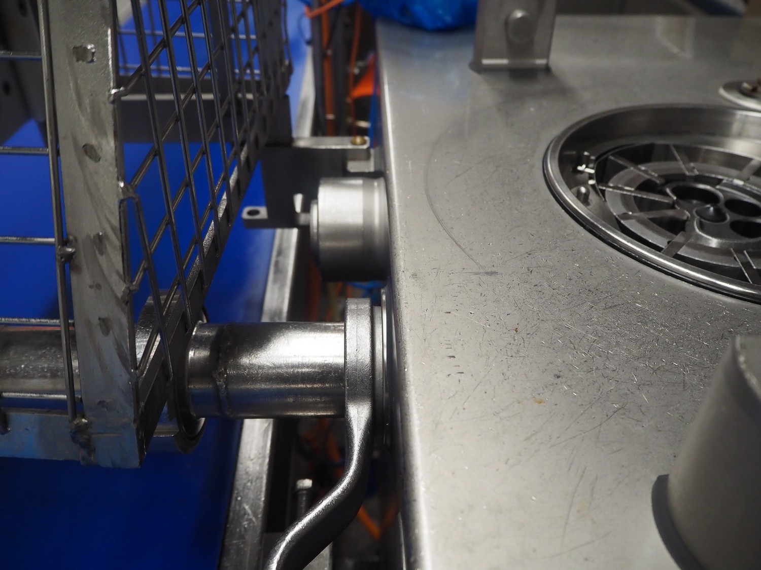 Handtmann vacuum filling machine with lifter for 200 liter meat bins and portioning device, type: VF616, number: 16798, year of construction: 2003, 400 V, 3 Ph, 50 Hz, 8.7 A, 6 kW, Busch vacuum pump, type: KC 0016 E 3Z0, number: 120028941, capacity: 16 m³ per hour, s/s filling pipe and portioning device, dimensions: 2100 mm x 1400 mm x 1910 mm, s/s tool trolley, dimensions: 1000 mm x 700 mm x 1200 mm.