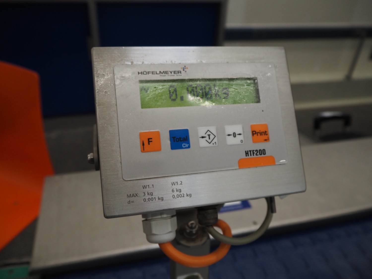 Hӧfelmeyer weighing scale, modell: HIK6DC-E-C39K-HTF200, serial number: 6112373, maximum: 3 / 6 kg, d - 0.001 kg / 0.002 kg, dimensions scale: 320 mm x 240 mm, total dimensions: 320 mm x 350 mm x 520 mm.