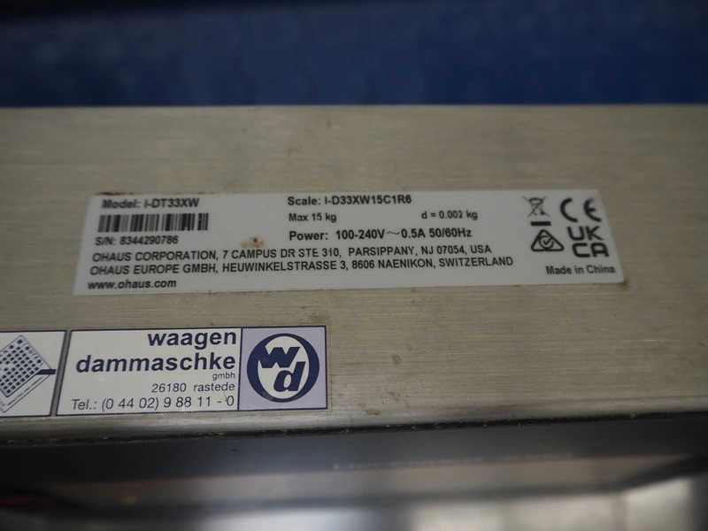 Ohaus Corporation weighing scale, model scale: i-D15C1R, serial number: 8344290786, model indicator: i-DT33XW, 100-240 V, 1 Ph, 50/60 Hz, 0.5 A, maximum: 15 kg, d = 0.002 kg, dimensions scale: 350 mm x 310 mm, total dimensions: 350 mm x 310 mm x 400 mm.
