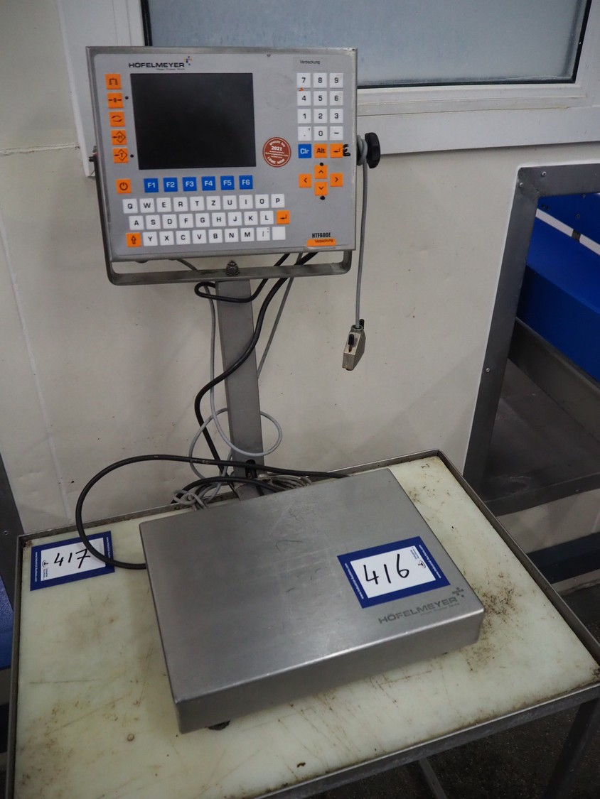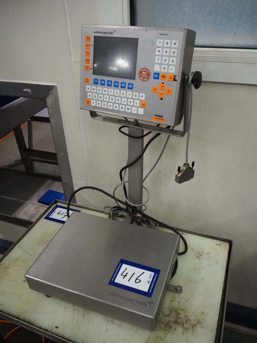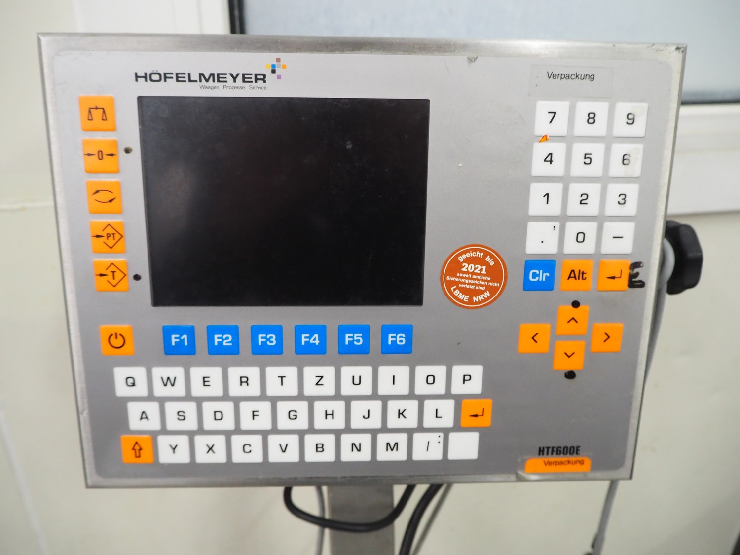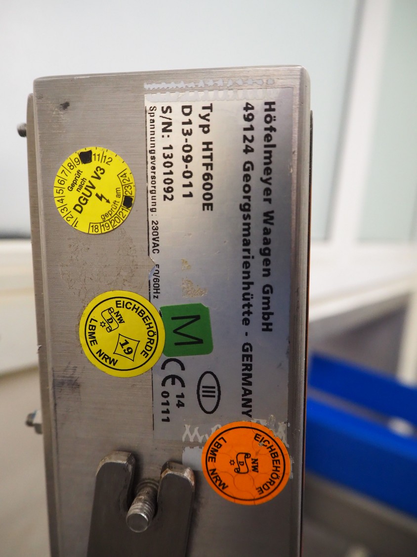 Höfelmeyer weighing scale, type: HTF600E, serial number: 1301092, 230 V, 50/60 Hz, dimensions scale: 320 mm x 240 mm, total dimensions: 350 mm x 390 mm x 560 mm.