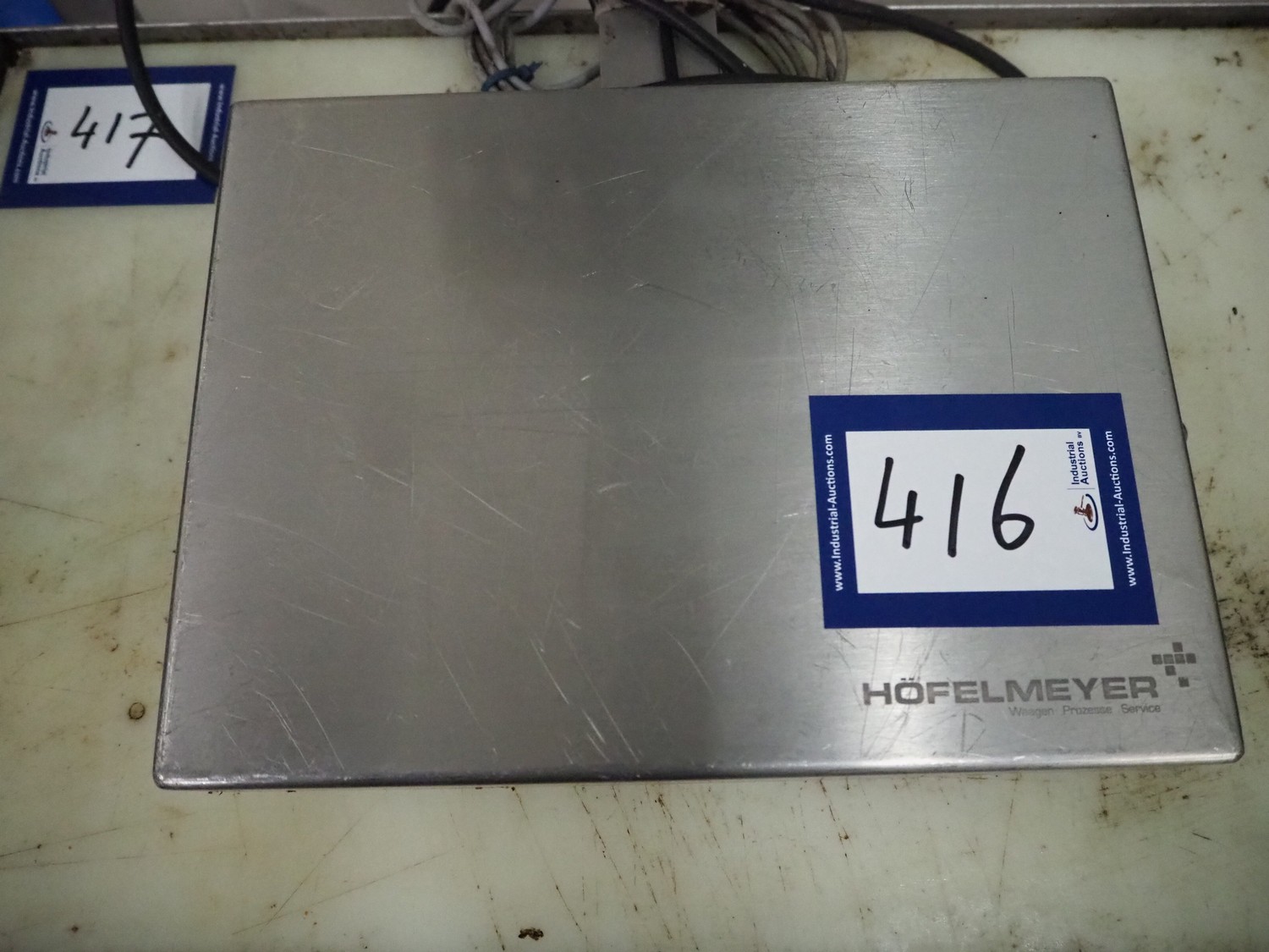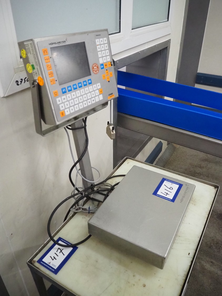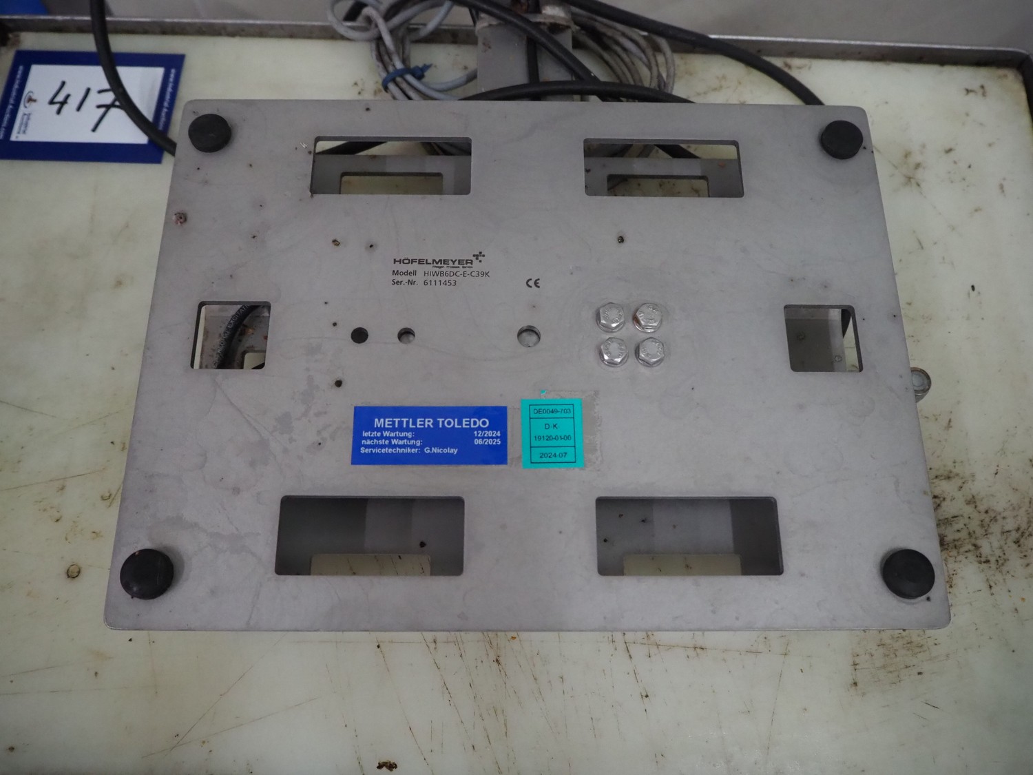 Höfelmeyer weighing scale, type: HTF600E, serial number: 1301092, 230 V, 50/60 Hz, dimensions scale: 320 mm x 240 mm, total dimensions: 350 mm x 390 mm x 560 mm.