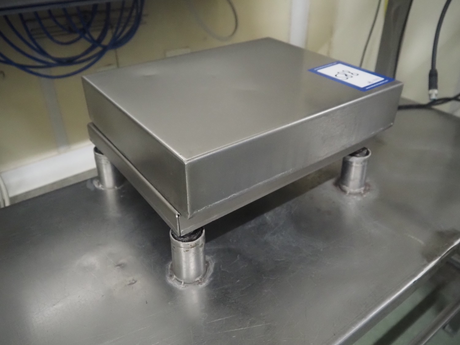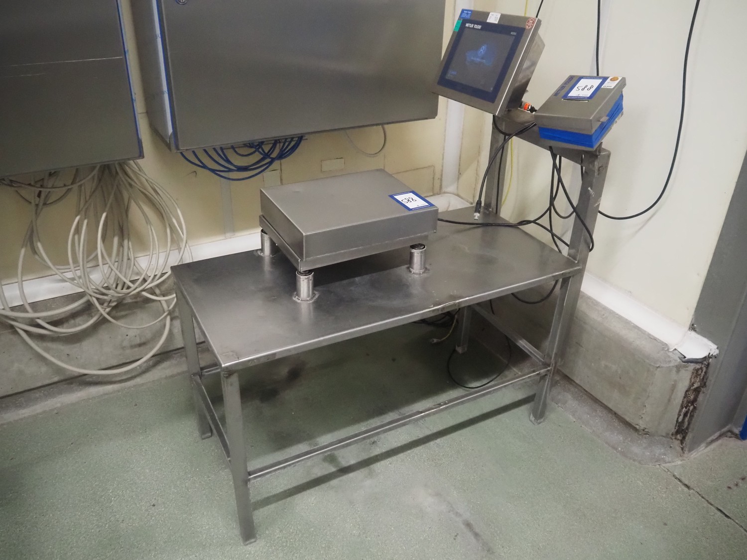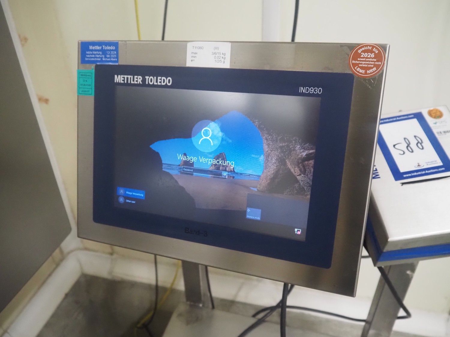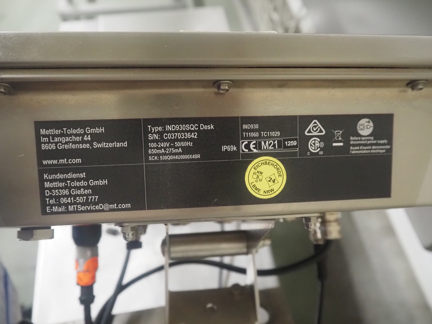 Mettler-Toledo weighing scale on s/s frame, type indicator: IND930SQC Desk, serial number: C037033642, 100-240 V, 50/60 Hz, 650-275 mA, maximum weight: 3/6/15 kg, minimum weight: 0.02 kg, e= 1/2/5 gram, dimensions scale: 350 mm x 280 mm, total dimensions: 1000 mm x 450 mm x 1170 mm. Screen damaged.