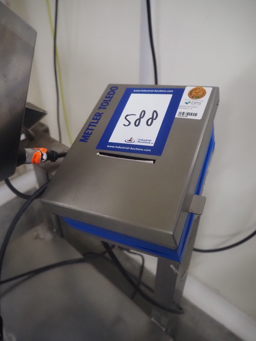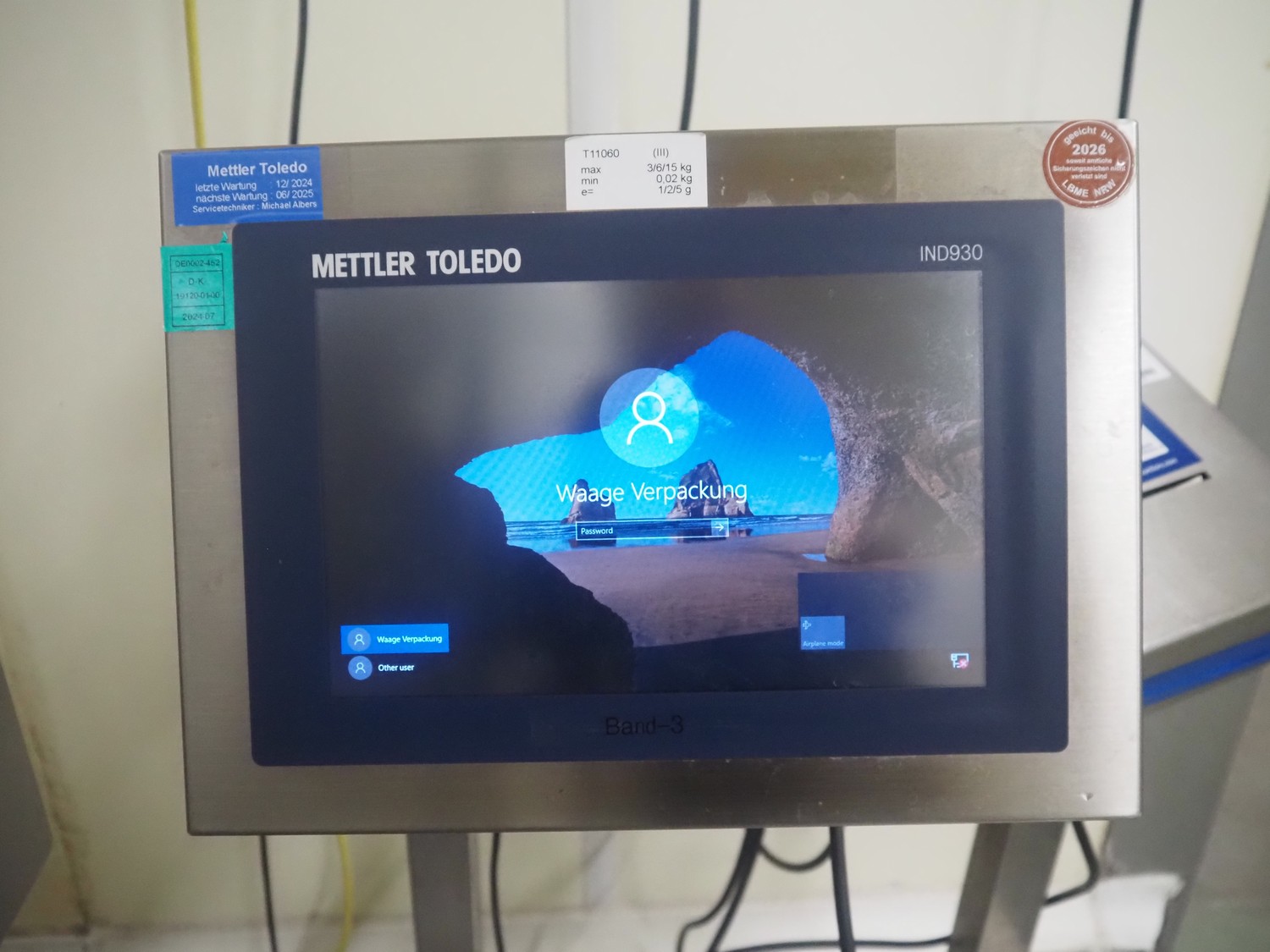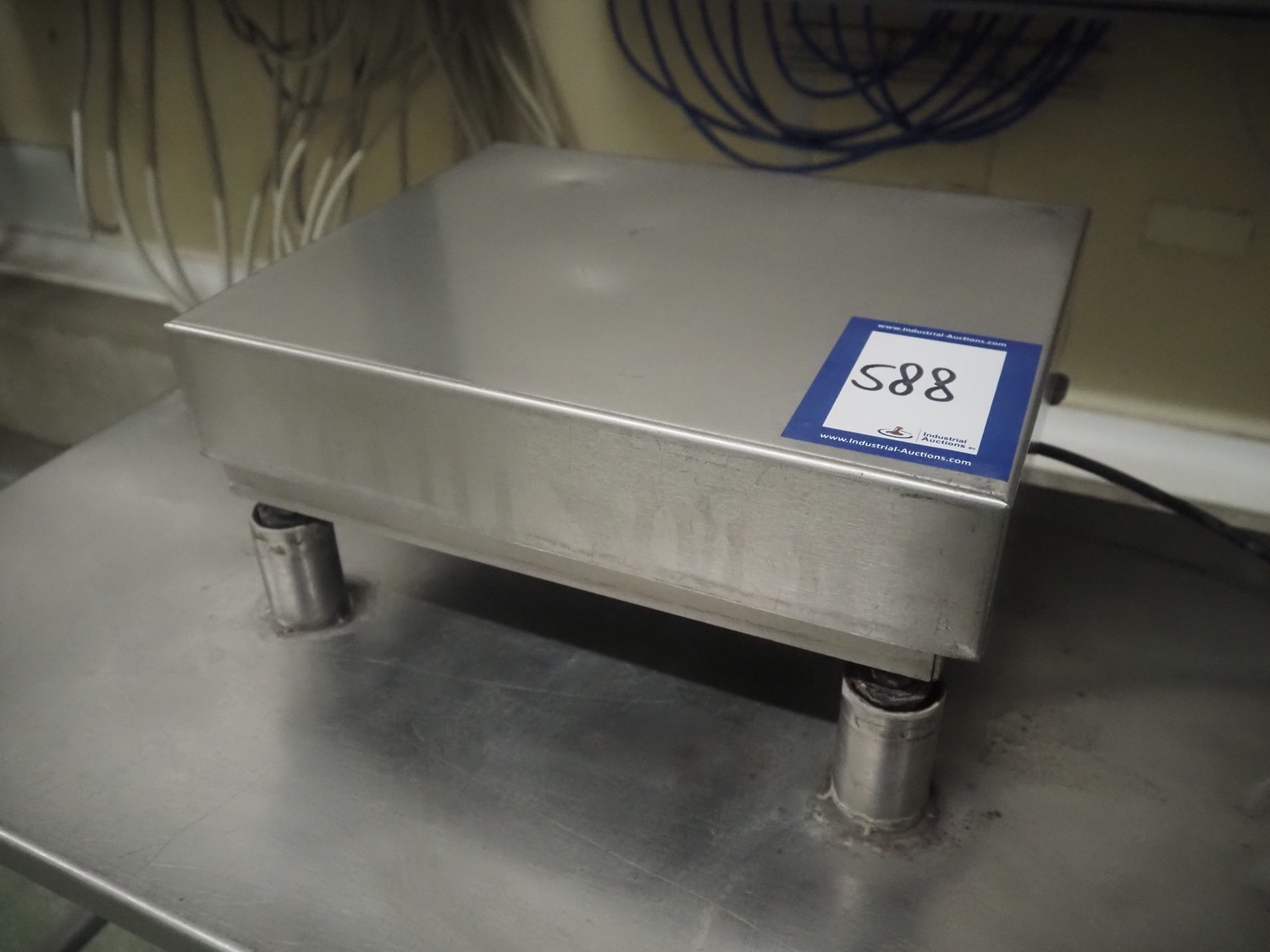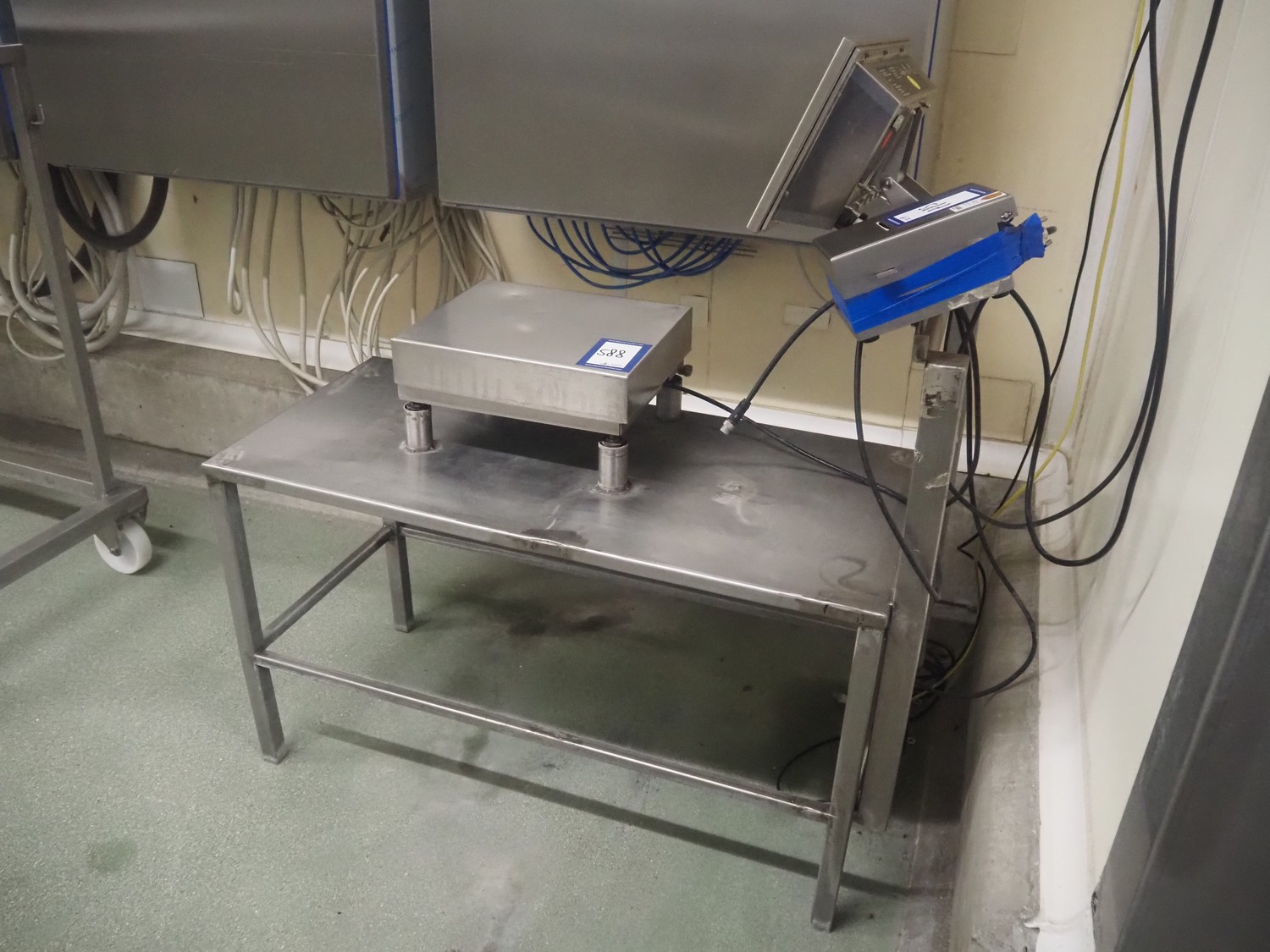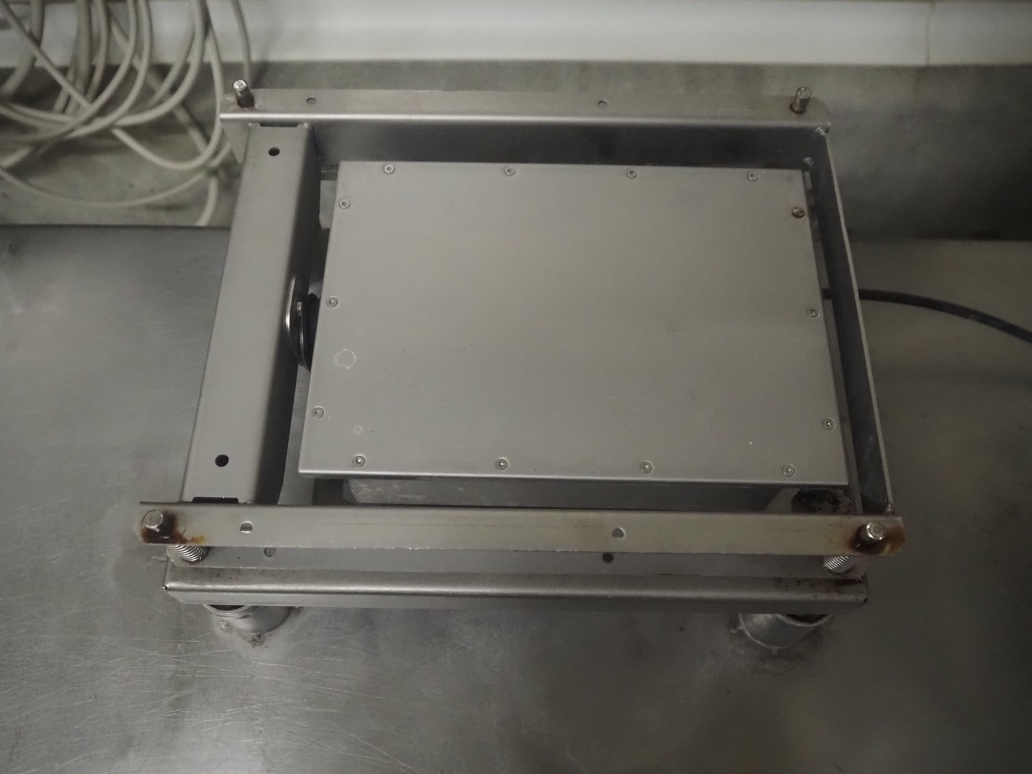 Mettler-Toledo weighing scale on s/s frame, type indicator: IND930SQC Desk, serial number: C037033642, 100-240 V, 50/60 Hz, 650-275 mA, maximum weight: 3/6/15 kg, minimum weight: 0.02 kg, e= 1/2/5 gram, dimensions scale: 350 mm x 280 mm, total dimensions: 1000 mm x 450 mm x 1170 mm. Screen damaged.