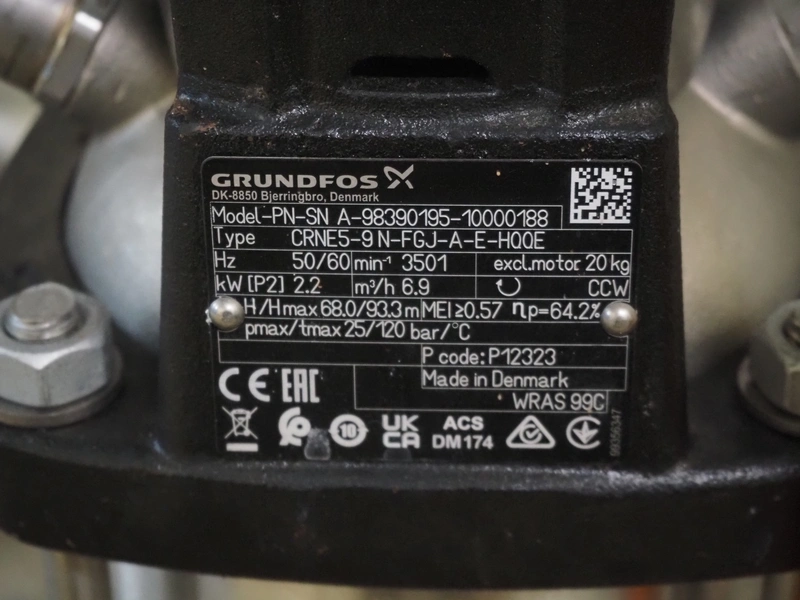 Grundfos circulation pump, type: CRNE5-9 N-FGJ-A-E-HQQE, 50/60 Hz, capacity: 6.9 m³ per hour, maximum working pressure: 25 bar, maximum working temperature: 120˚C, 3501 rates per minutes, dimensions: 300 mm x 300 mm x 850 mm.