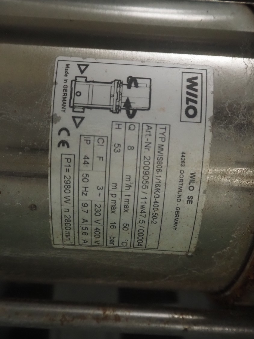 2 Wilo circulation pumps, type: MVIS806-1/16/K/3-400-50-2, 230/400 V, 3 Ph, 50 Hz, 9.7/5.6 A, capacity: 8 m³ per hour, dimensions: 250 mm x 200 mm x 580 mm.