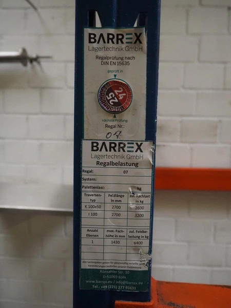 Barrex Lagertechnik GmbH steel pallet rack consisting of: 11 uprights, dimensions: (8x) 1000 mm x 1800 mm, (3x) 1100 mm x 3150 mm, 20 beams, length: (16x) 2700 mm, (4x) 1700 mm.