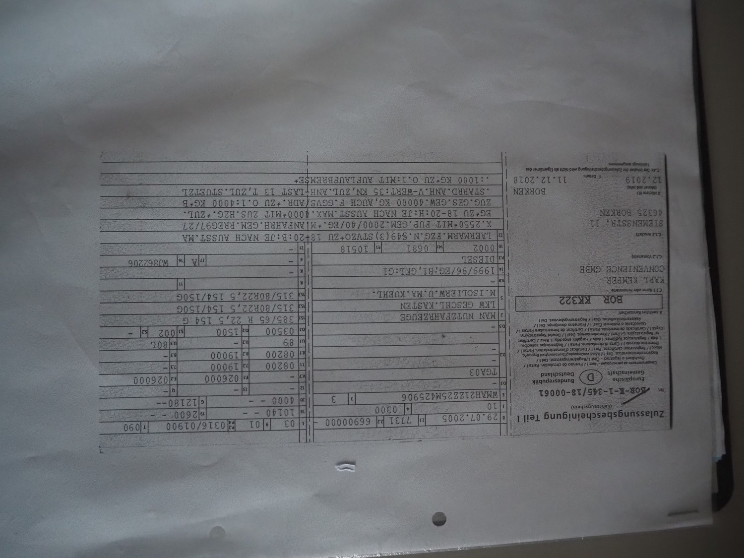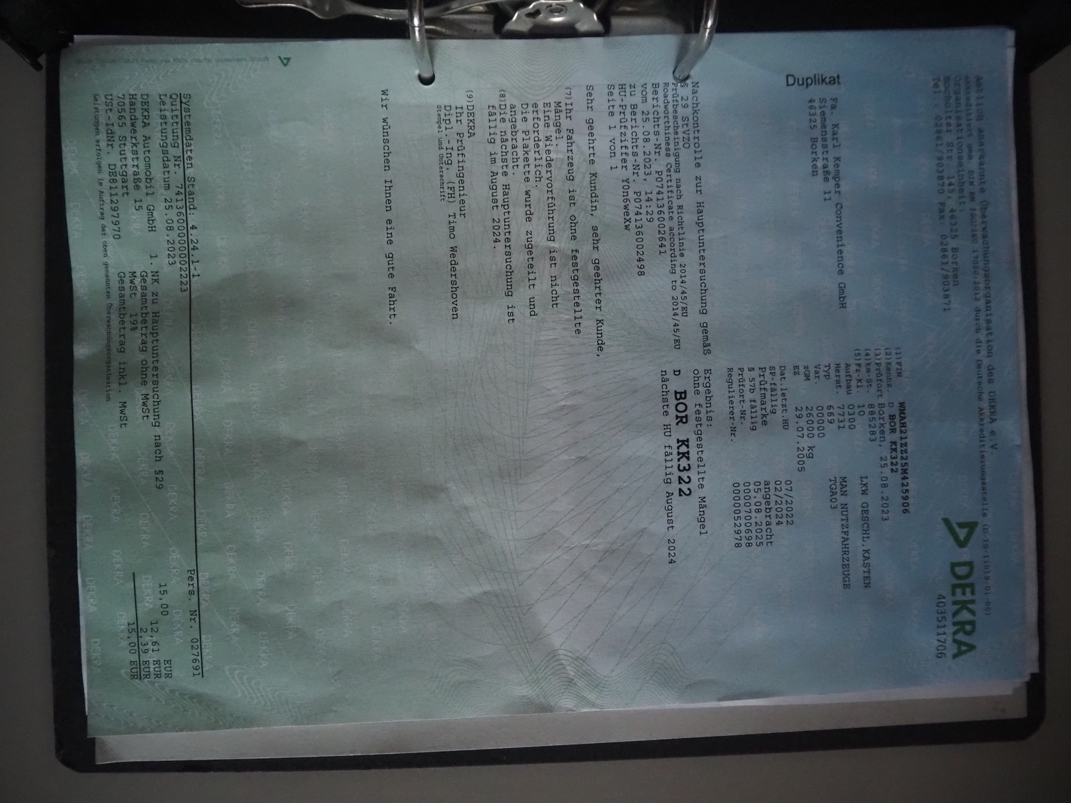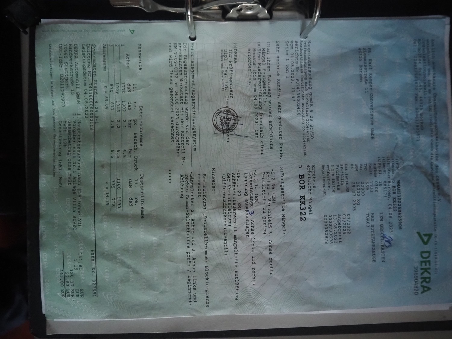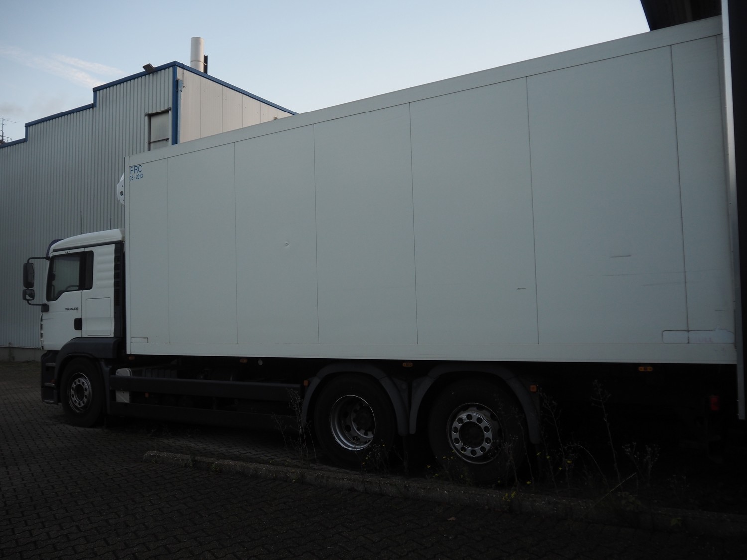 MAN truck, type: 669, number: TGA 26.430, year of construction: 1999, fuel: Diesel, weight: 26000 kg, Schmidtz Cargobull Technik cooling truck box body, type: MKO, year of construction: 2007, Thermo King cooling unit, model: T-1000R, capacity: 37 pallets, total dimensions: 10050 mm x 2800 mm x 3860 mm.