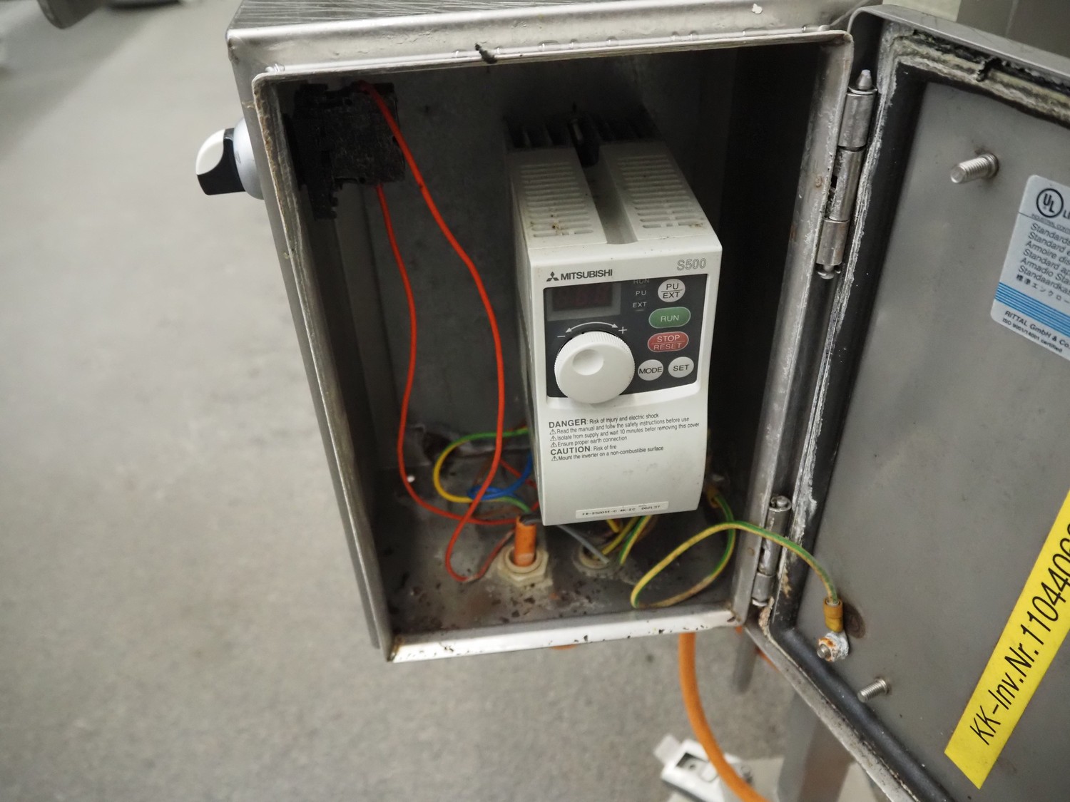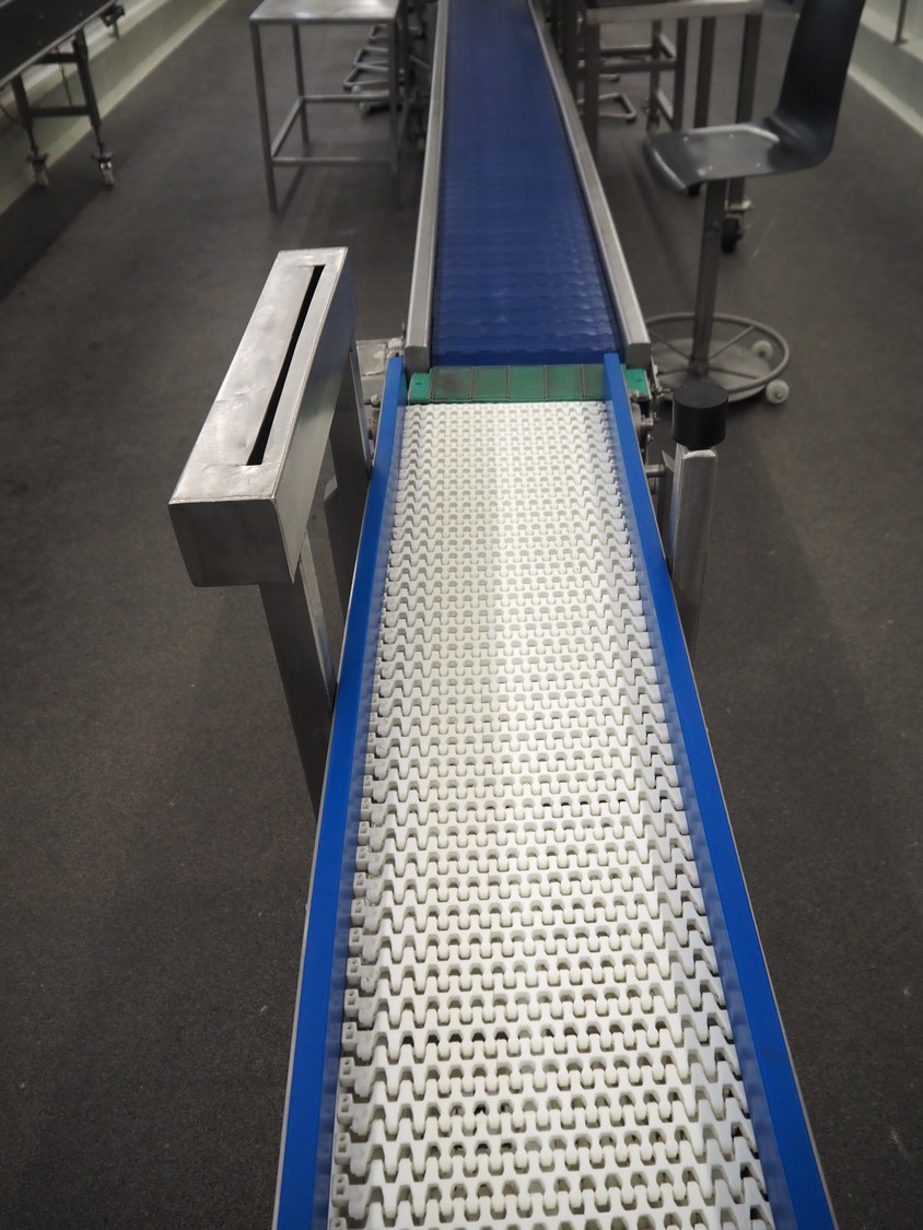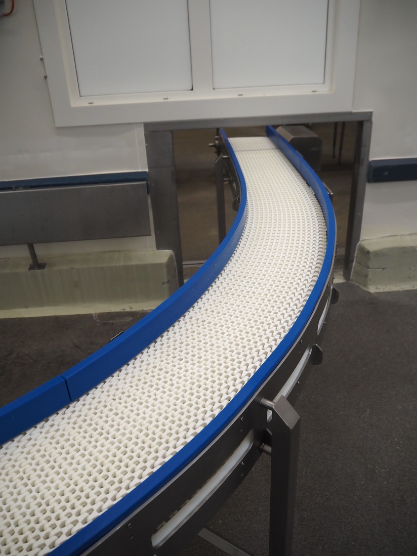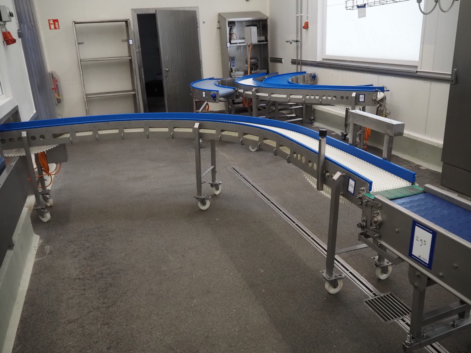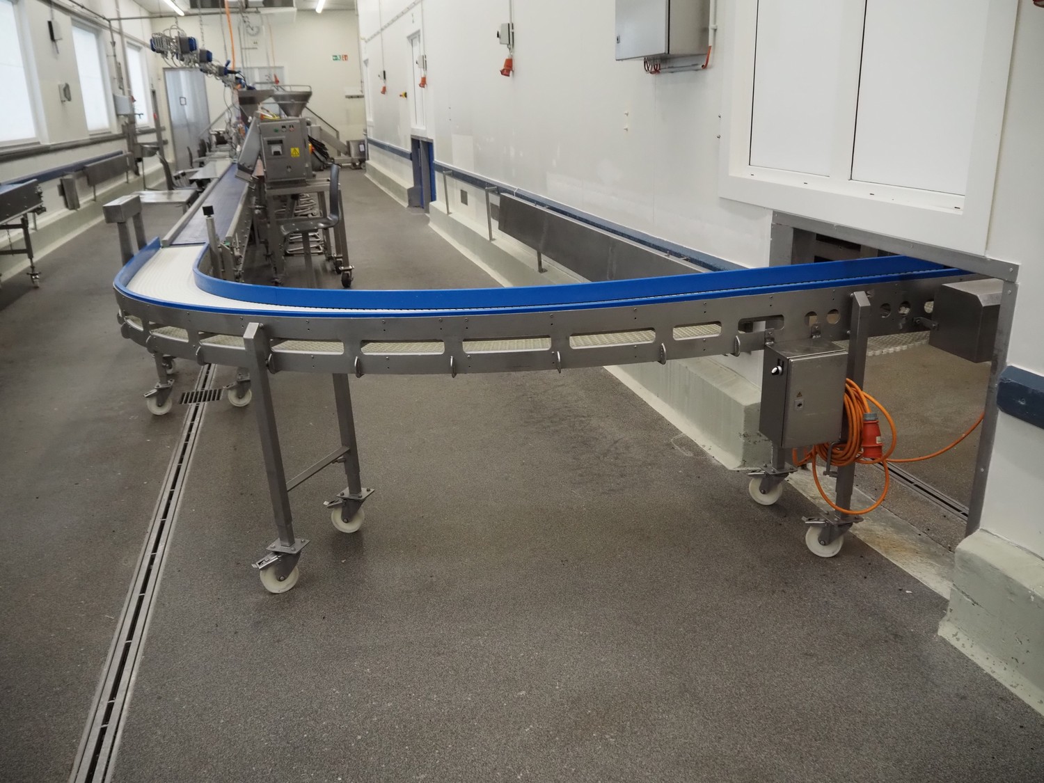 90° mobile curve conveyor, s/s frame, plastic mesh belt, belt width: 270 mm, total dimensions: 3100 mm x 2800 mm x 1150 mm.