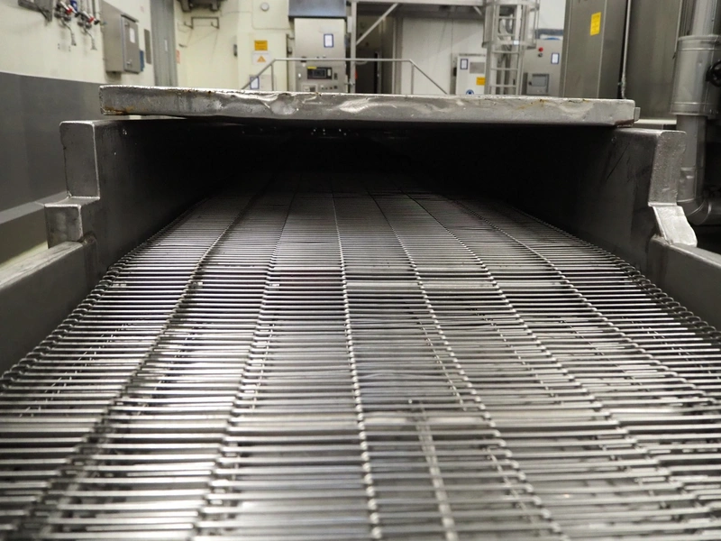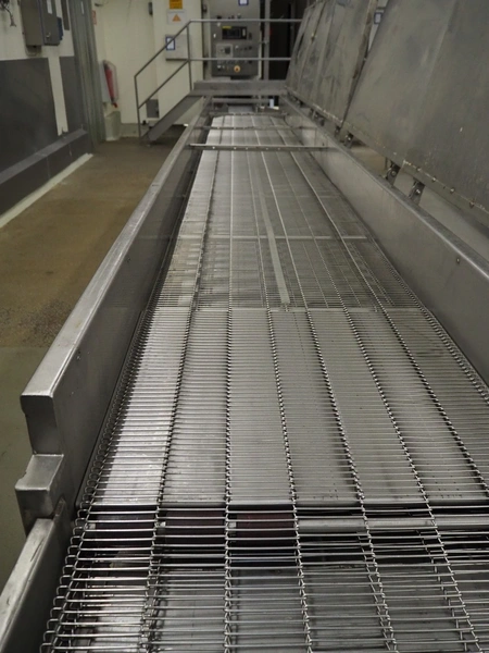 Koppens Machinefabriek B.V. mobile s/s mesh belt with covers, model: NGT 5000/600, serial number: 12, 380 V, 3 Ph, 50 Hz, s/s mesh belt, belt width: 600 mm, total dimensions: 6900 mm x 900 mm x 1150 mm.