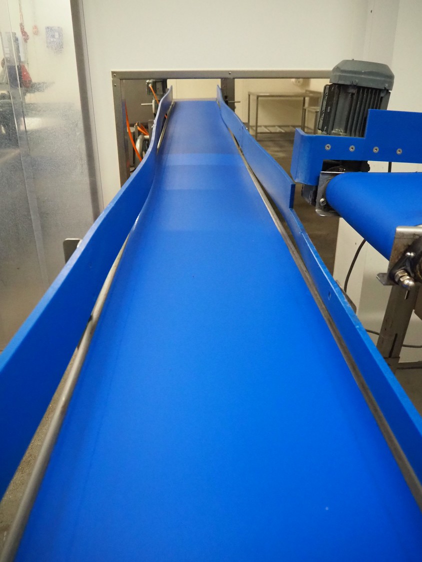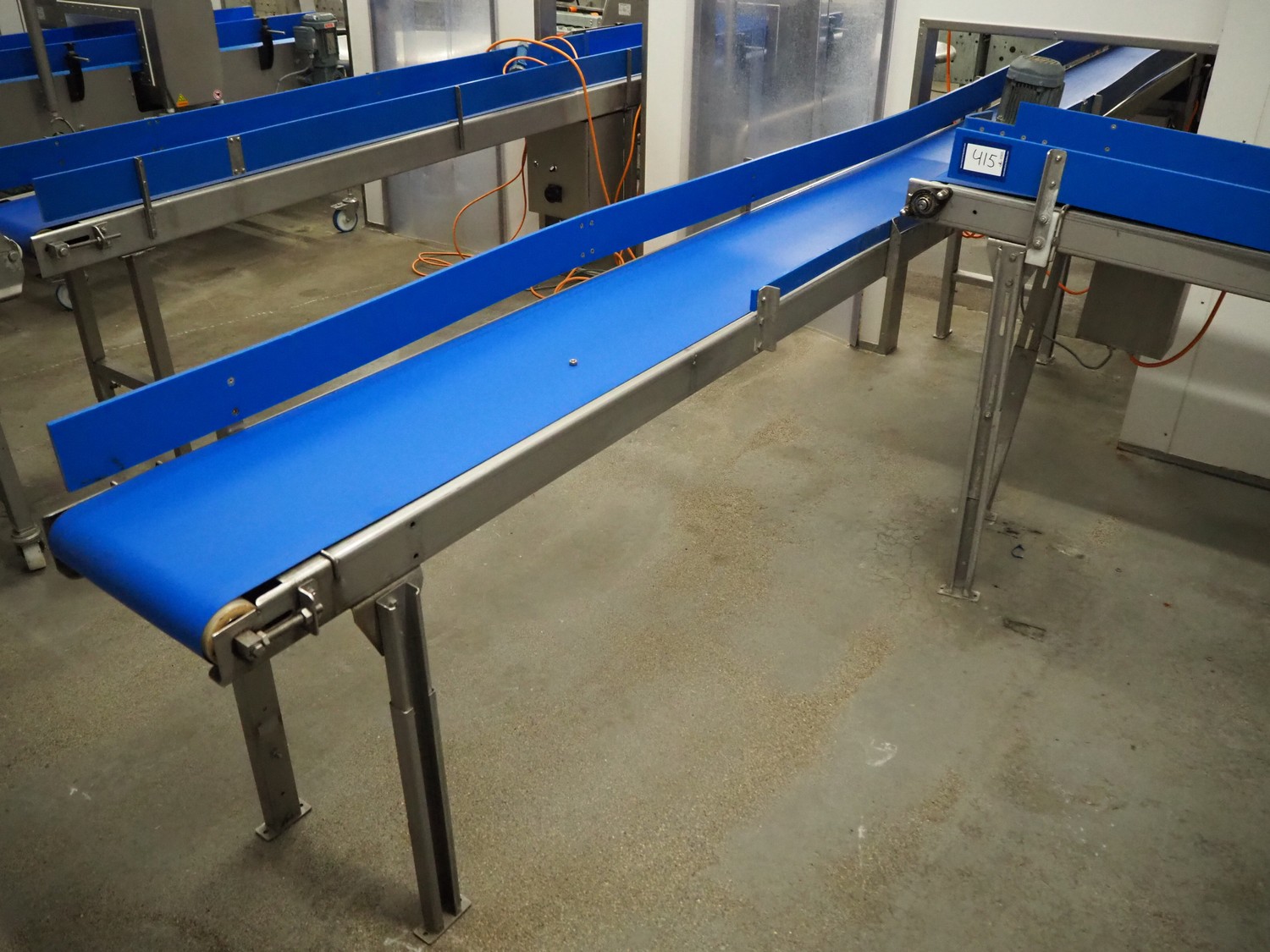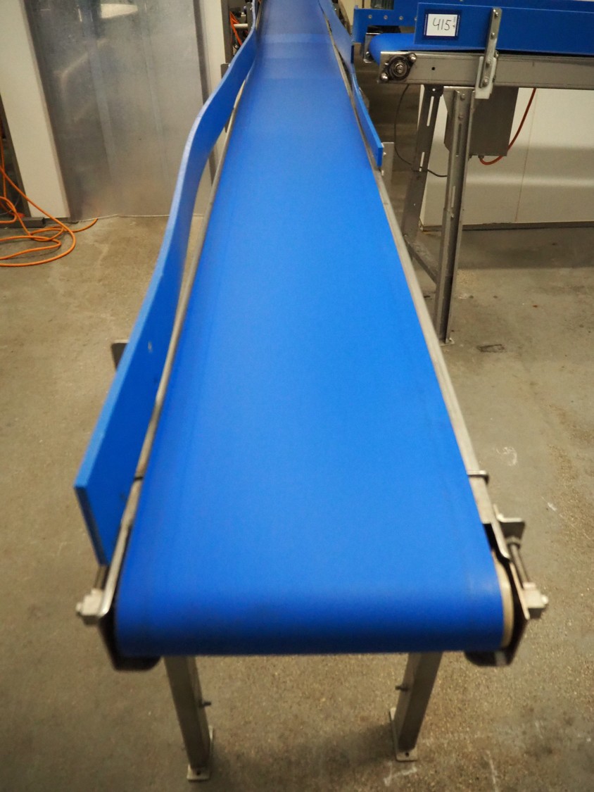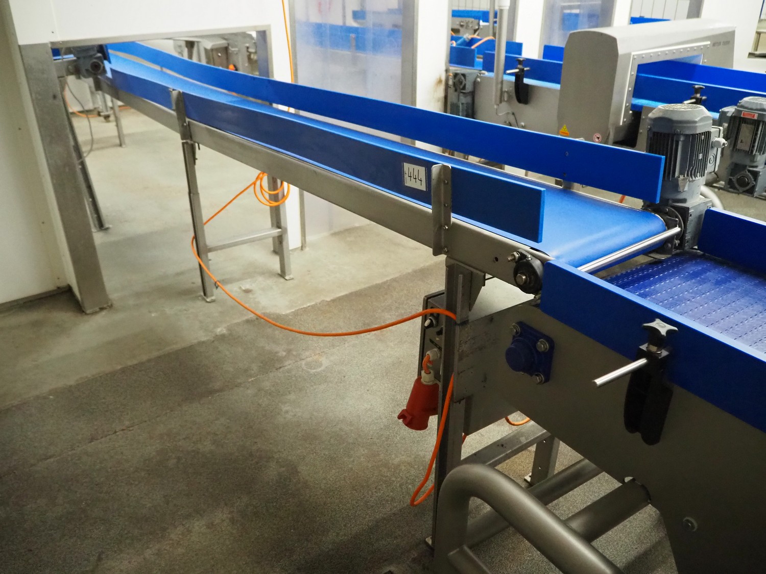 Transport belt, s/s frame, plastic belt, belt width: 340 mm, total dimensions: 5220 mm x 650 mm x 1150 mm.