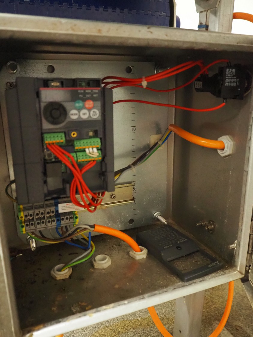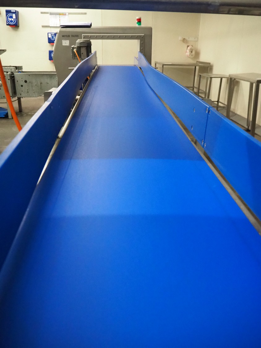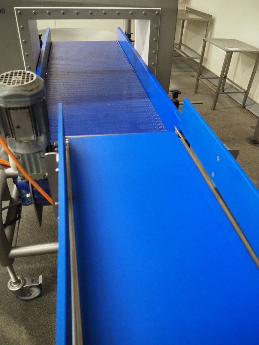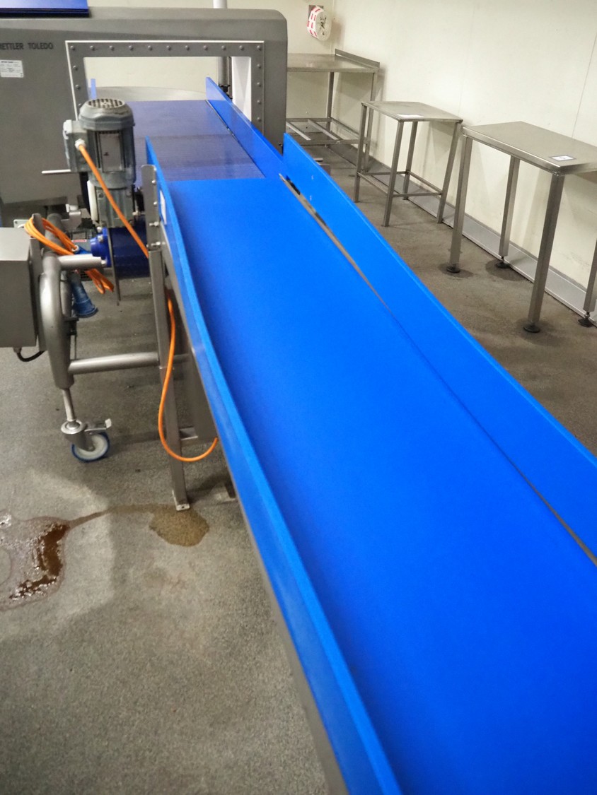 Transport belt, s/s frame, plastic belt, belt width: 340 mm, total dimensions: 5220 mm x 650 mm x 1150 mm.