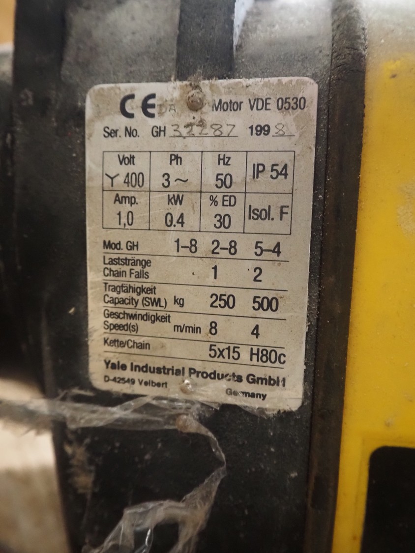 Yale chain hoist, model: GH, serial number: GH 32287, year of construction: 1998, chain falls: 1 / 2, capacity: 250 / 500 kg, dimensions: 480 mm x 170 mm x 250 mm.