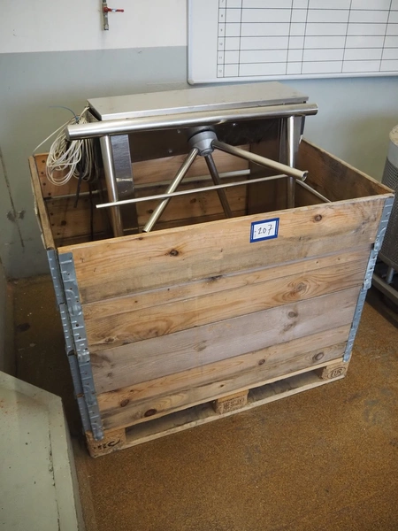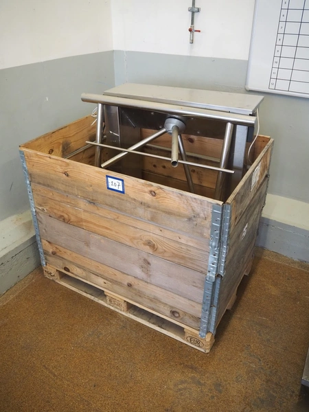 Wooden pallet box with tourniquet, dimensions: 1200 mm x 800 mm x 1400 mm. Technical condition unknown.