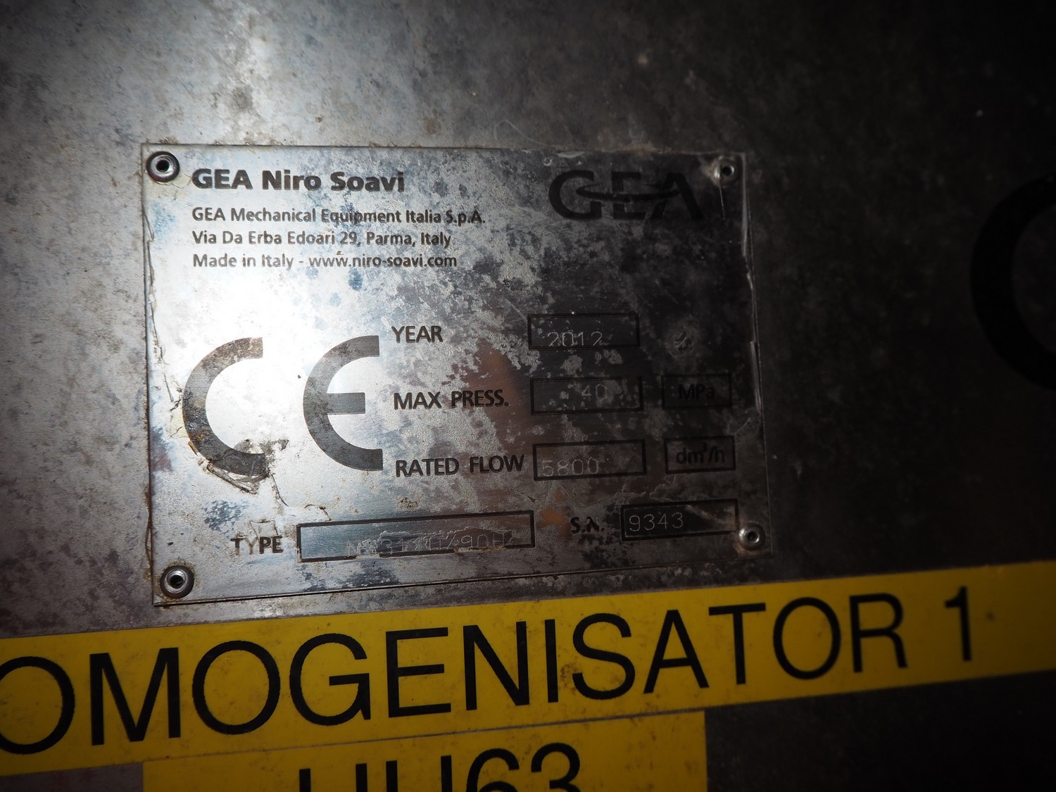 Gea Niro Soavi homogenizer, type: NS3110/90H, serial number: 9343, year of construction: 2012, maximum pressure: 40 MPa, rated flow: 5800 dm³/h, dimensions: 2600 mm x 1600 mm x 1550 mm.