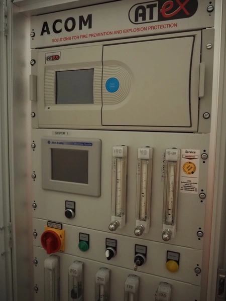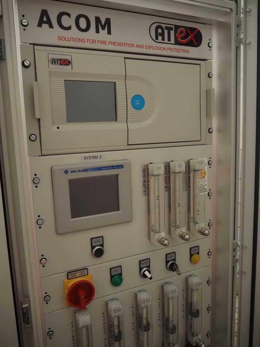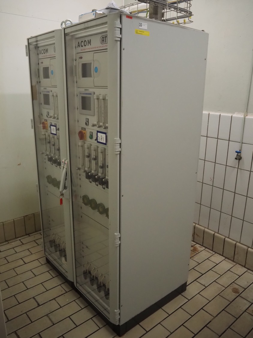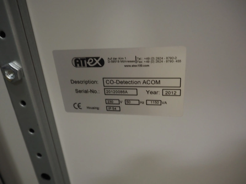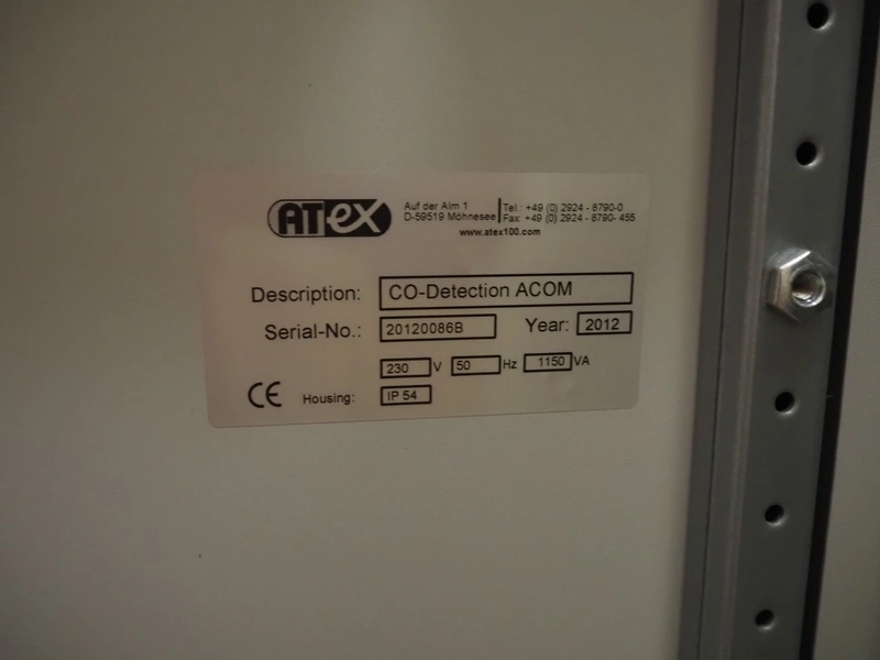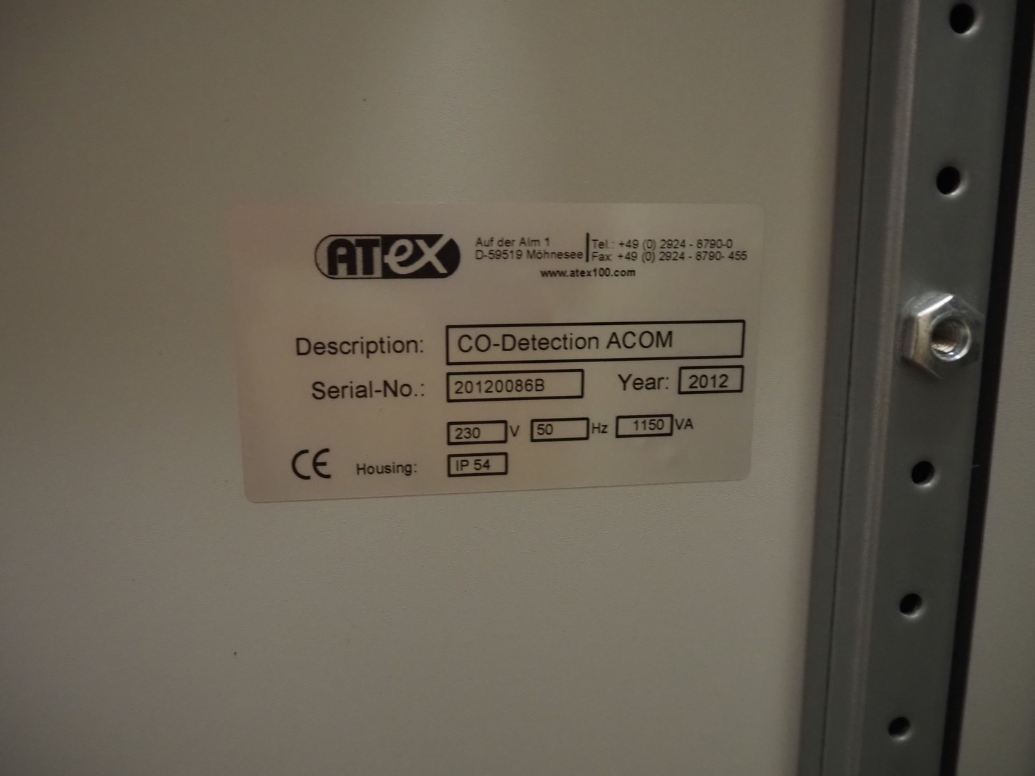 2 ATEX control cabinets for CO-Detection ACOM, serial number: 20120086B, year of construction: 2012, 230 V, 50 Hz, 1150 VA, dimensions: 1200 mm x 830 mm x 2000 mm.