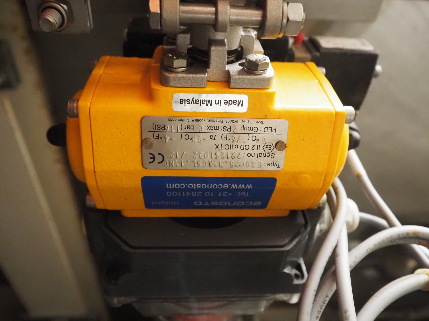 El-O-Matic lye/acid valve with Topworx switch box, dimensions: 250 mm x 200 mm x 340 mm.