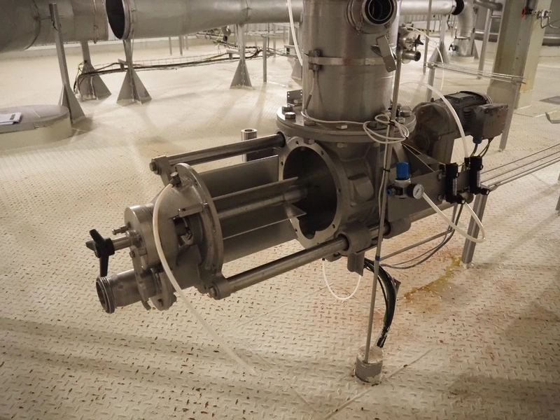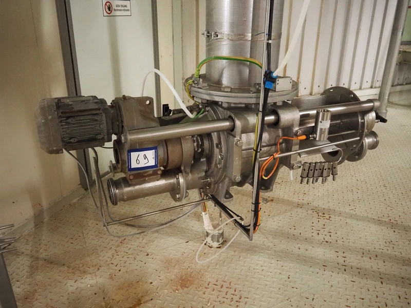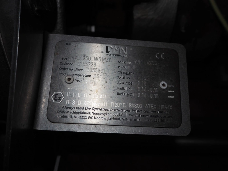 DMN Westinghouse dairy blow through rotary valve, type: BXL 250 WDMZC, serial number: RVNL142952, year of construction: 2015, Axial DS: 0.16 mm, Axial NDS: 0.16 mm, Radial DS: 0.14-0.16 mm, Radial NDS: 0.14-0.16 mm, product temperature: 65 °C, 16 rpm, dimensions: 1400 mm x 600 mm x 550 mm. Rotor is damaged.