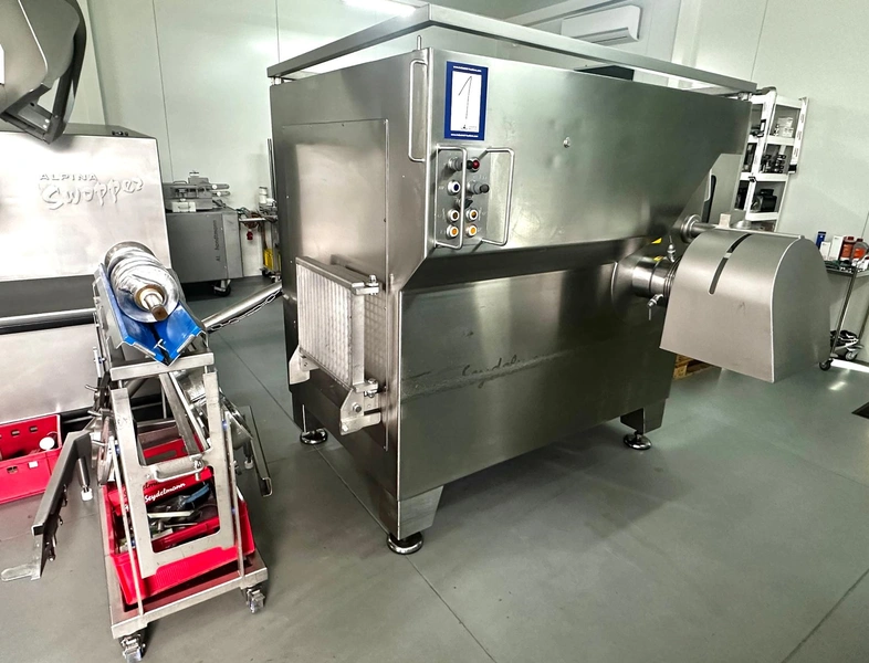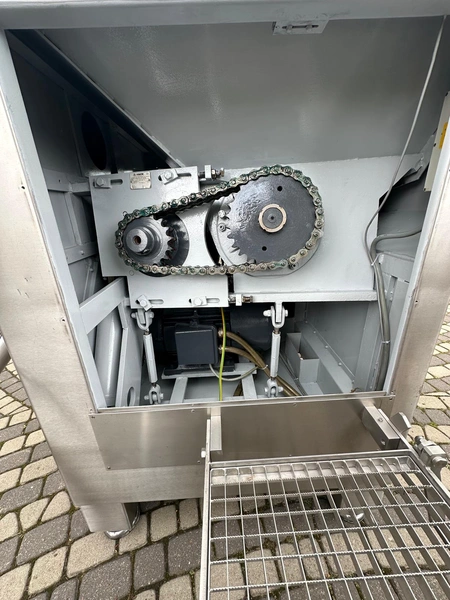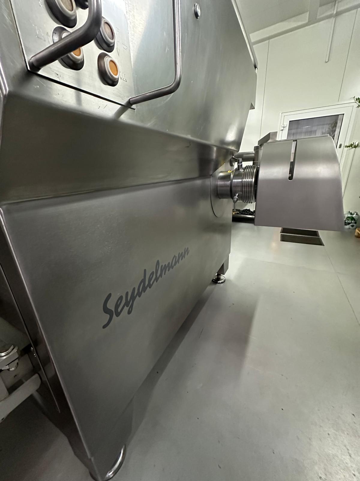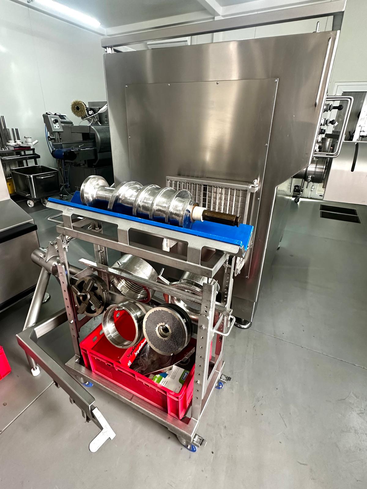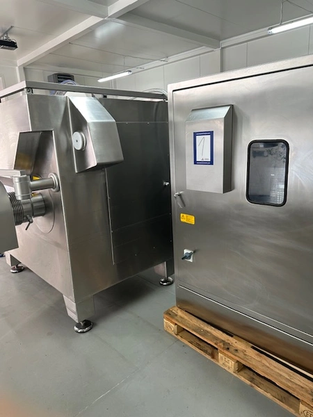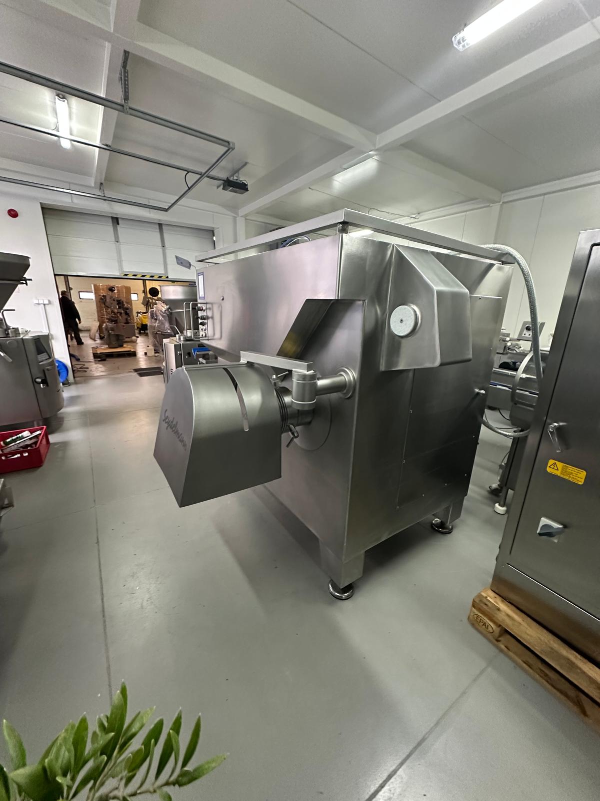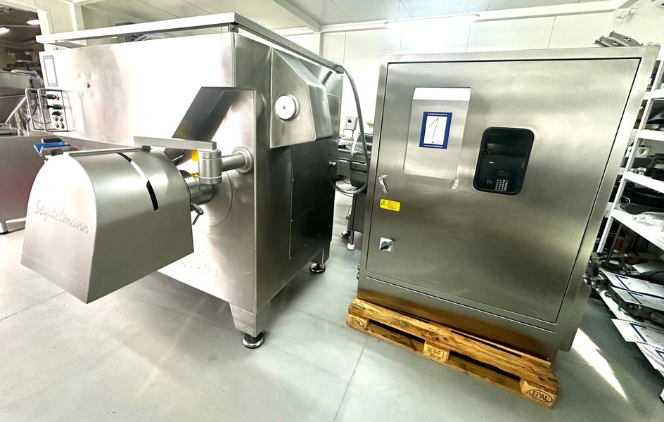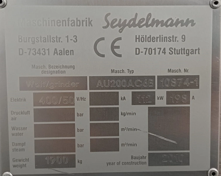 Seydelmann frozen meat grinder with lifter for 200 liter meat bins, type: AU200AC6B, machine number: 10874-1, year of construction: 2010, 400 V, 50 Hz, 198 A, 112 kW, weight: 1900 kg, plate diameter: 200 mm, total dimensions: 2050 mm x 1550 mm x 2150 mm. Including s/s switch cabinet, dimensions: 1400 mm x 450 mm x 1850 mm and s/s trolley for parts.