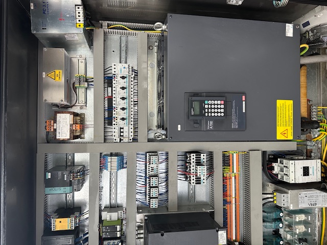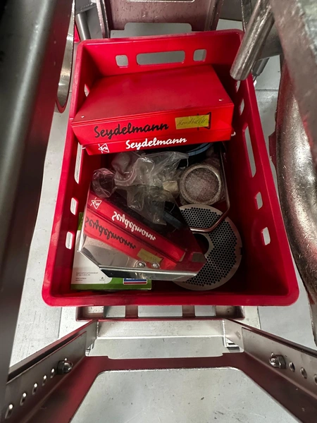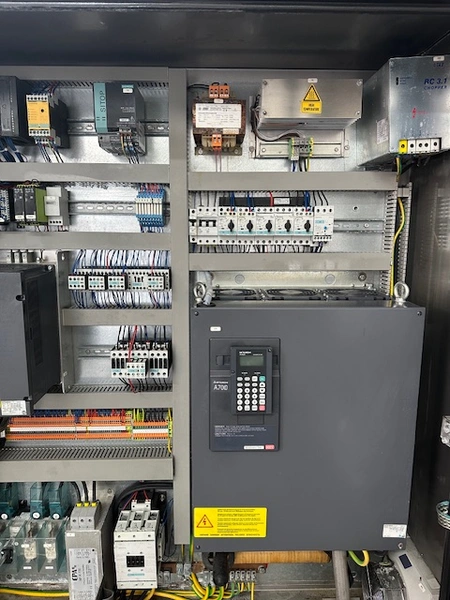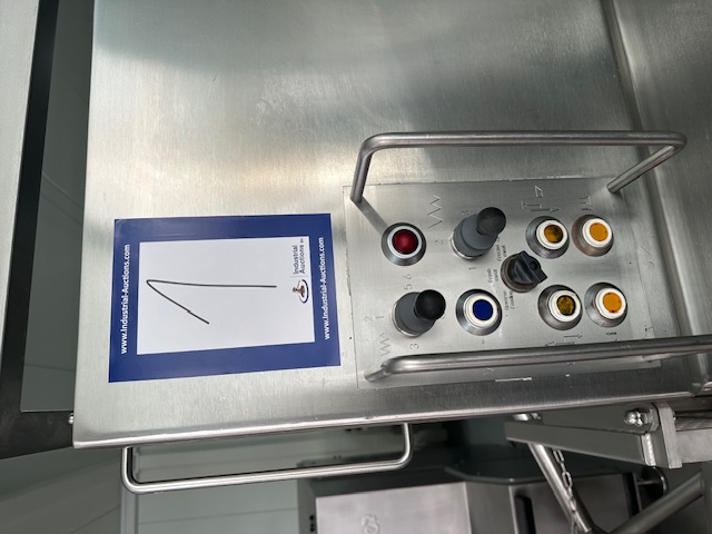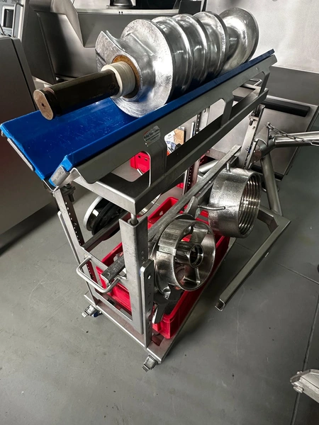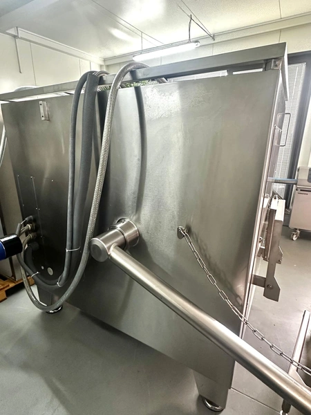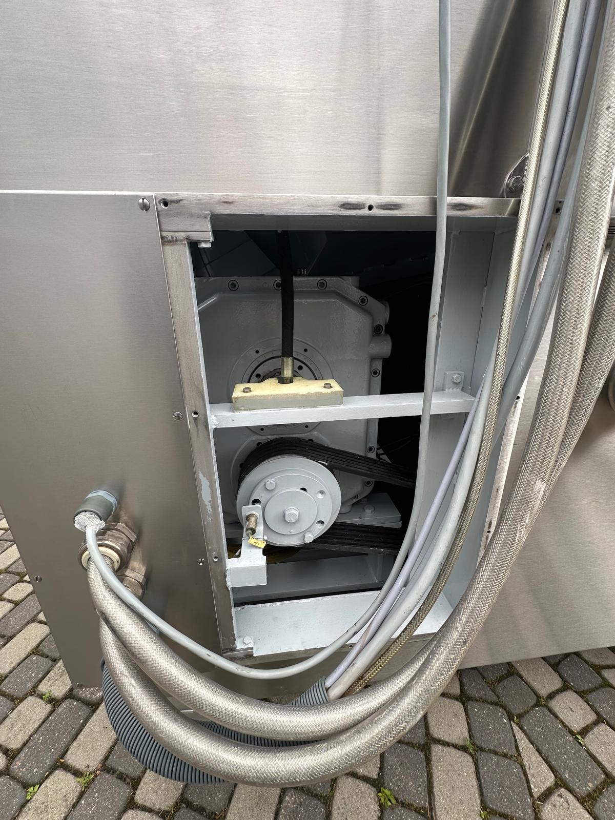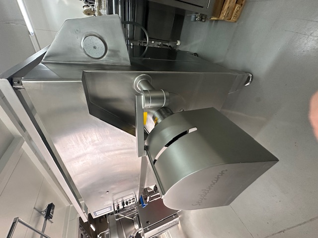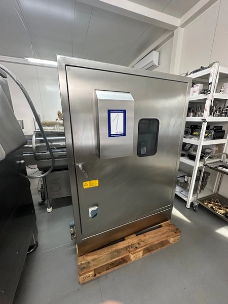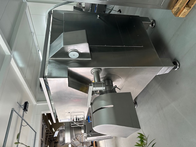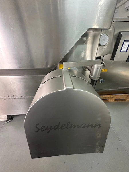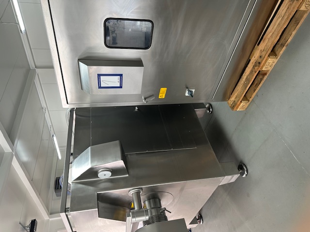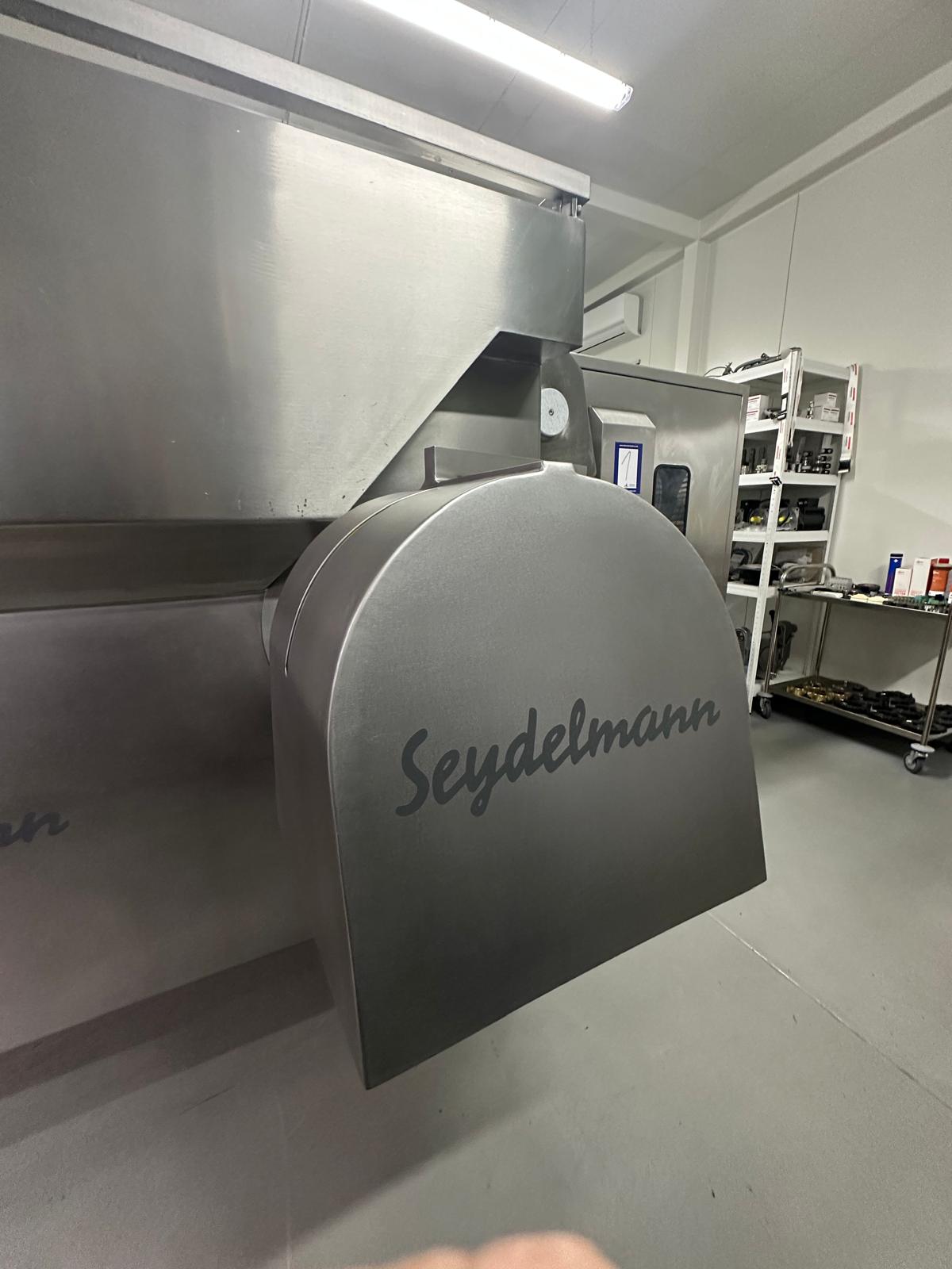 Seydelmann frozen meat grinder with lifter for 200 liter meat bins, type: AU200AC6B, machine number: 10874-1, year of construction: 2010, 400 V, 50 Hz, 198 A, 112 kW, weight: 1900 kg, plate diameter: 200 mm, total dimensions: 2050 mm x 1550 mm x 2150 mm. Including s/s switch cabinet, dimensions: 1400 mm x 450 mm x 1850 mm and s/s trolley for parts.