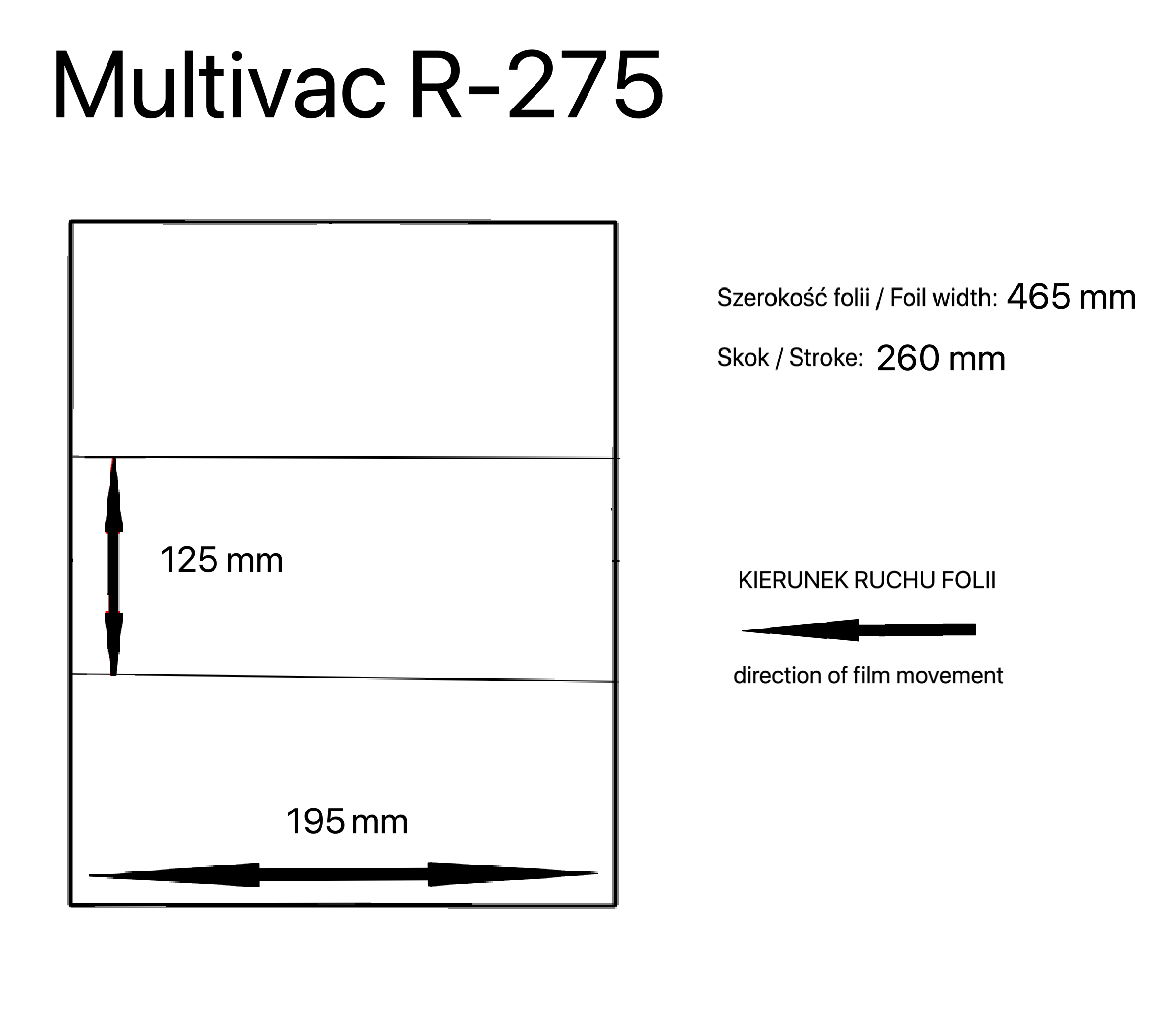Multivac thermoformer, type: R275, machine number: 162415, year of construction: 2013, 400/230 V, 3 Ph, 49/63 A, 16.5 kW, dye: (3x) 195 mm x 125 mm, hard film, film width: 465 mm, index: 260 mm, dimensions: 10000 mm x 1300 mm x 2300 mm.