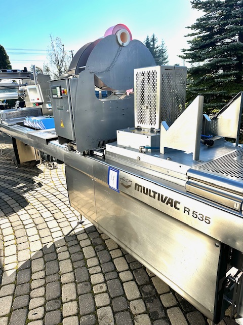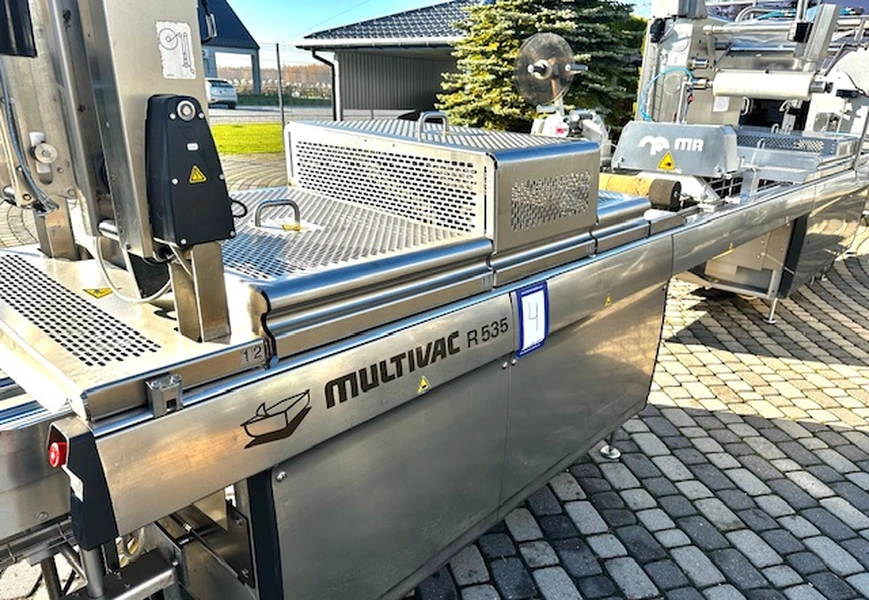 Multivac thermoformer with film roll holder, type: R535, machine number: 140005, year of construction: 2011, 400 V, 3 Ph, 50 Hz, 67/80 A, 27 A, dye: (8x) 160 mm x 120 mm, film width: 530 mm, index: 360 mm, total dimensions: 13700 mm x 1300 mm x 2300 mm and 1500 mm x 1200 mm x 600 mm.