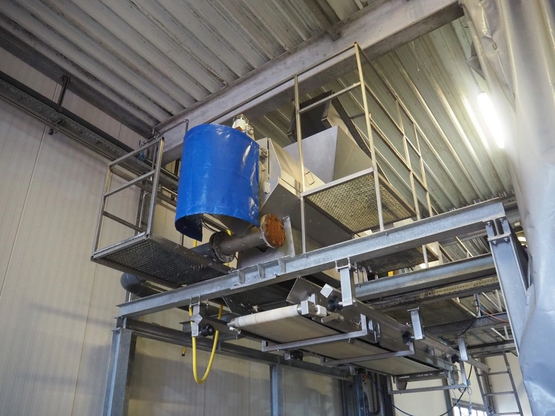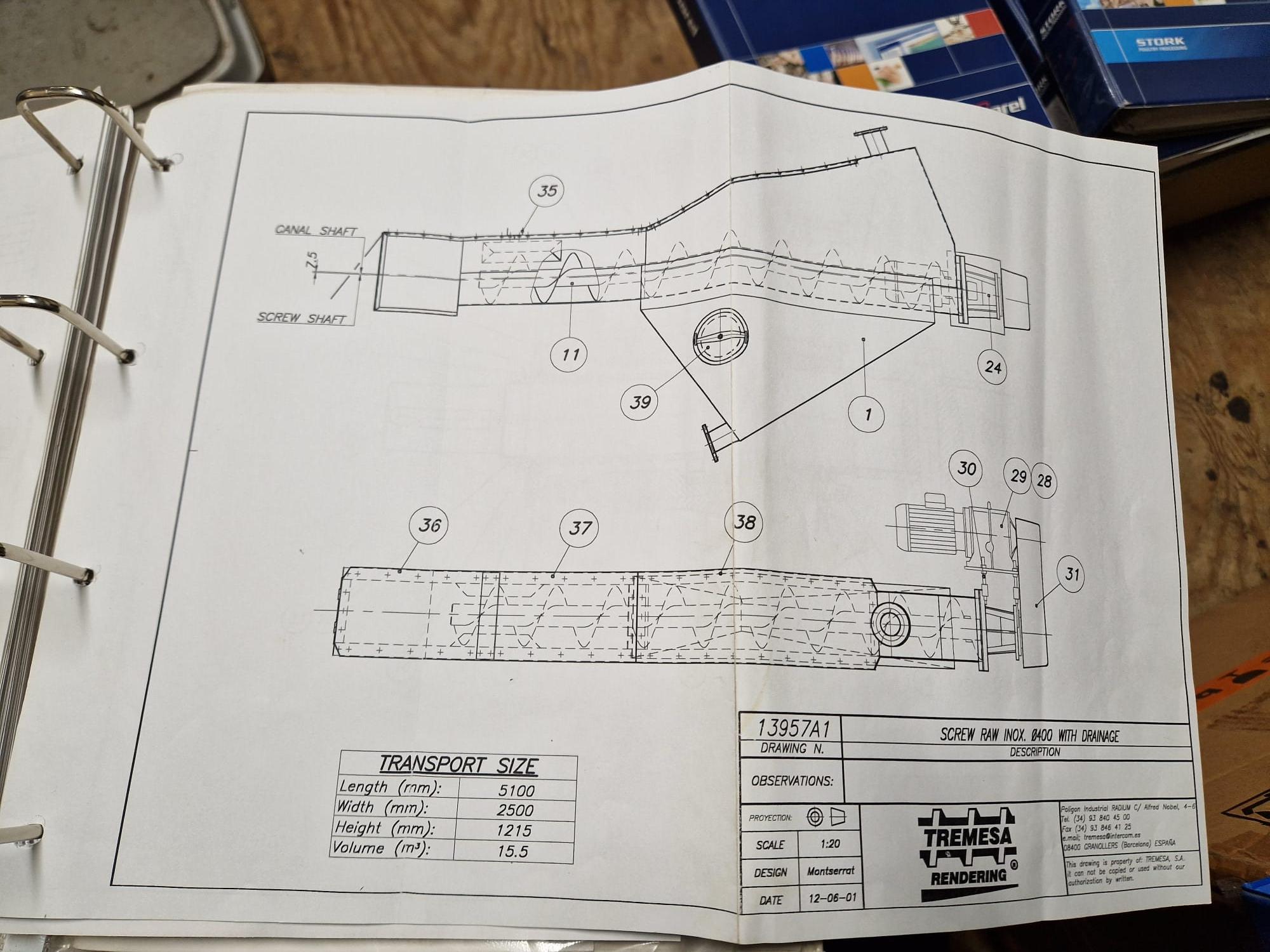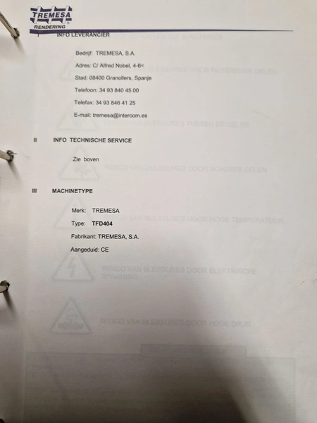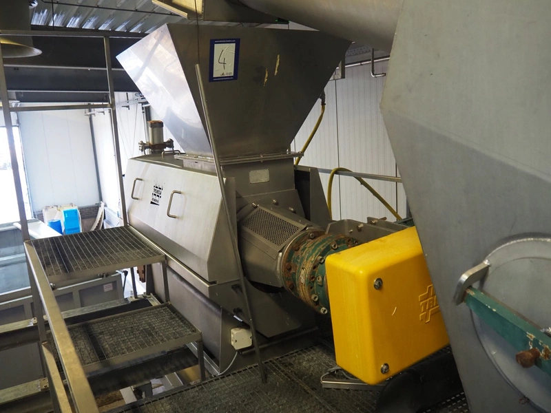Tremesa, S.A. feather press installation consisting of:Tremesa, S.A. dewatering screw, dimensions: 5000 mm x 900 mm x 2600 mm.Tremesa, S.A. feather press, type: TFD404, serial number: S 8908, year of construction: 2001, 7.5 kW, dimensions: 2900 mm x 1050 mm x 1800 mm.Steel platform, dimensions: 3800 mm x 5600 mm x 5450 mm.Without outfeed conveyor.