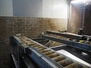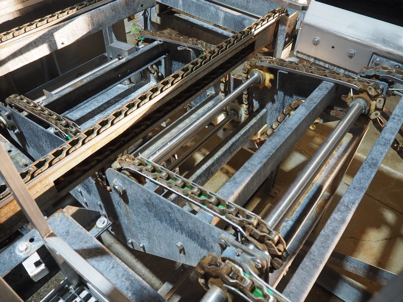 Stork live-bird unloading system with crate washing machine, number: 94-03-22, total belt width: 1200 mm, plastic outfeed belt, belt width: 1600 mm, clearance washing machine: 1200 mm x 1400 mm, total dimensions: 10000 mm x 2600 mm x 3400 mm.