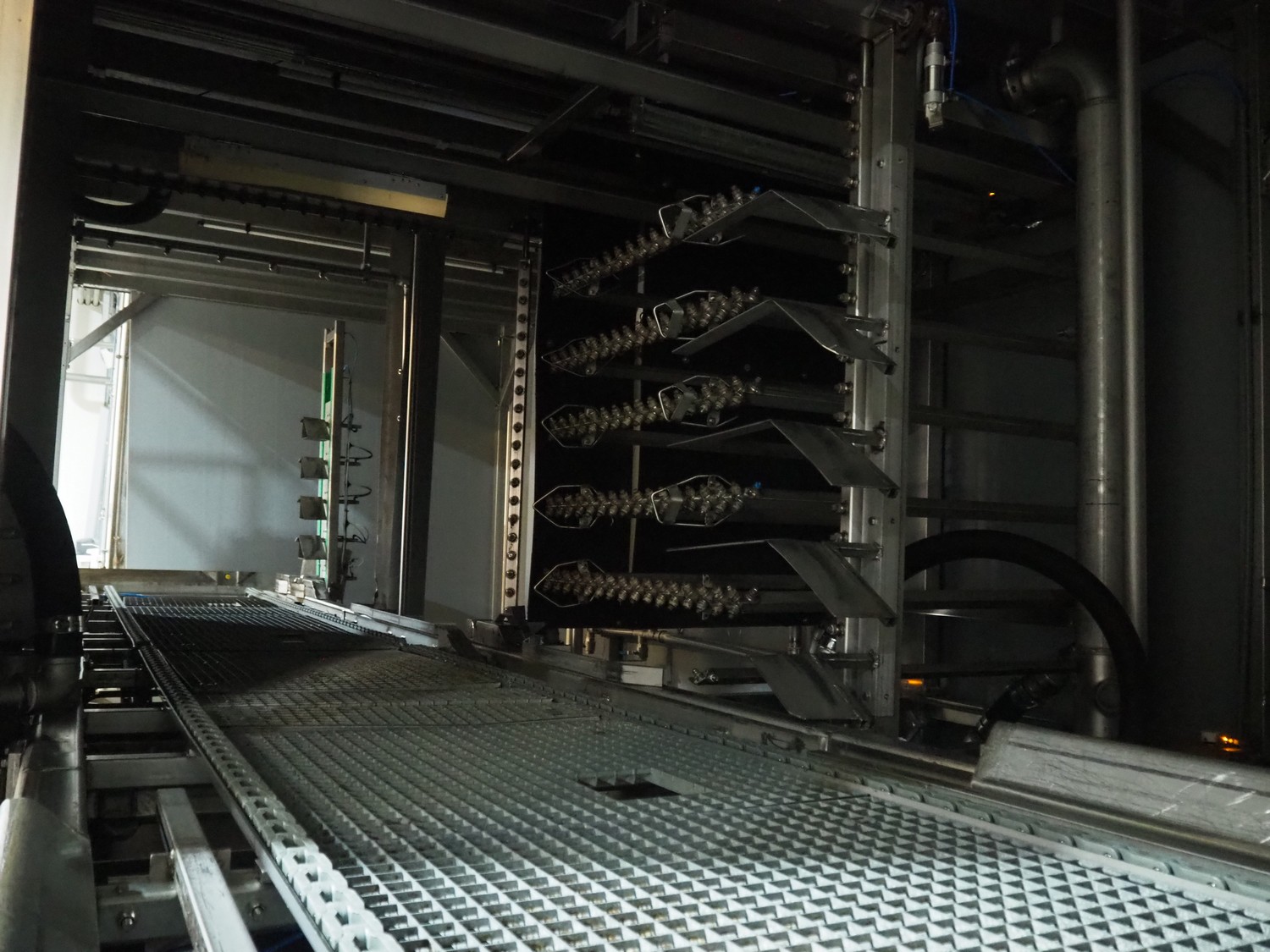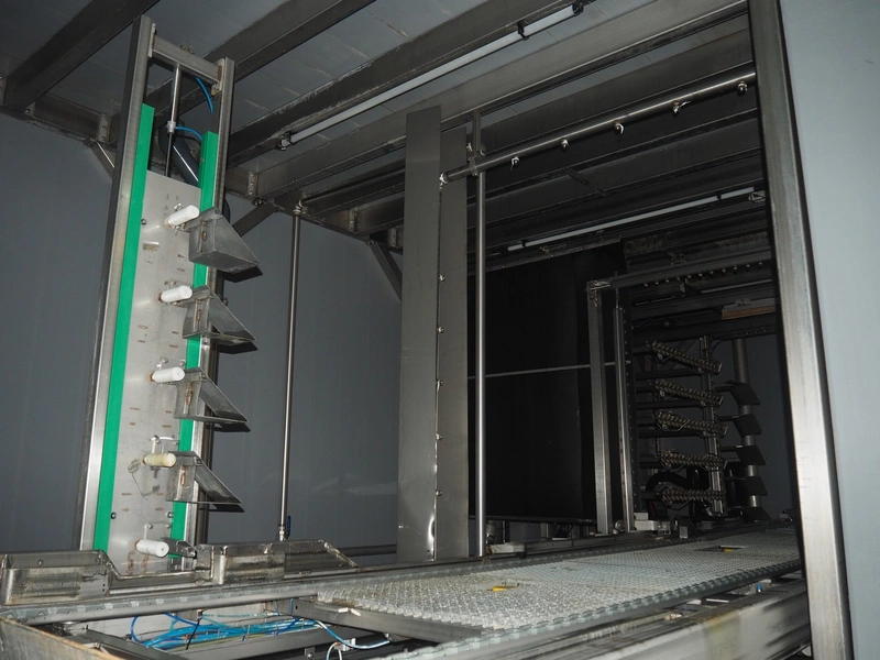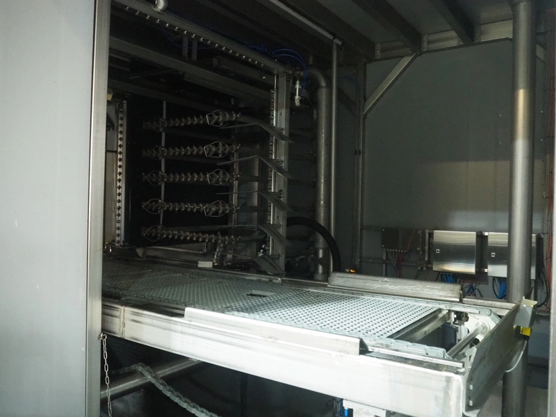 Washing machine for bird crates, total belt width: 1200 mm, clearance: 1200 mm x 1600 mm, total dimensions: 5000 mm x 10000 mm x 6400 mm.