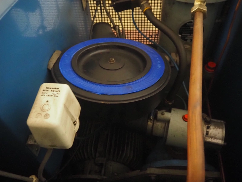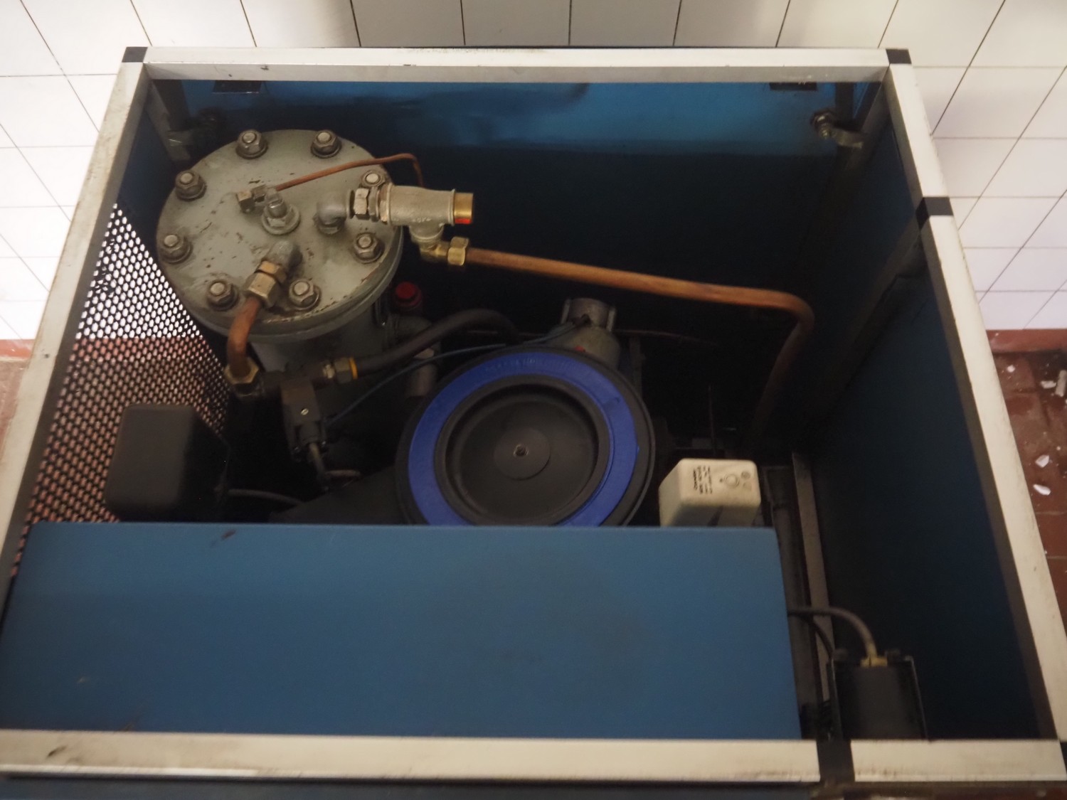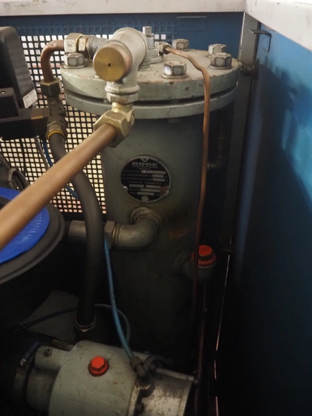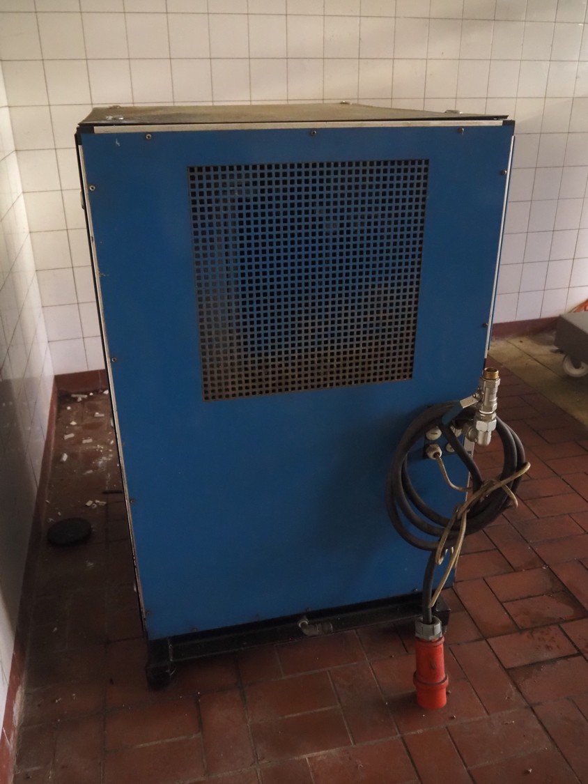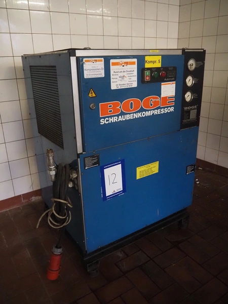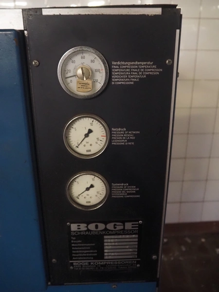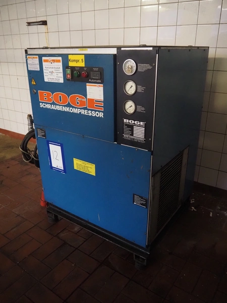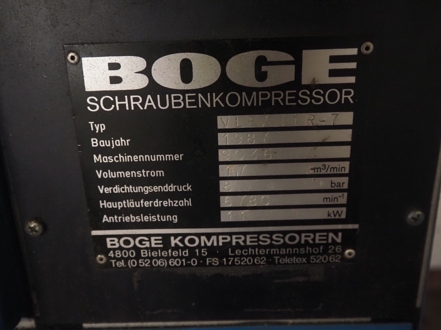 Boge Kompressoren screw air compressor, type: VLEA11R-7, machine number: 9036, year of construction: 1987, 11 kW, 8 bar, volume: 1.7 m³ per minute, dimensions: 960 mm x 710 mm x 1170 mm.