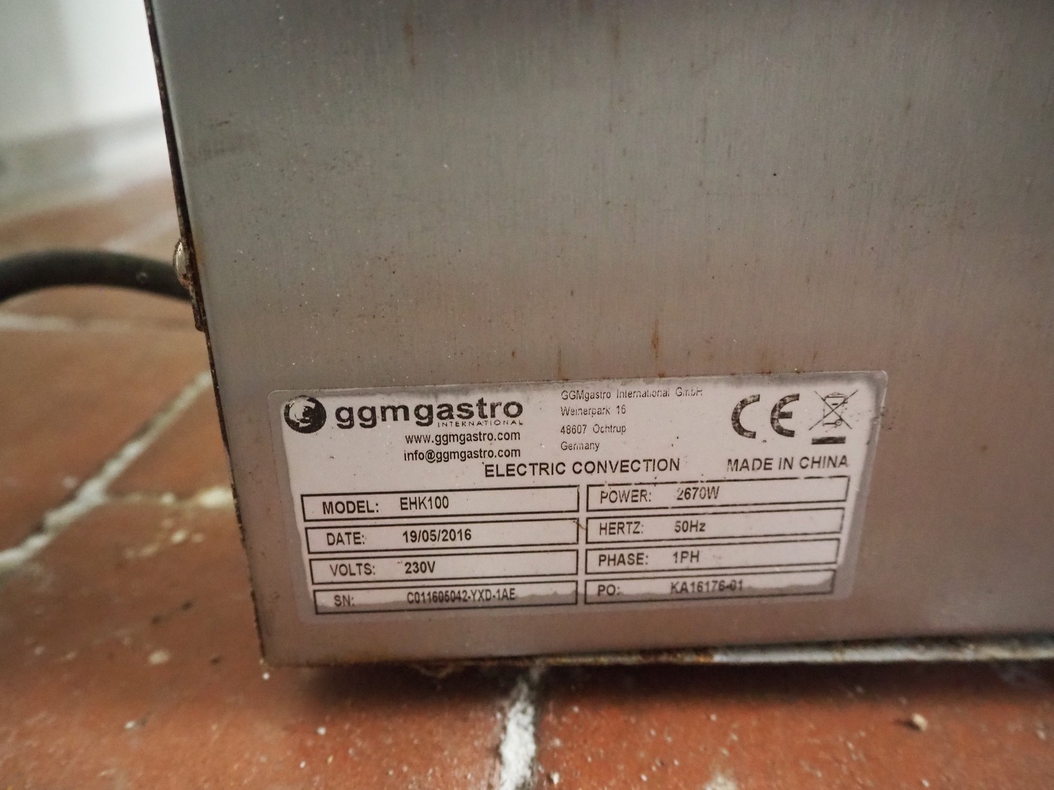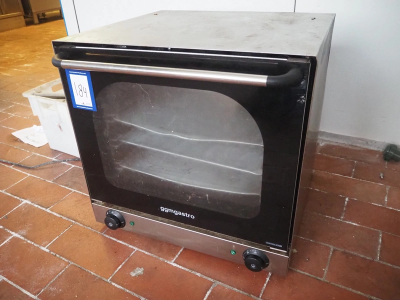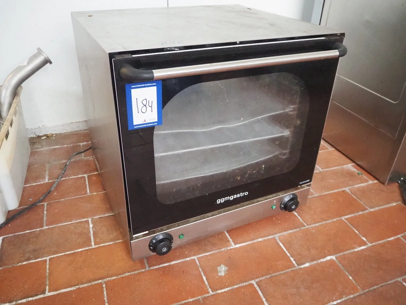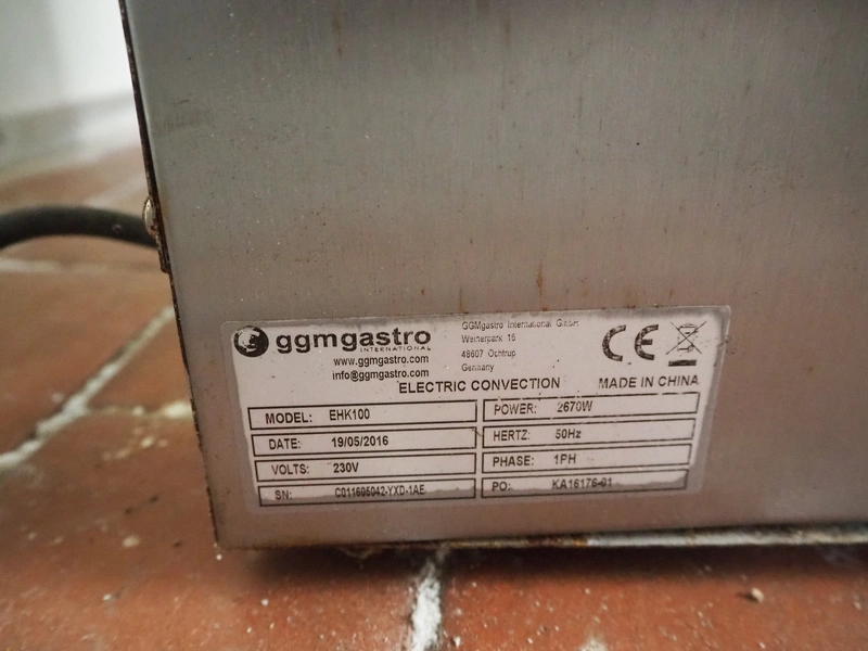 GGM Gastro International GmbH oven, model: EHK100, serial number: C011605042-YXD-1AE, year of construction: 19/05/2016, 230 V, 1 Ph, 50 Hz, 2670 W, 4 floors, dimensions each floor: 320 mm x 450 mm, total dimensions: 600 mm x 600 mm x 570 mm.