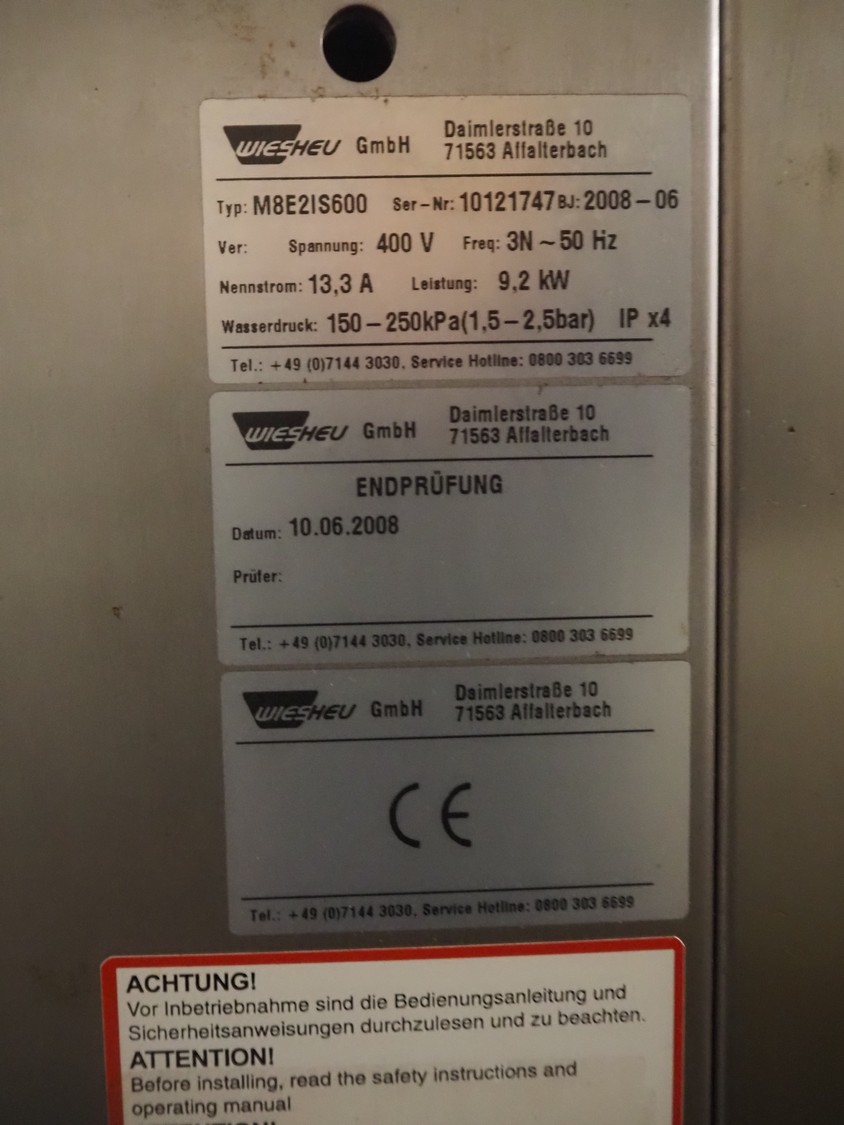 Wiesheu GmbH mobile oven, type: M8E2IS600, serial number: 10121747, year of construction: 2008-06, 400 V, 3 Ph, 50 Hz, 13.3 A, 9.2 kW, 4 floors, dimensions floors: (4x) 635 mm x 370 mm, total dimensions: 1000 mm x 950 mm x 1400 mm.