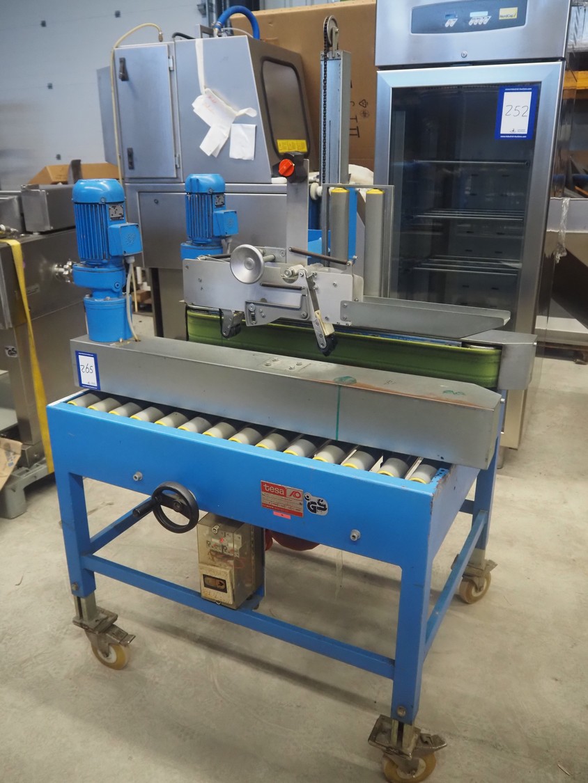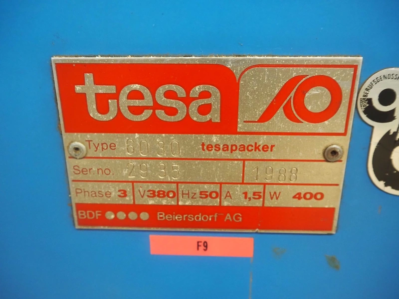 Tesa mobile box closing machine, type: 6030, serial number: 2935, year of construction: 1988, 380 V, 3 Ph, 50 Hz, 1.5 A, 400 W, clearance: 315 mm x 205 mm, total dimensions: 1080 mm x 950 mm x 1800 mm. Lot located in Winsen (DE), viewing and pick up in consultation with Industrial Auctions B.V.
