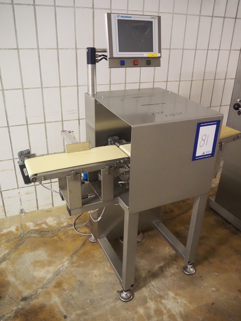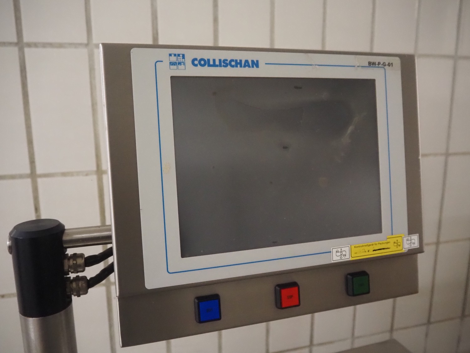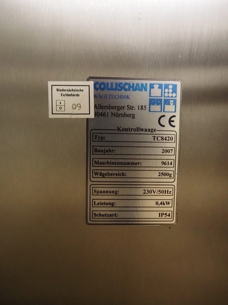 Collischan checkweigher with rejector, type: TC8420, number: 9614, year of construction: 2007, weight: 250 kg, 230 V, 50 Hz, 0.4 kW, plastic belt, belt width: 155 mm, total dimensions: 1300 mm x 600 mm x 1500 mm.