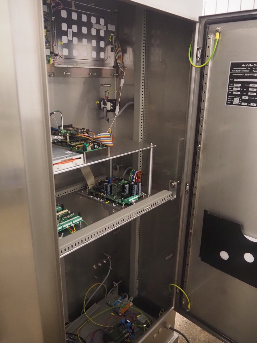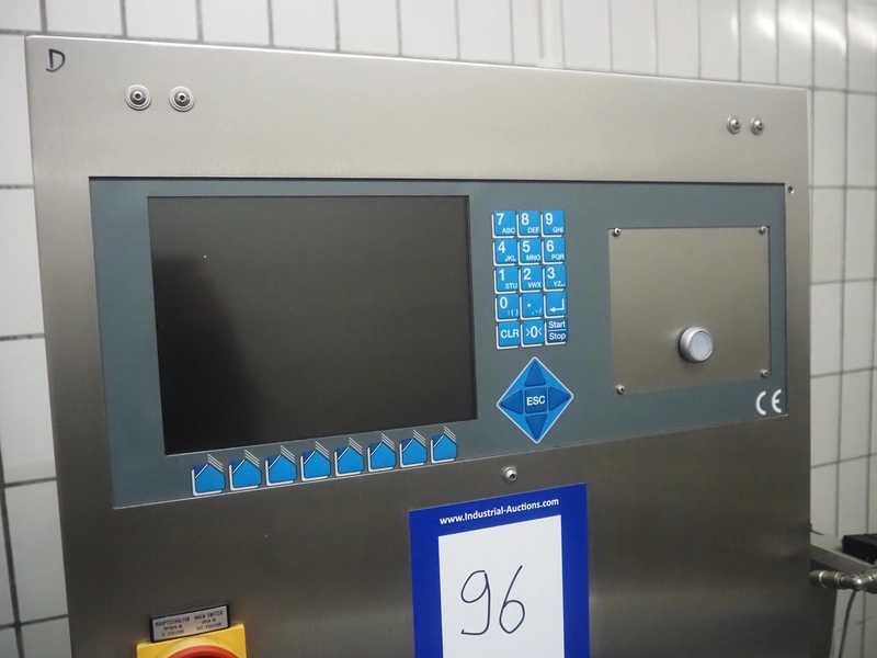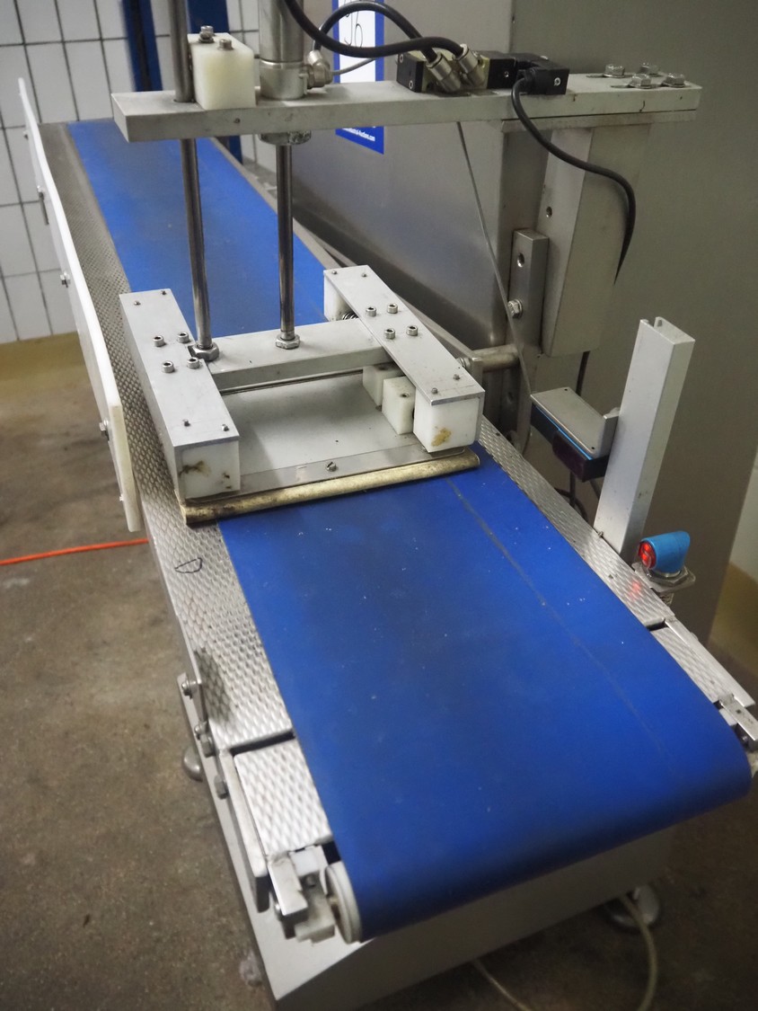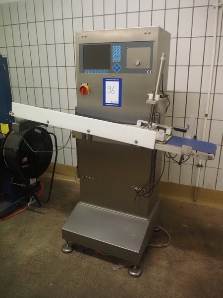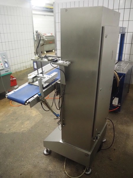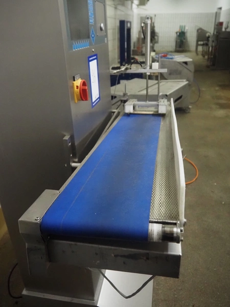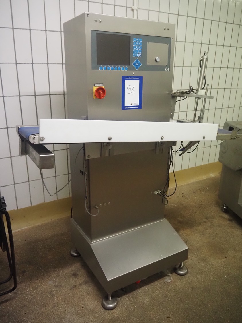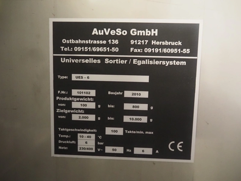 AuVeSo GmbH checkweigher with label press, type: UES-6, fabrication number: 101102, year of construction: 2010, product weight: 100 till 800 gram, target weight: 2000 gram till 10000 gram, capacity: 100 per minute, temperature: 10 till 40° Celsius, 6 bar, plastic belt, belt width: 200 mm, total dimensions: 1400 mm x 700 mm x 1700 mm.