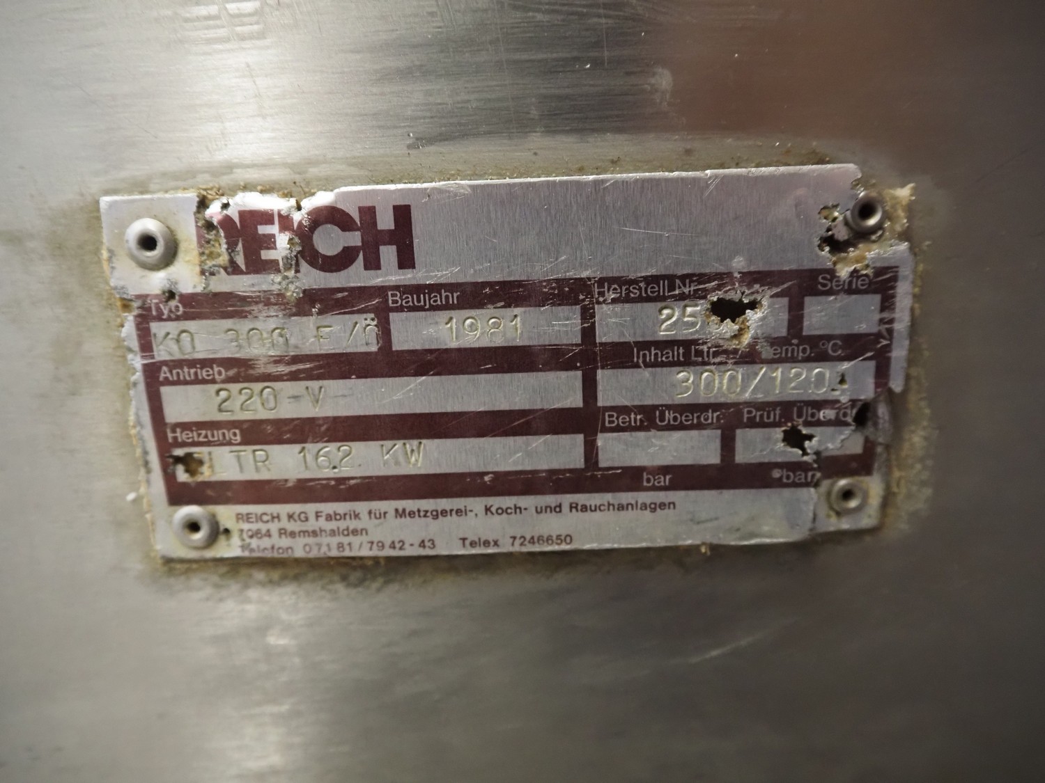Reich cooking vessel, type: KO 300 E/Ö, year of construction: 1981, 220 V, 16.2 kW, inside dimensions: 930 mm x 650 mm x 550 mm, total dimensions: 1100 mm x 1200 mm x 1100 mm. With switch cabinet. Lot located in Winsen (DE), viewing and pick up in consultation with Industrial Auctions B.V.