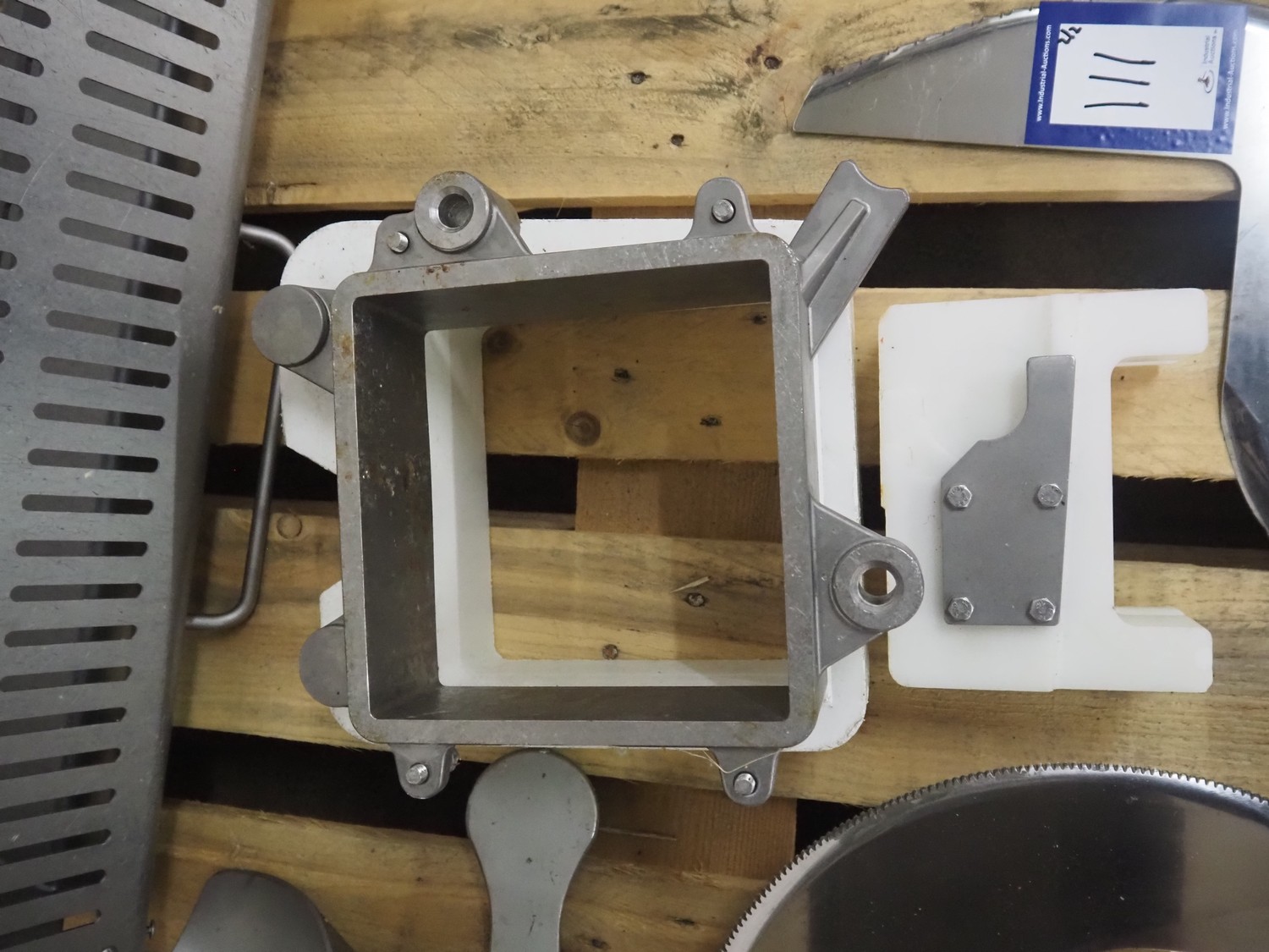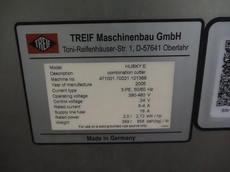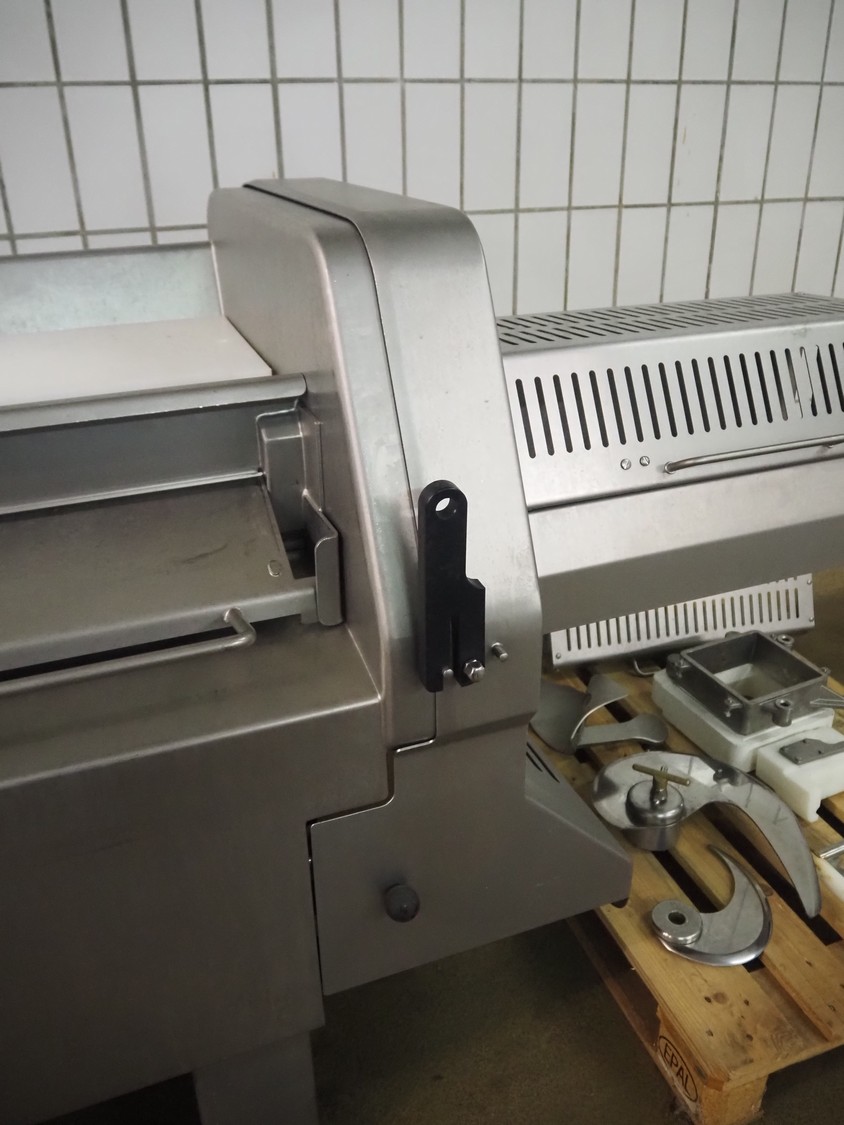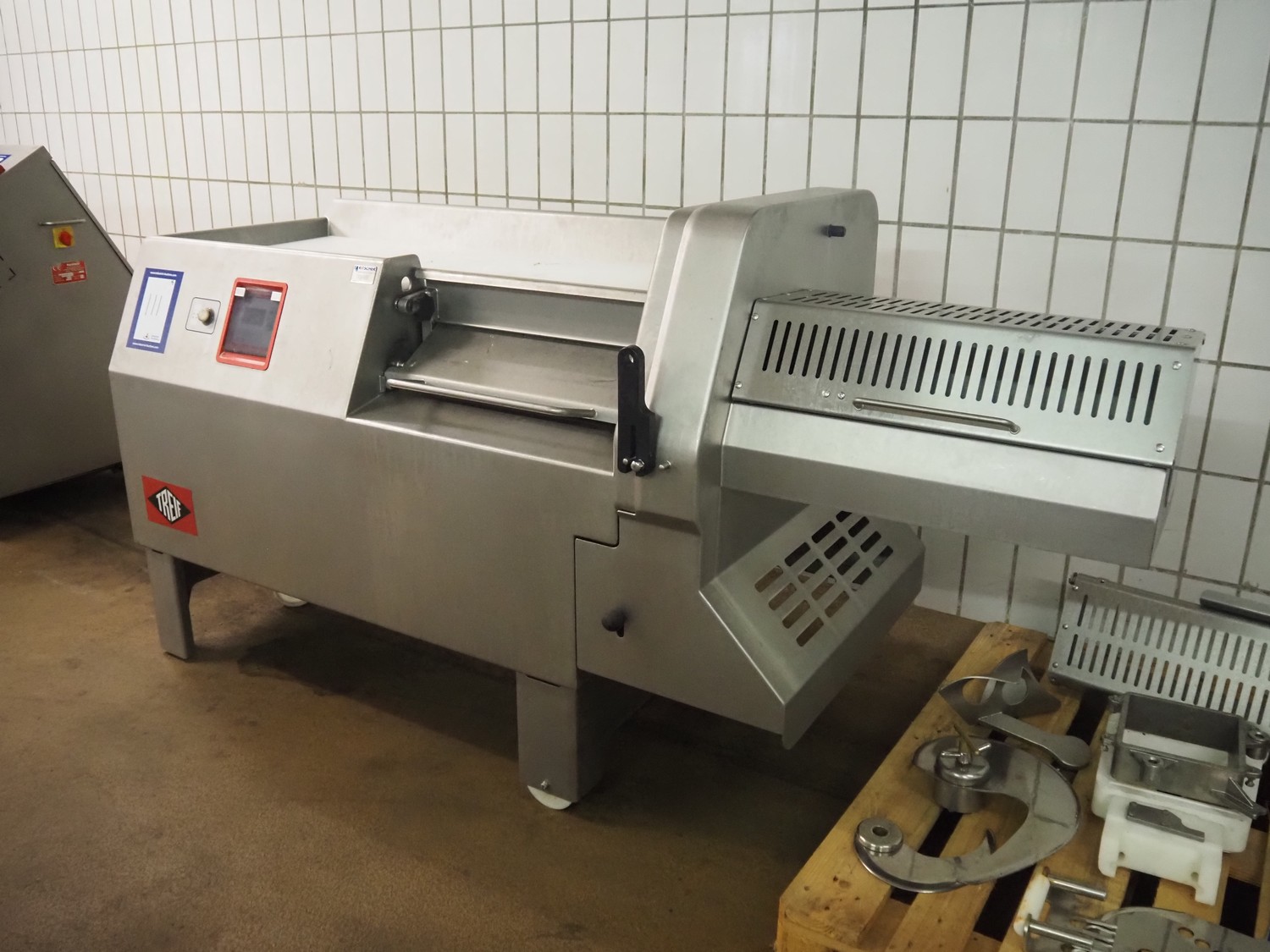 Treif Maschinenbau GmbH mobile dicer, model: HUSKY E, machine number: 471001.70021.101366, year of construction: 2006, 380/480 V, 3 Ph, 50/60 Hz, 16 A, 2 kW, weight: 389 kg, dimensions chamber: 95 mm x 95 mm, total dimensions: 2260 mm x 850 mm x 1200 mm. Including pallet with parts.