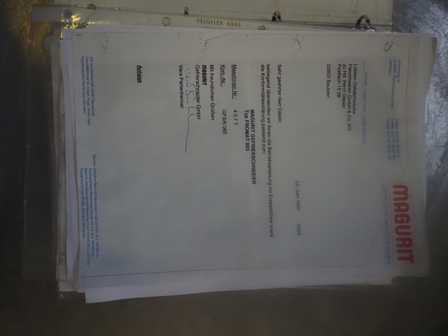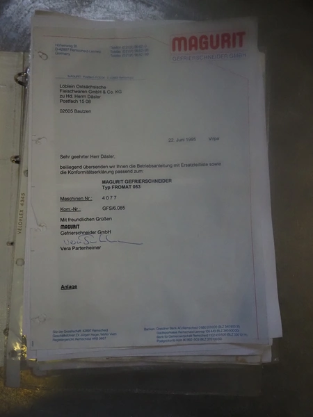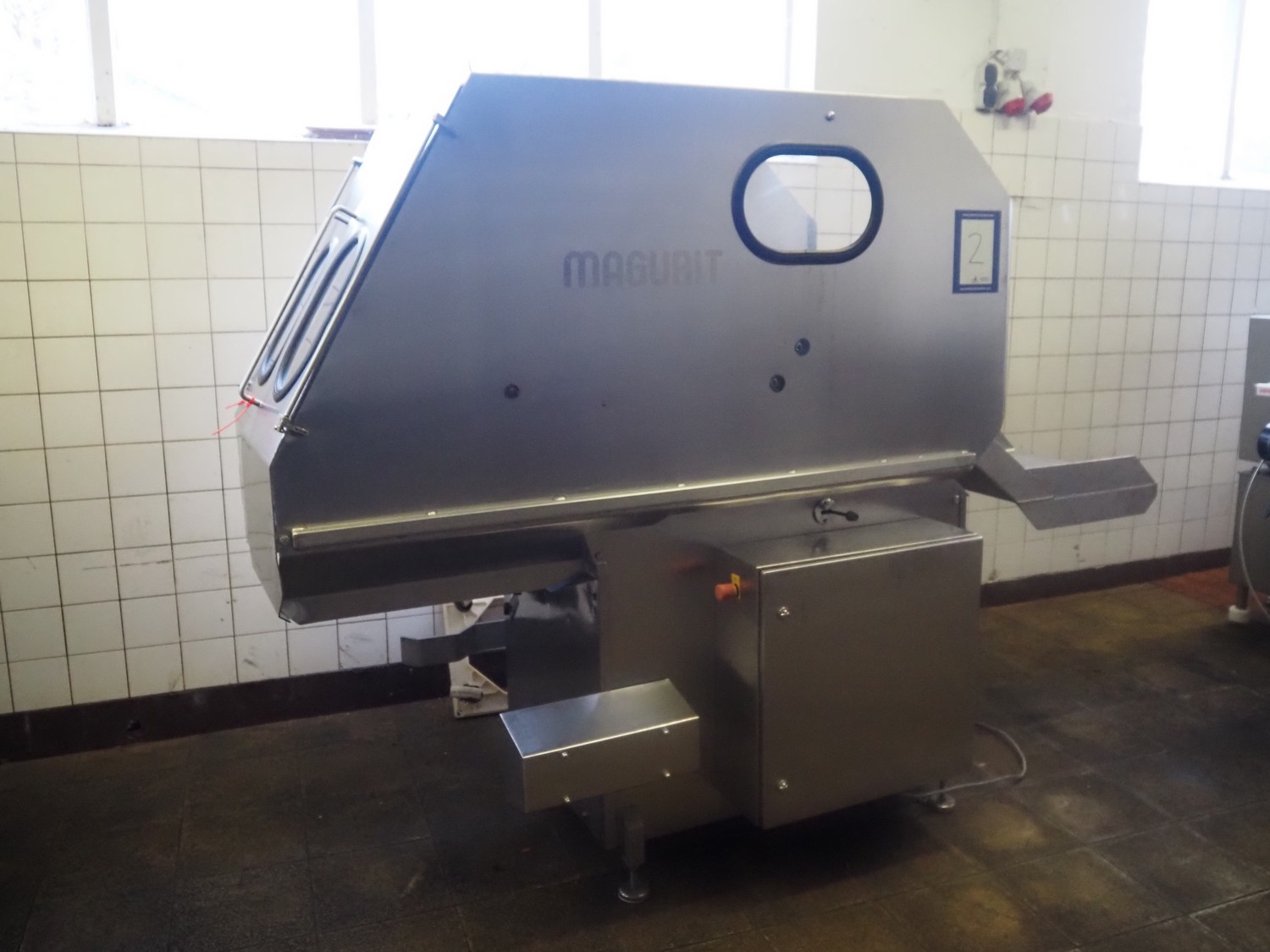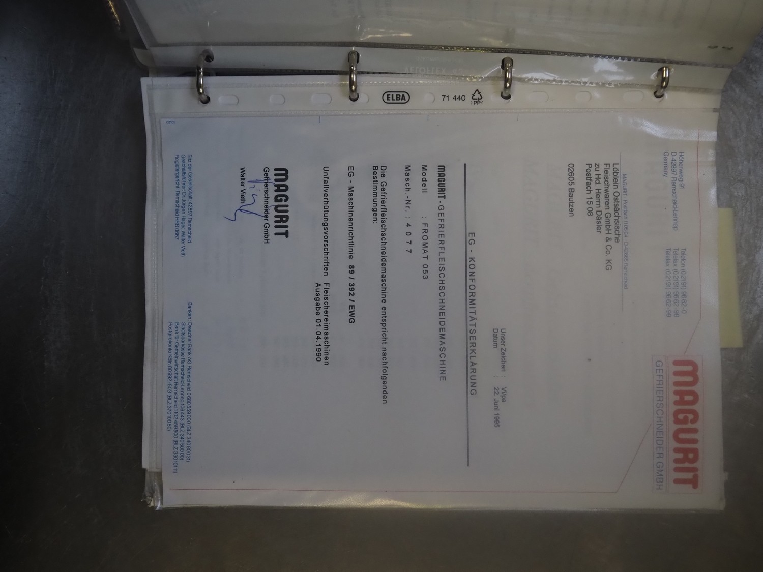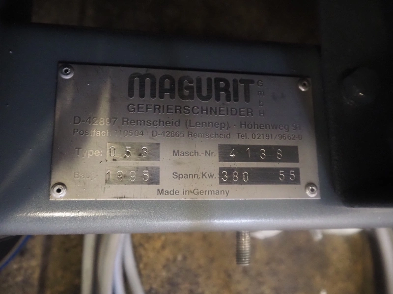Magurit GmbH frozen block cutter, type: 053, machine number: 4138, year of construction: 1995, 380 V, 55 kW, working width: 500 mm, total dimensions: 2500 mm x 1050 mm x 1800 mm.