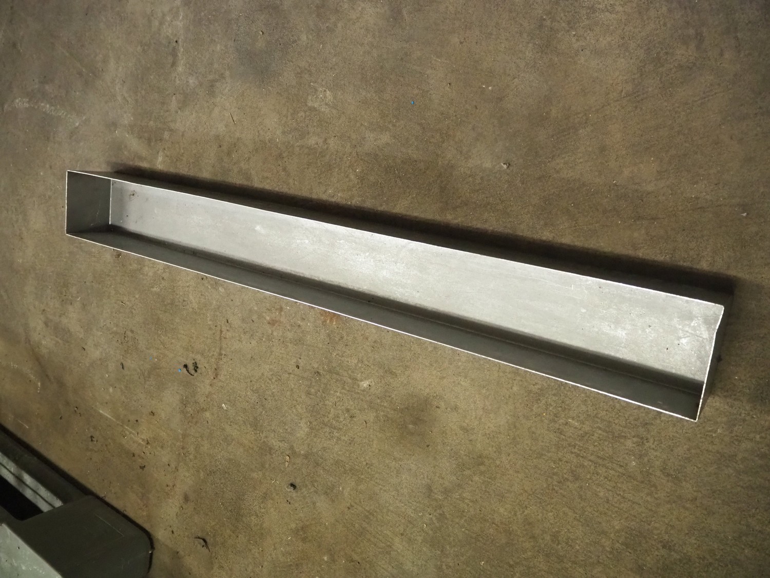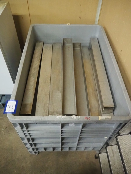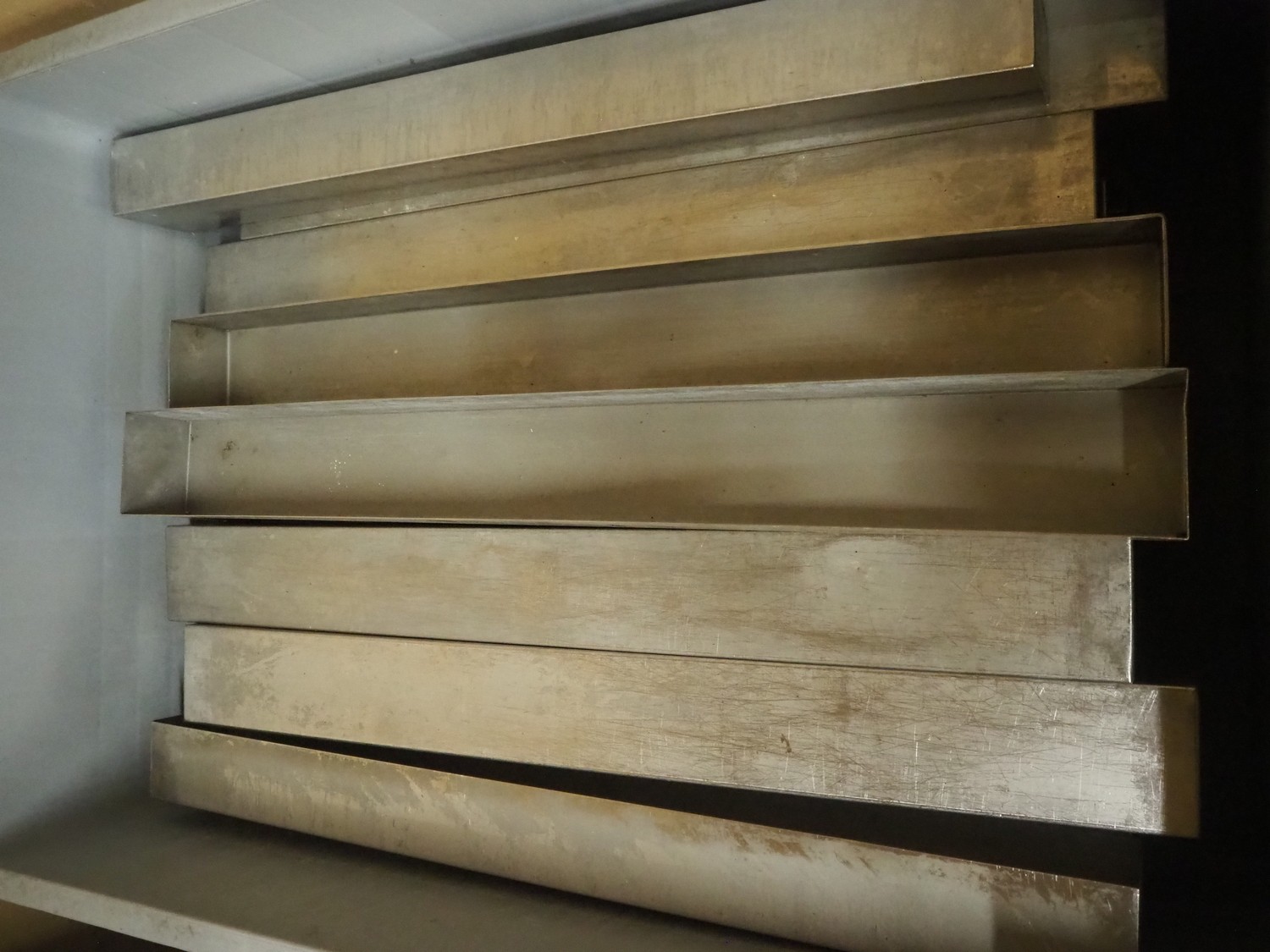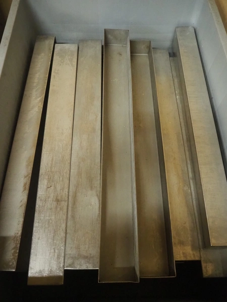 Plastic pallet box with 47 s/s forms used for liver cheese, dimensions each form: 930 mm x 100 mm x 80 mm.