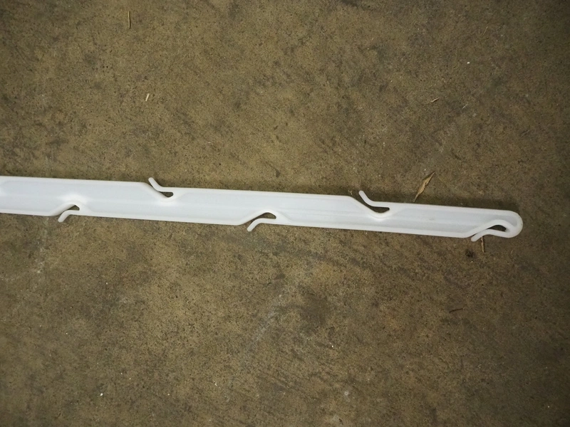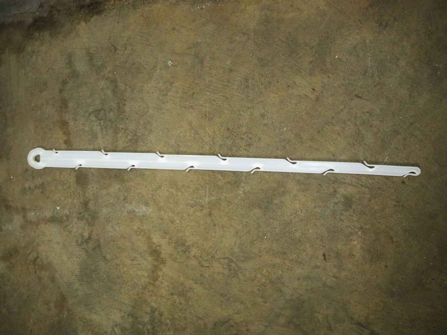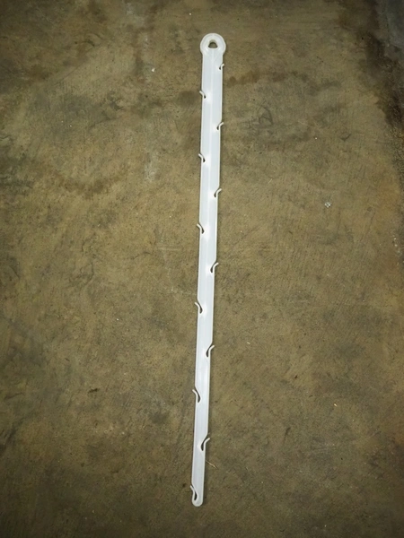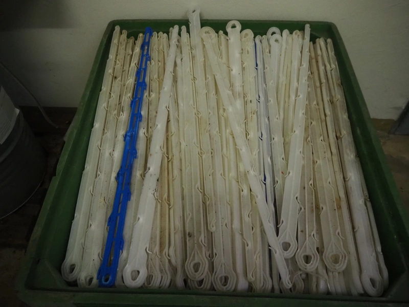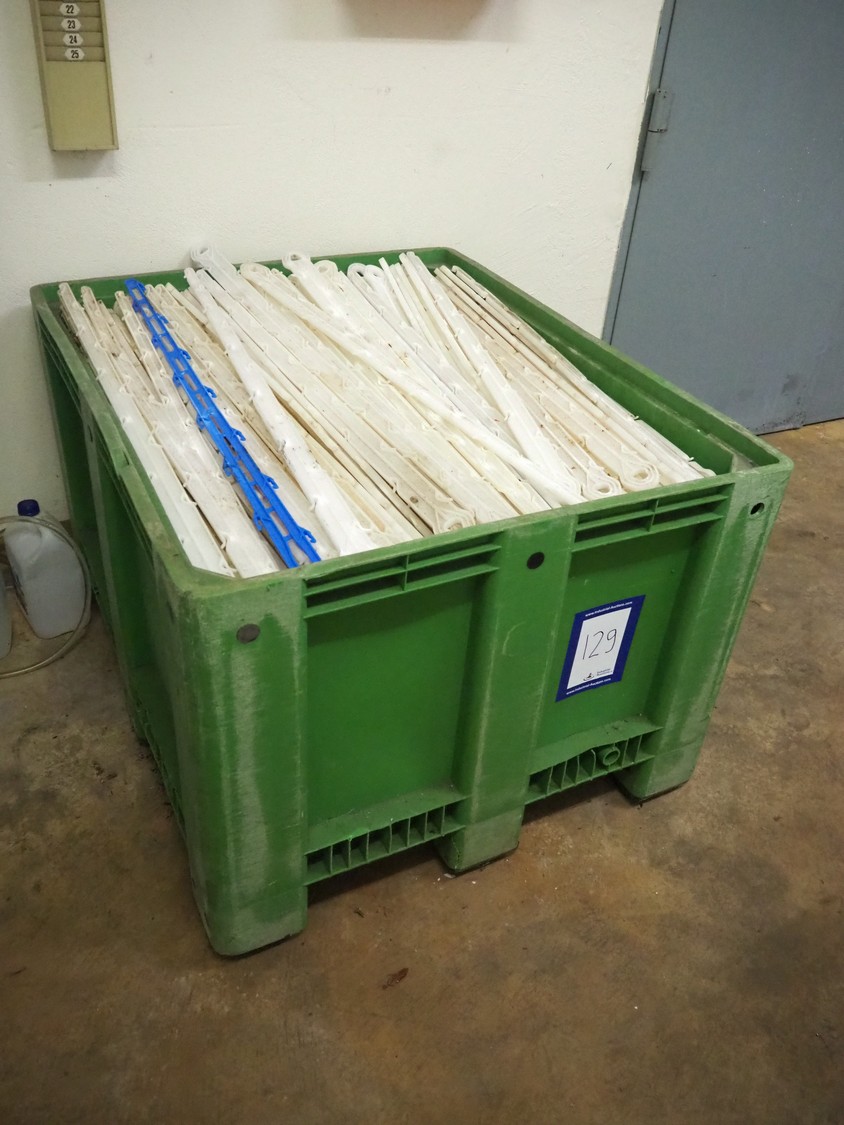 Pallet box with large amount of plastic hooks, hook length: 1040 mm, total dimensions: 1200 mm x 1000 mm x 760 mm.