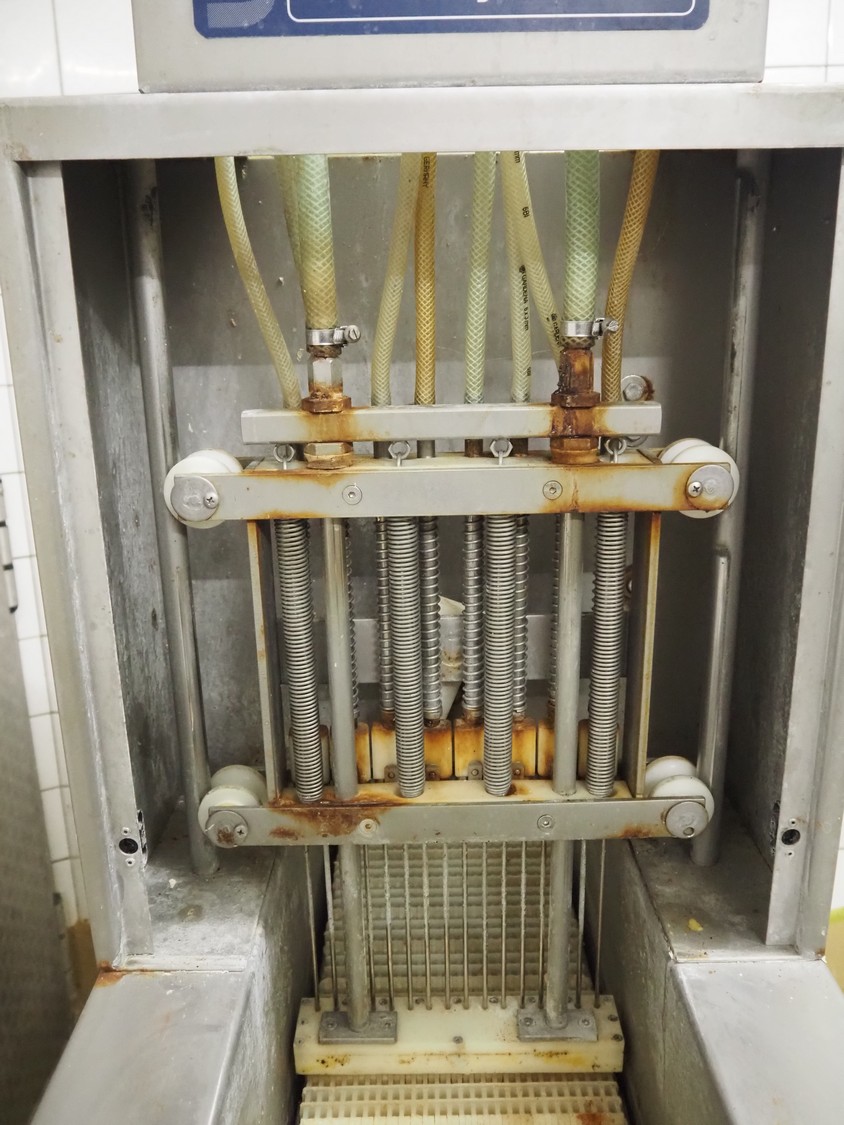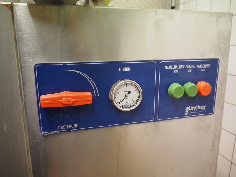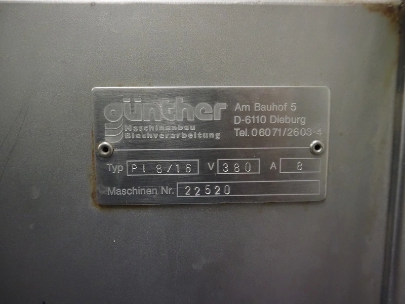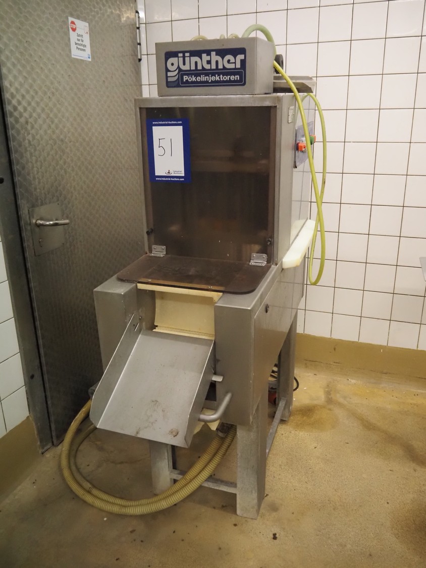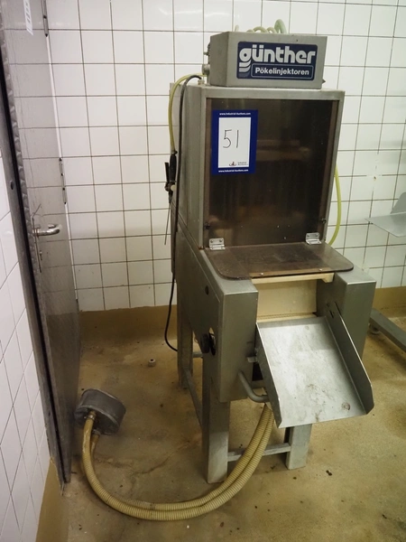 Günther injector, type: PI8/16, machine number: 22520, 380 V, 8 A, plastic mesh belt, belt width: 240 mm, 16 needles, total dimensions: 1350 mm x 450 mm x 1650 mm.