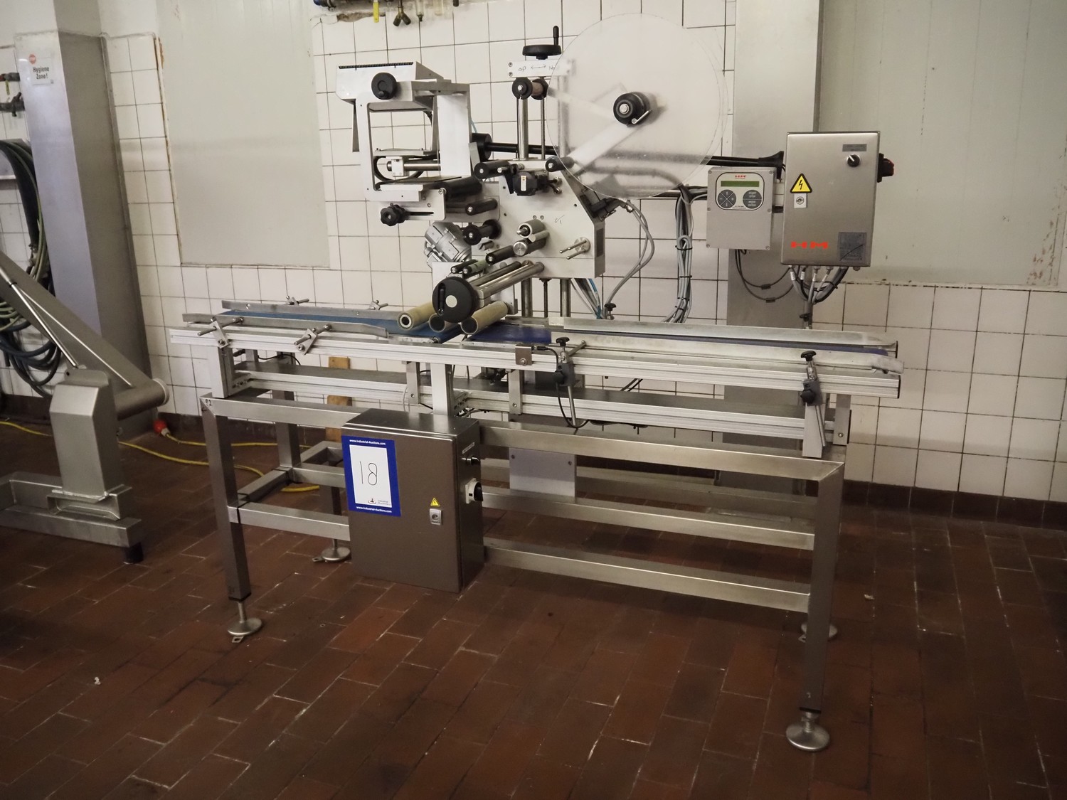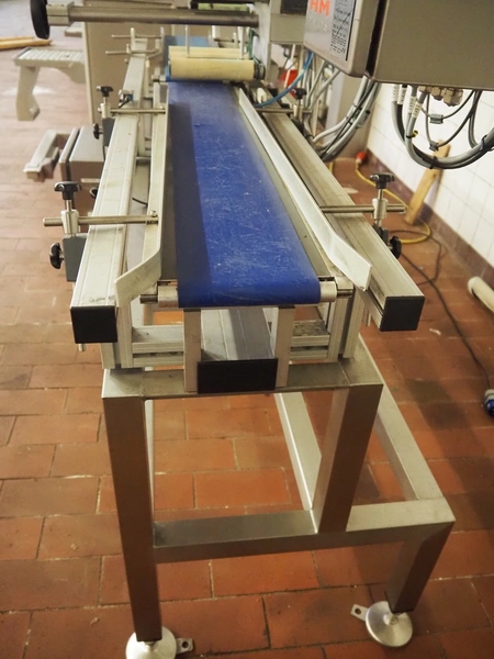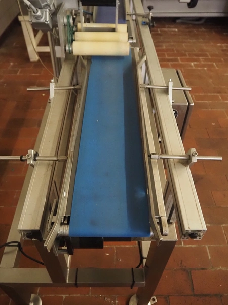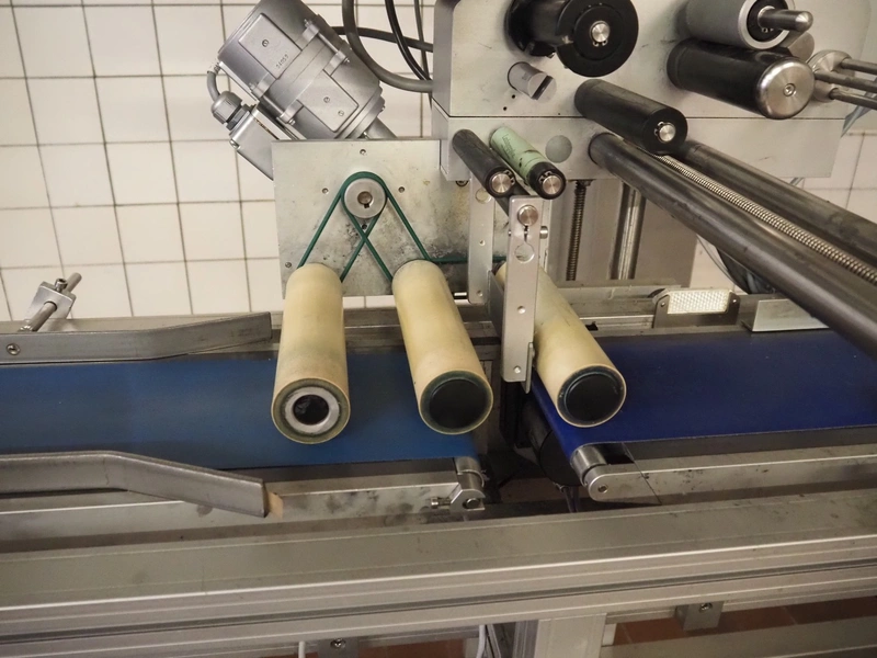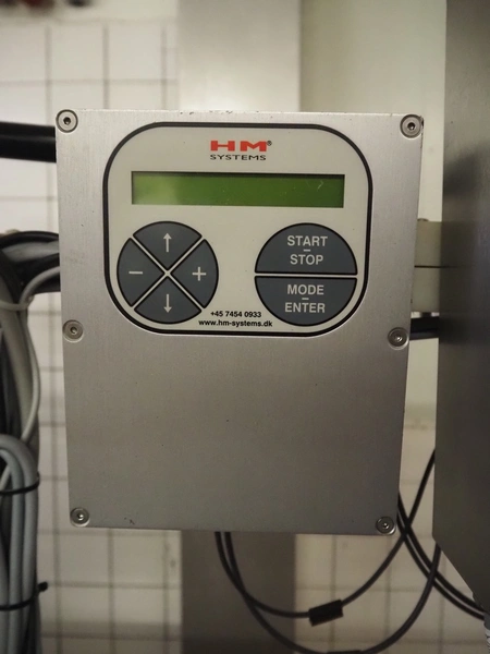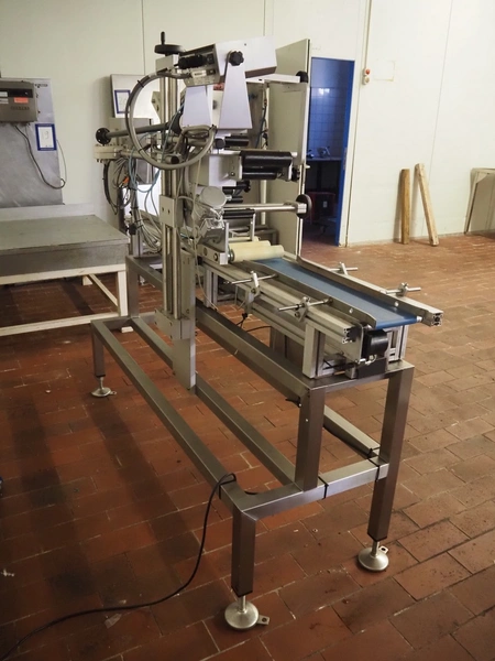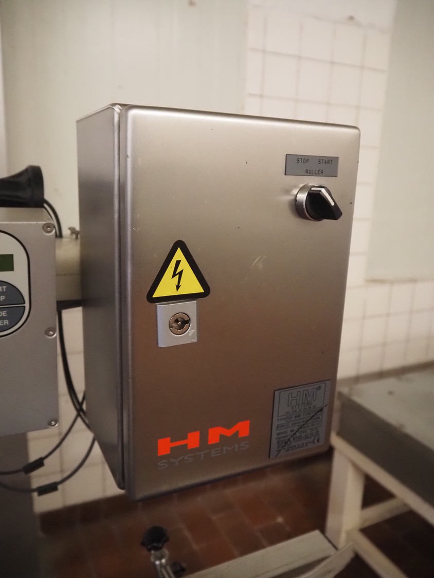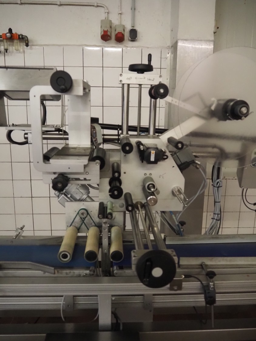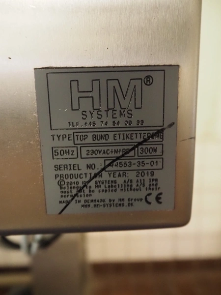 Teltek / HM Systems labelling machine, type: top bund etikettering, serial number: 44553-35-01, year of construction: 2019, 230 V, 50 Hz, 300 W, plastic belt, belt width: 145 mm, total dimensions: 1900 mm x 750 mm x 1750 mm.